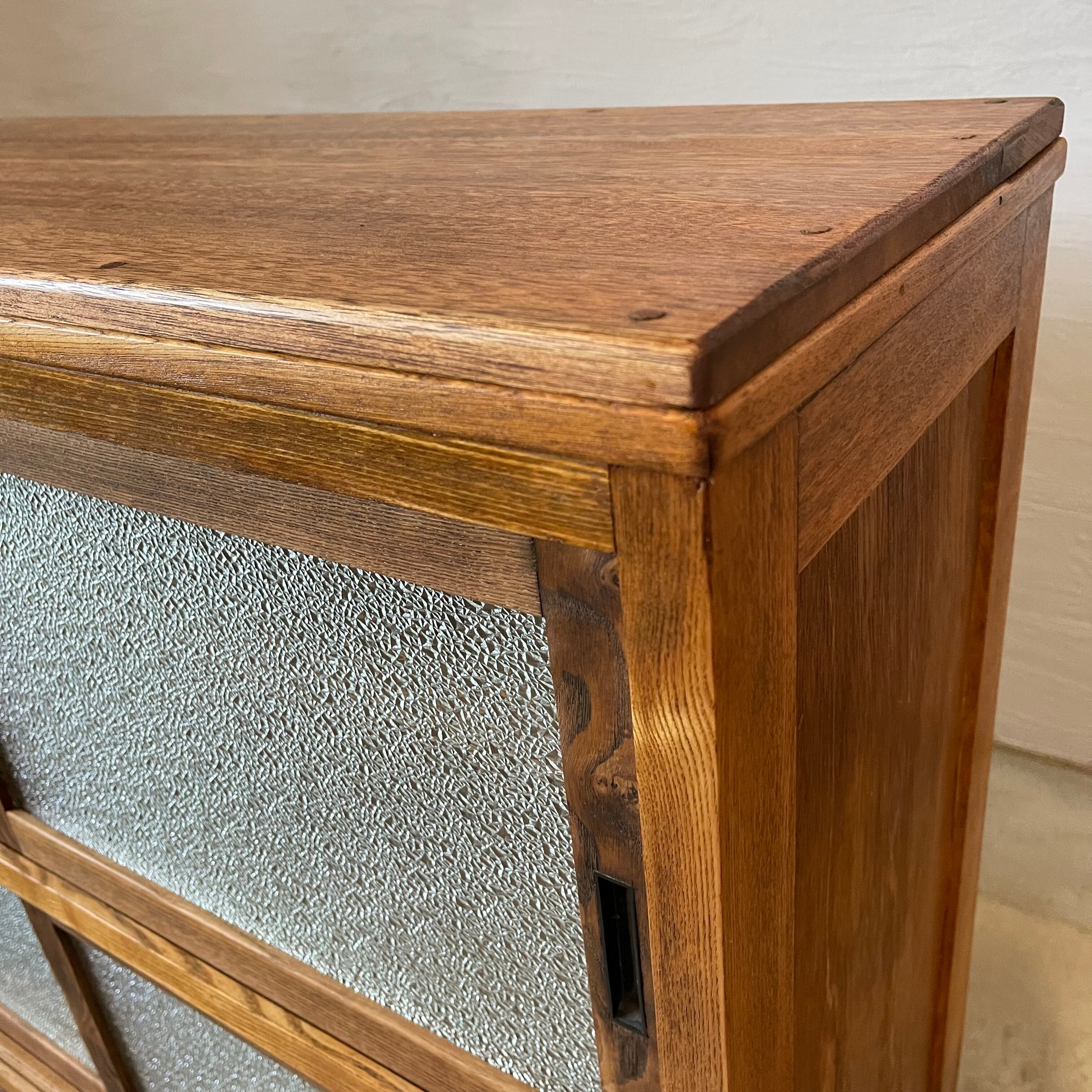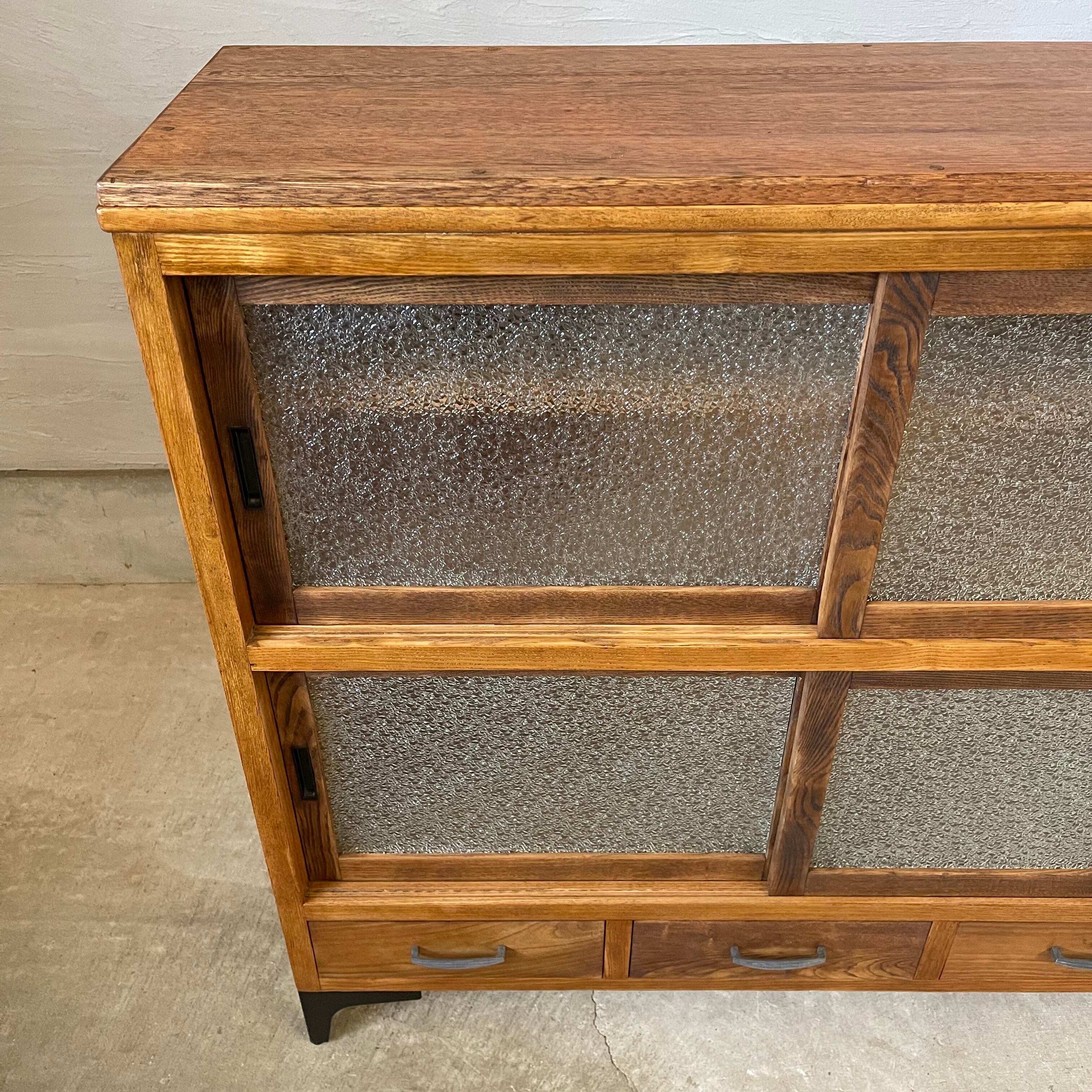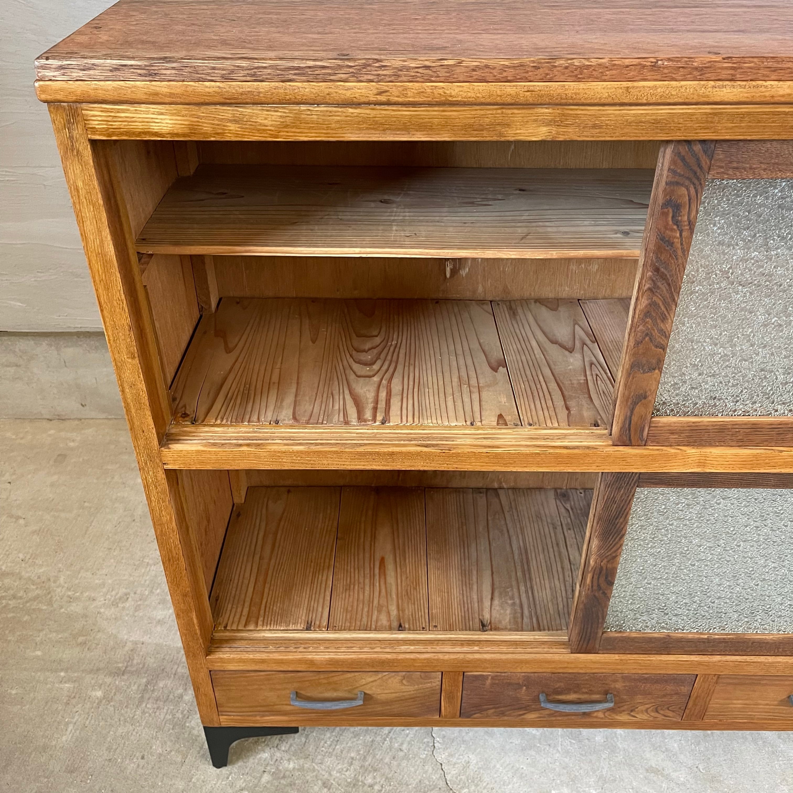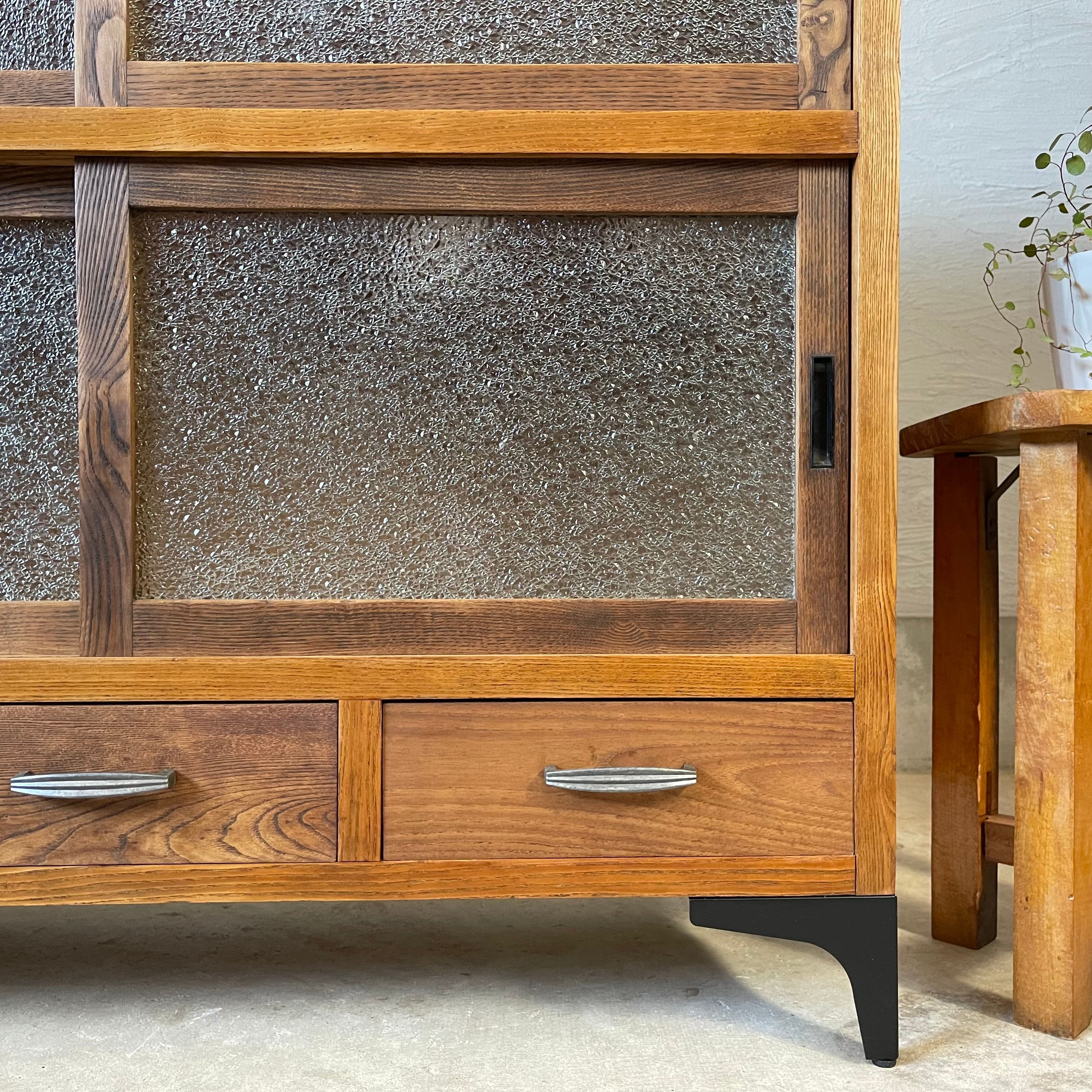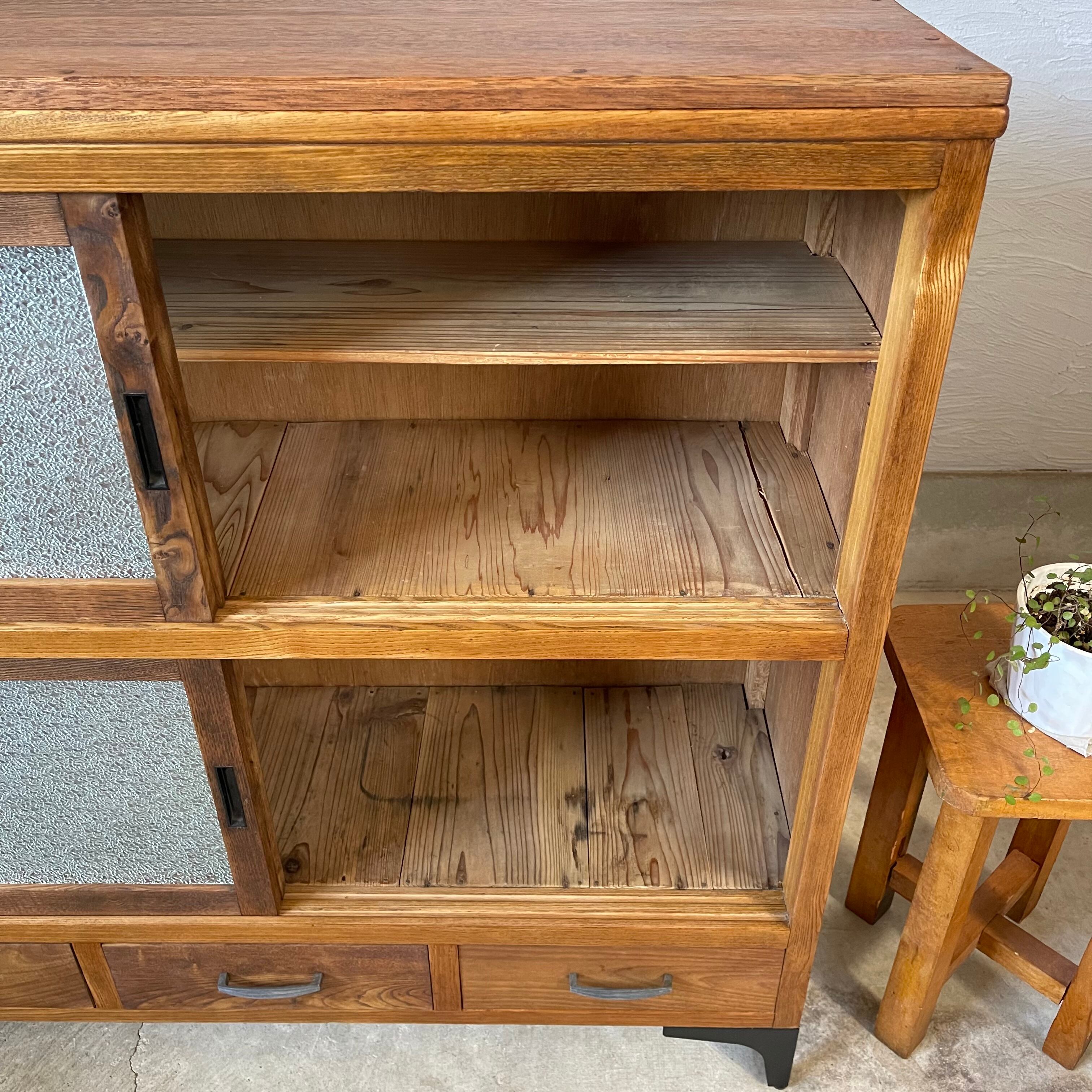 温かみのある経年変化とすっきりとしたアイアン脚が美しいダイヤガラスの食器棚です。