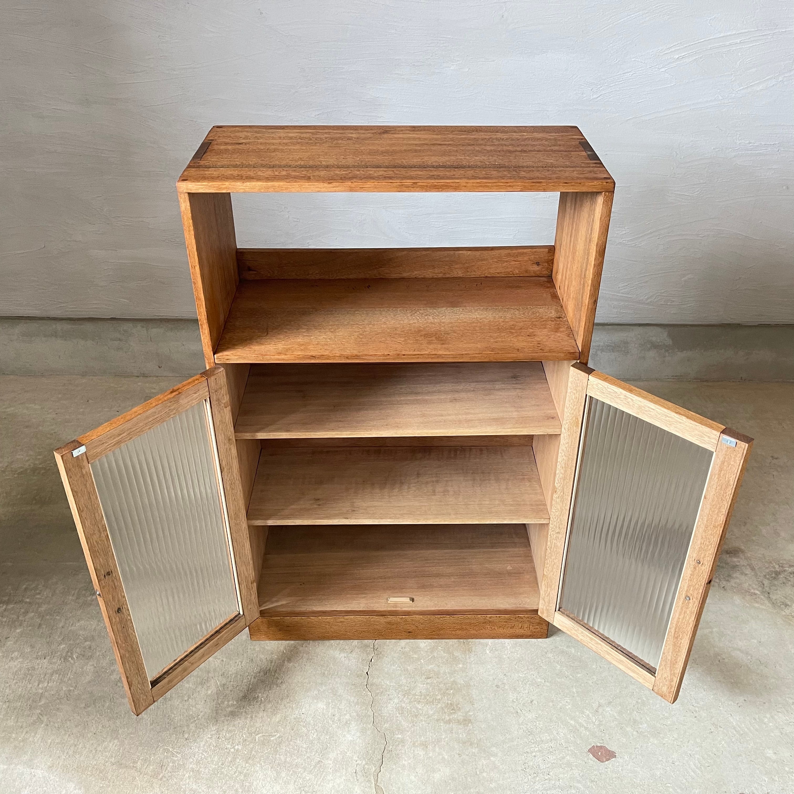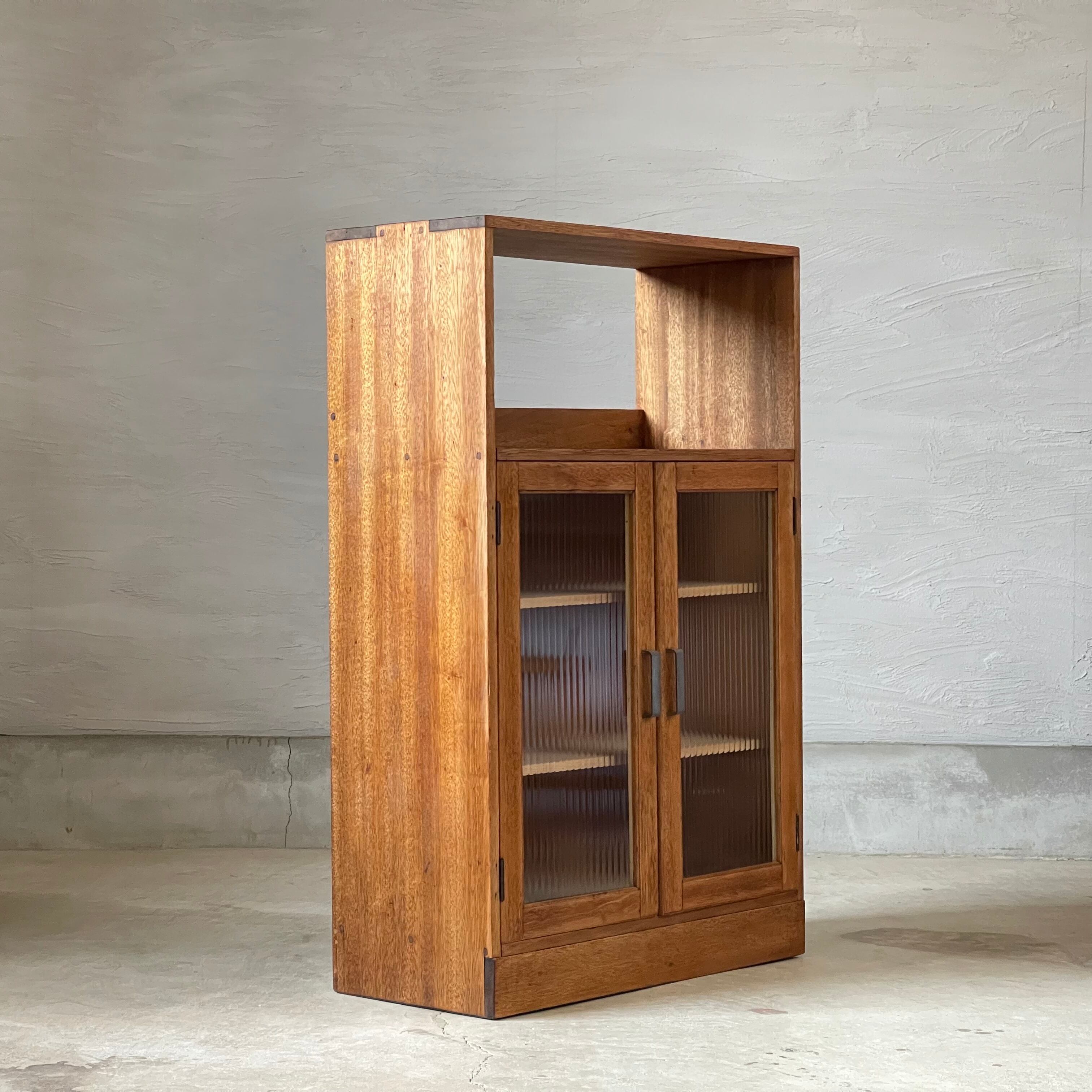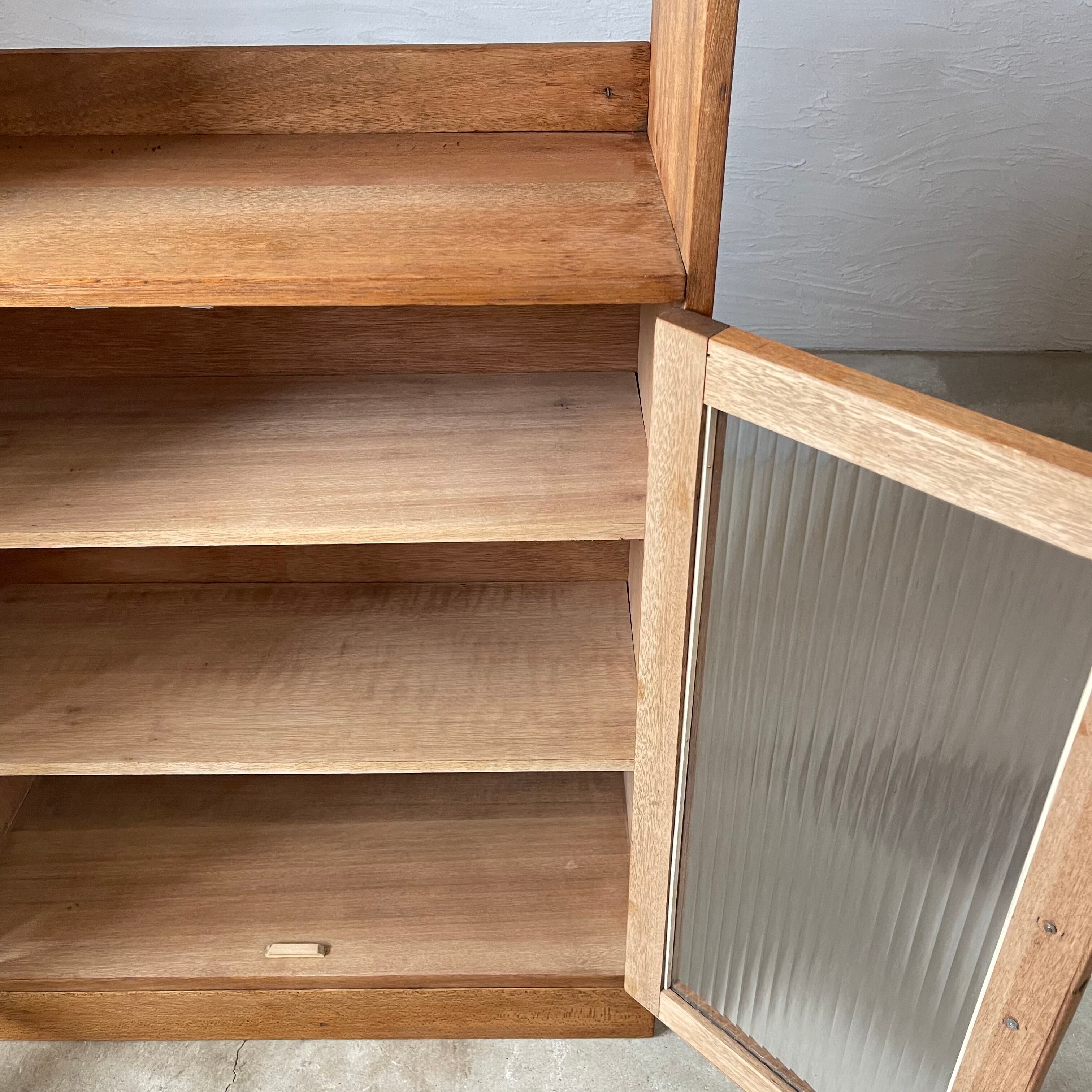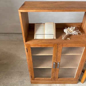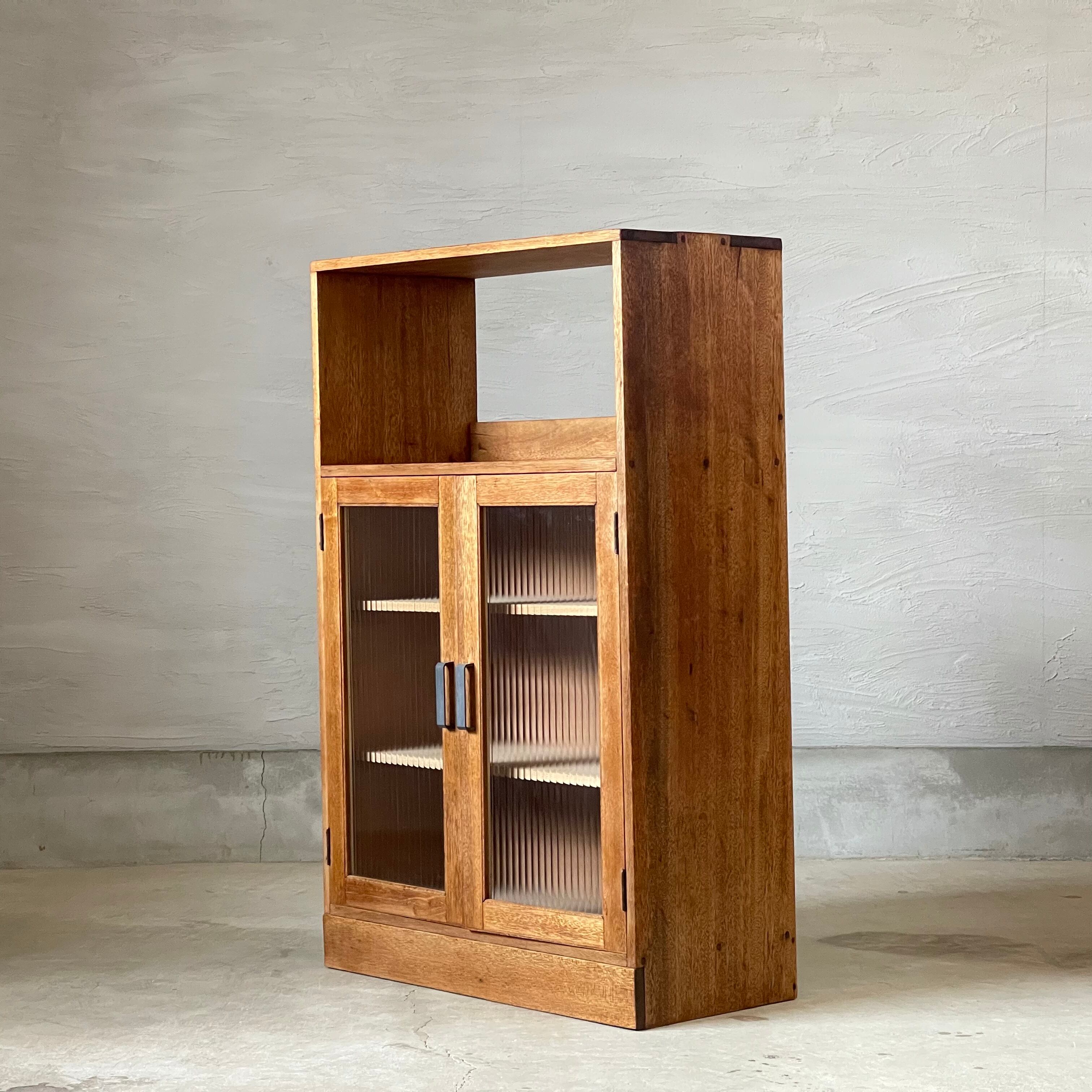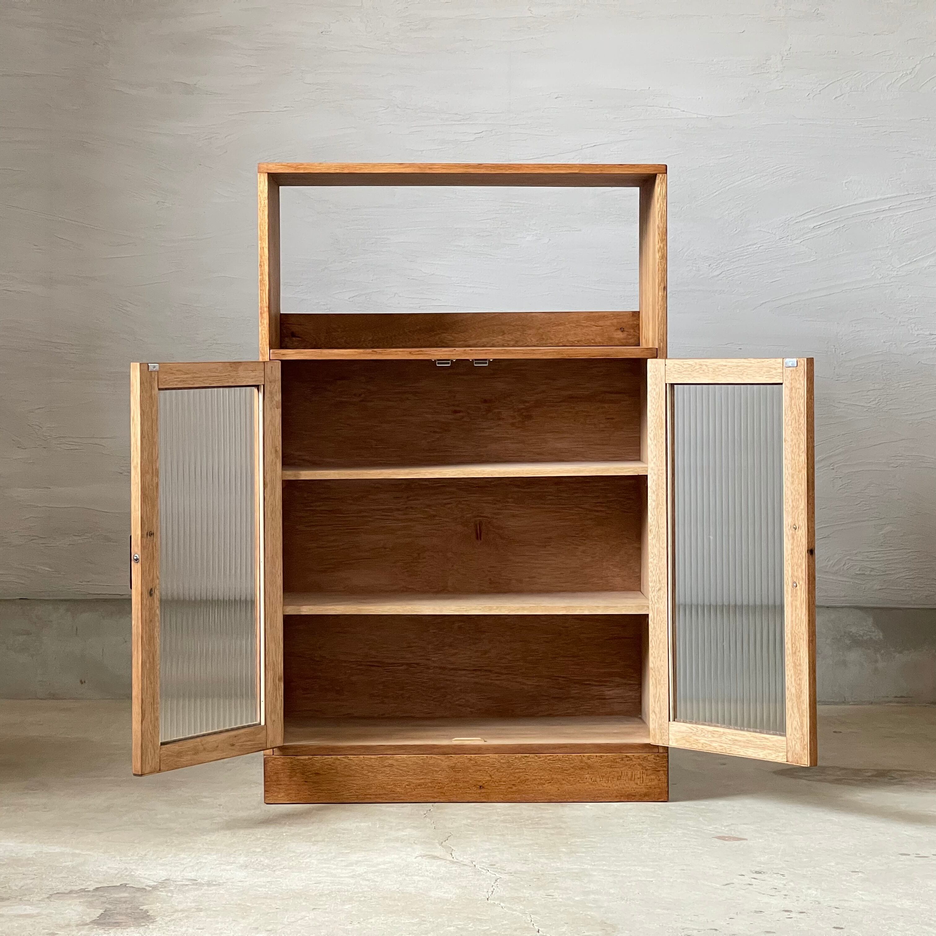 無垢材のナチュラルな木味ときらきらと光を反射するモールガラスの扉が美しいキャビネットです。