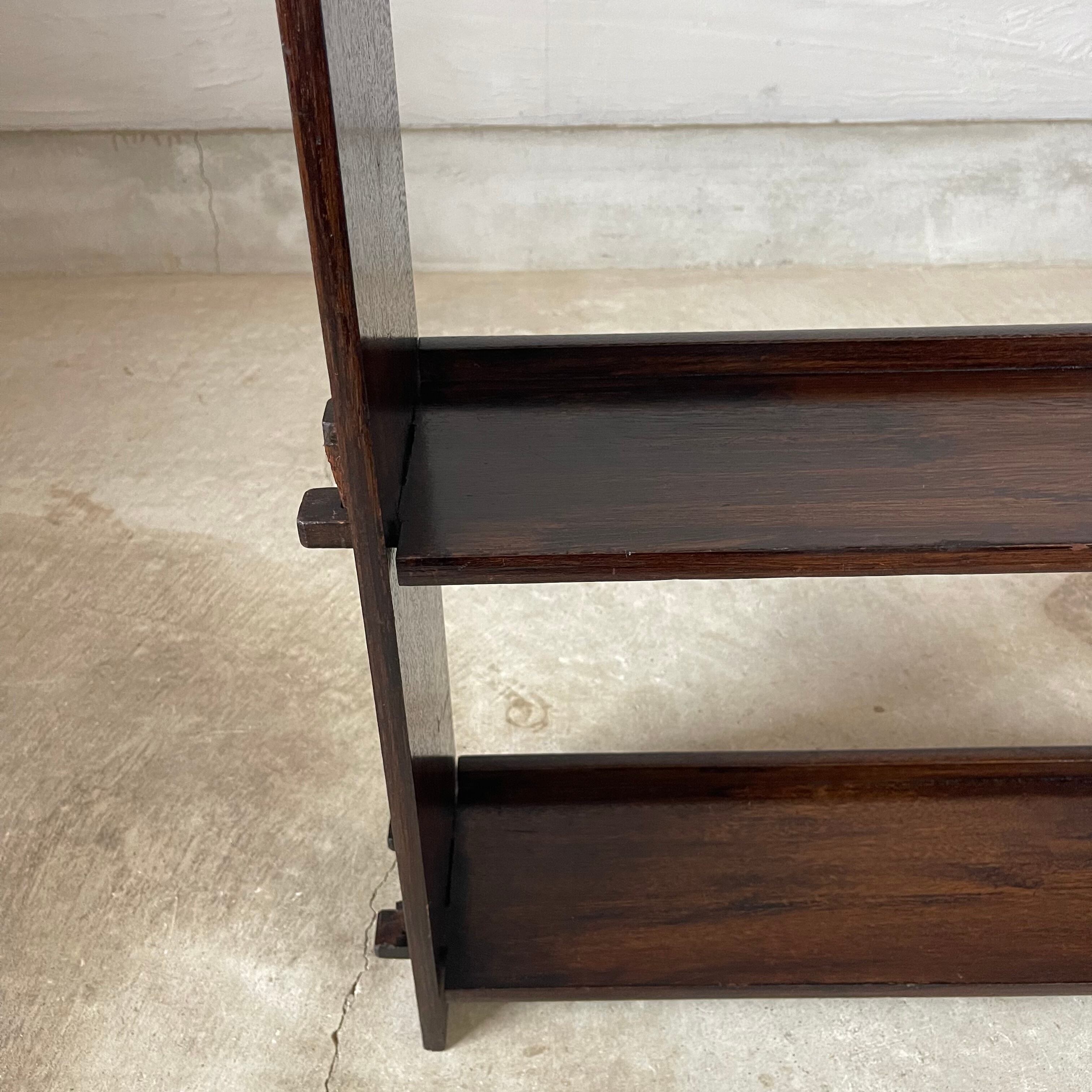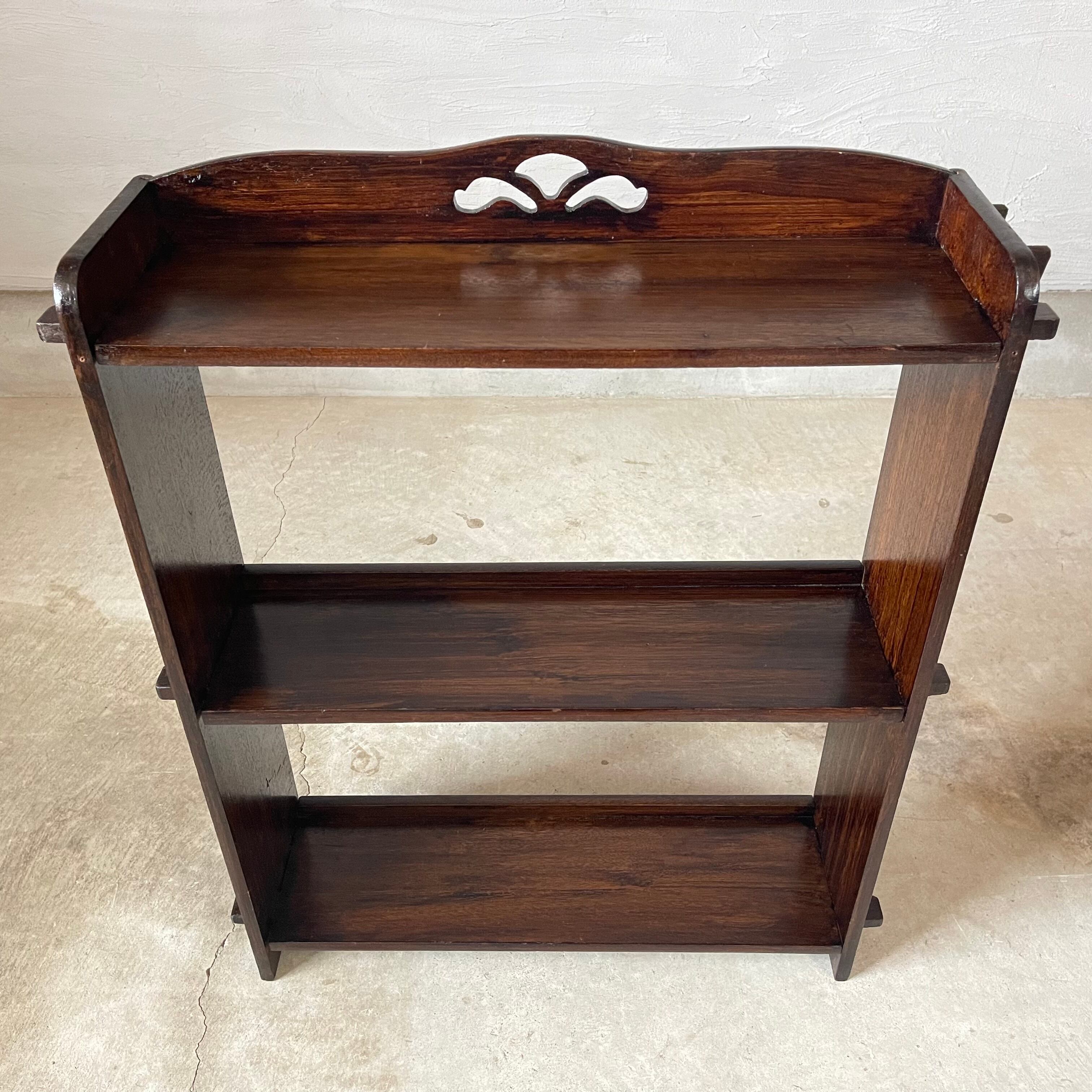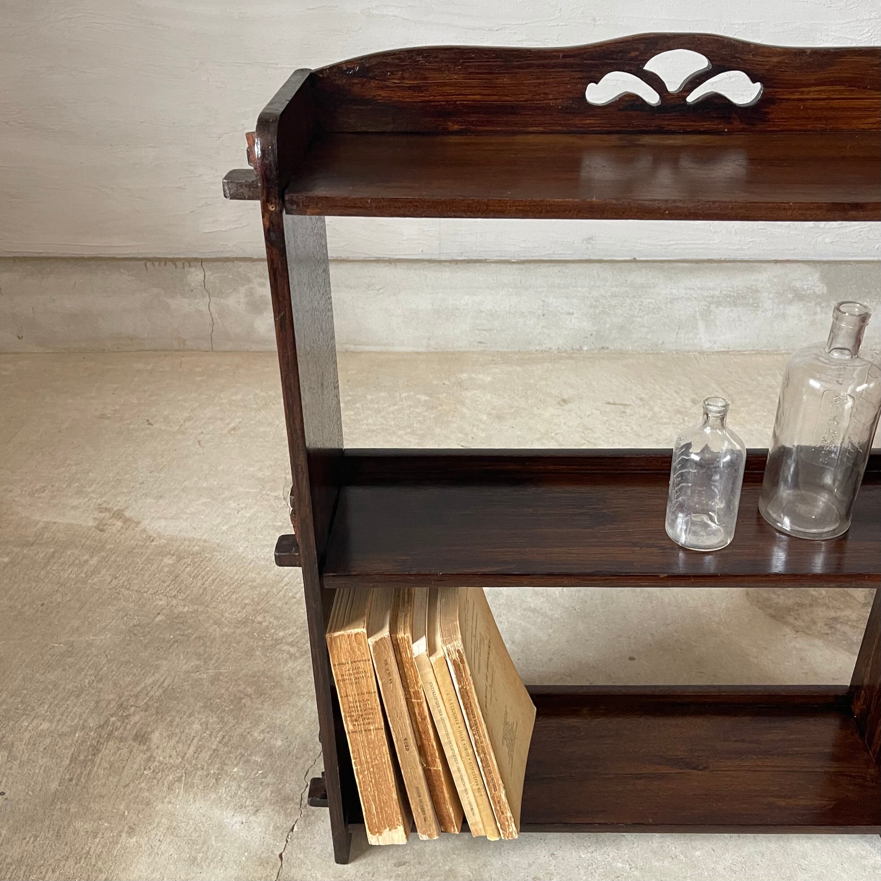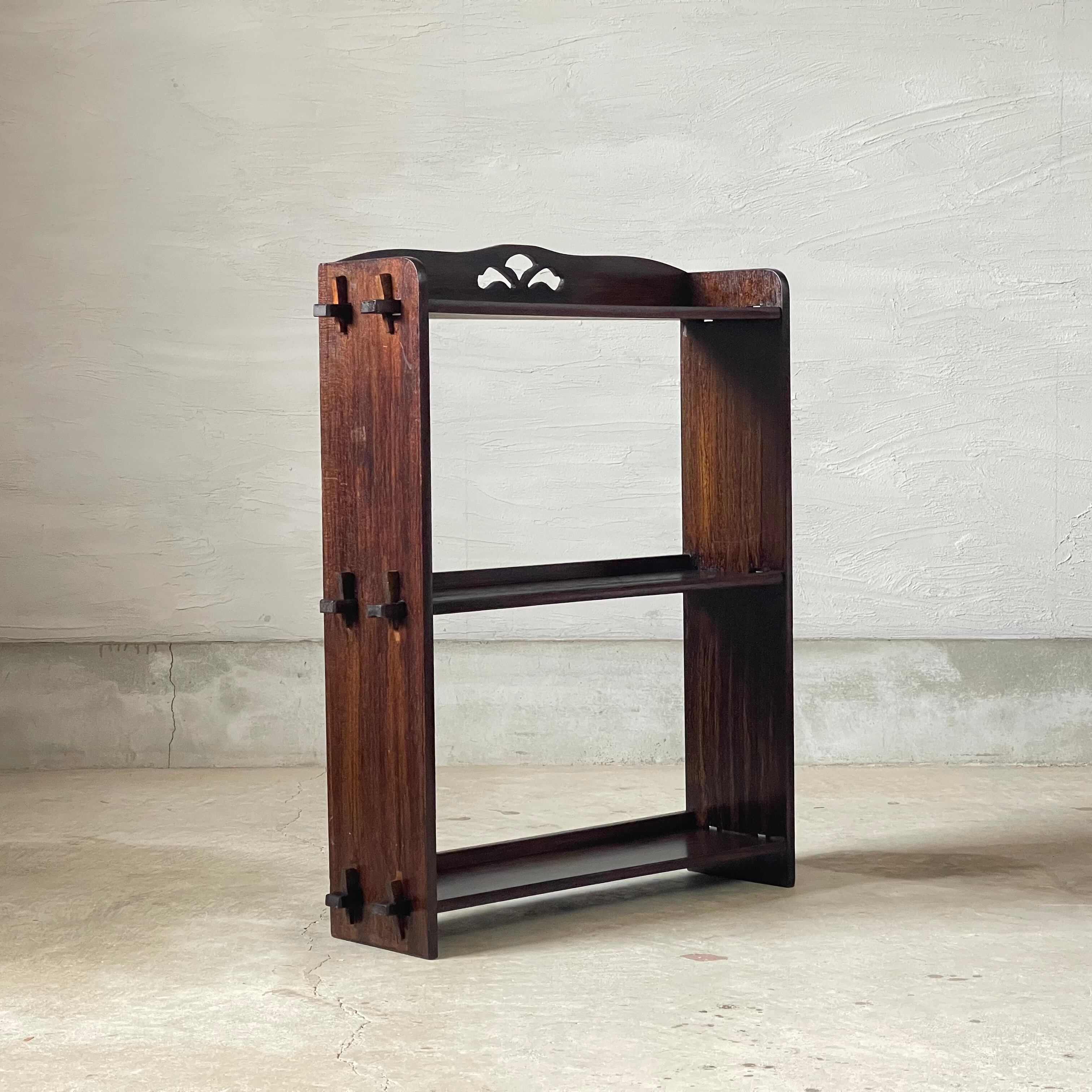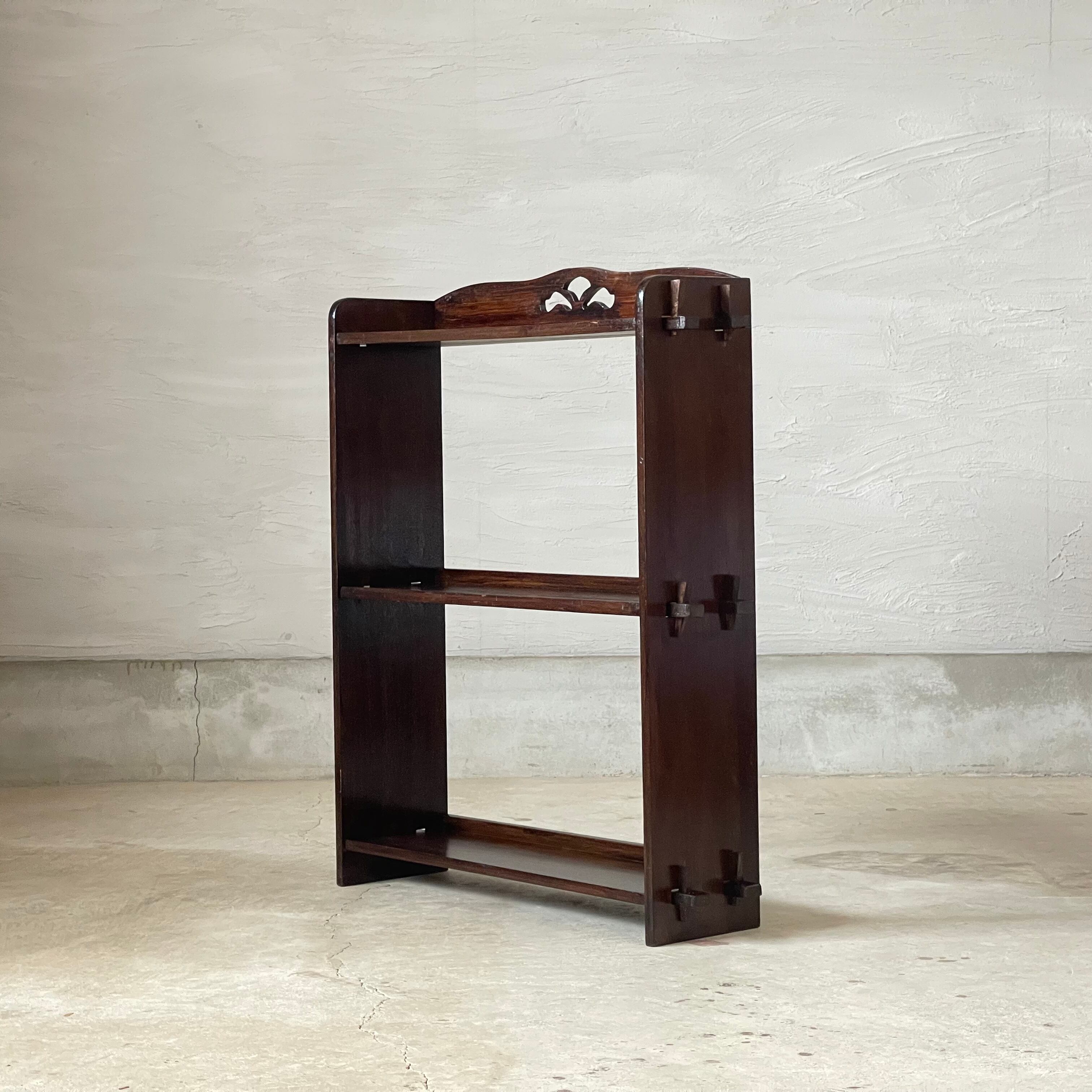無垢材の深みのある経年変化と背板の透し彫りが美しい3段のオープンラックです。