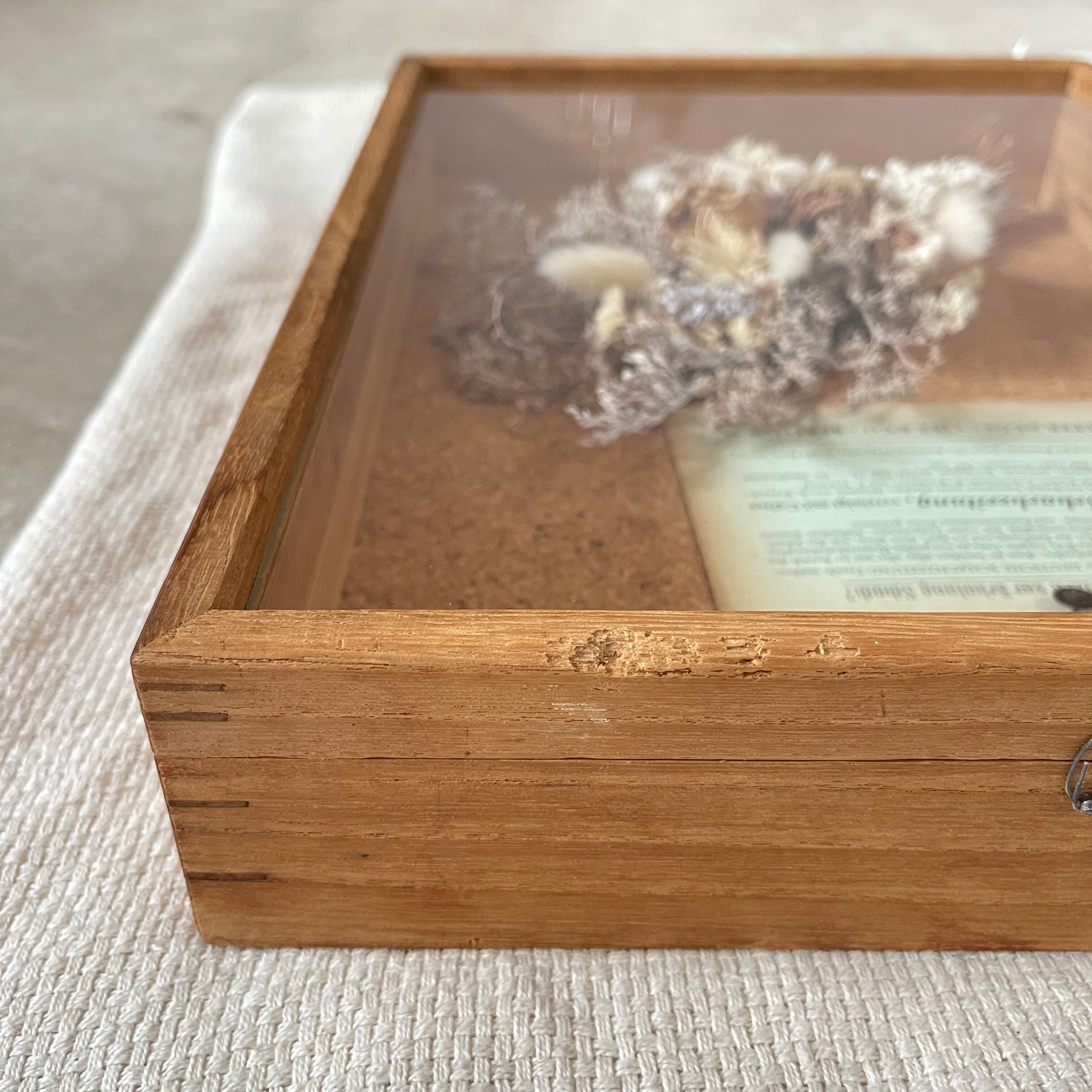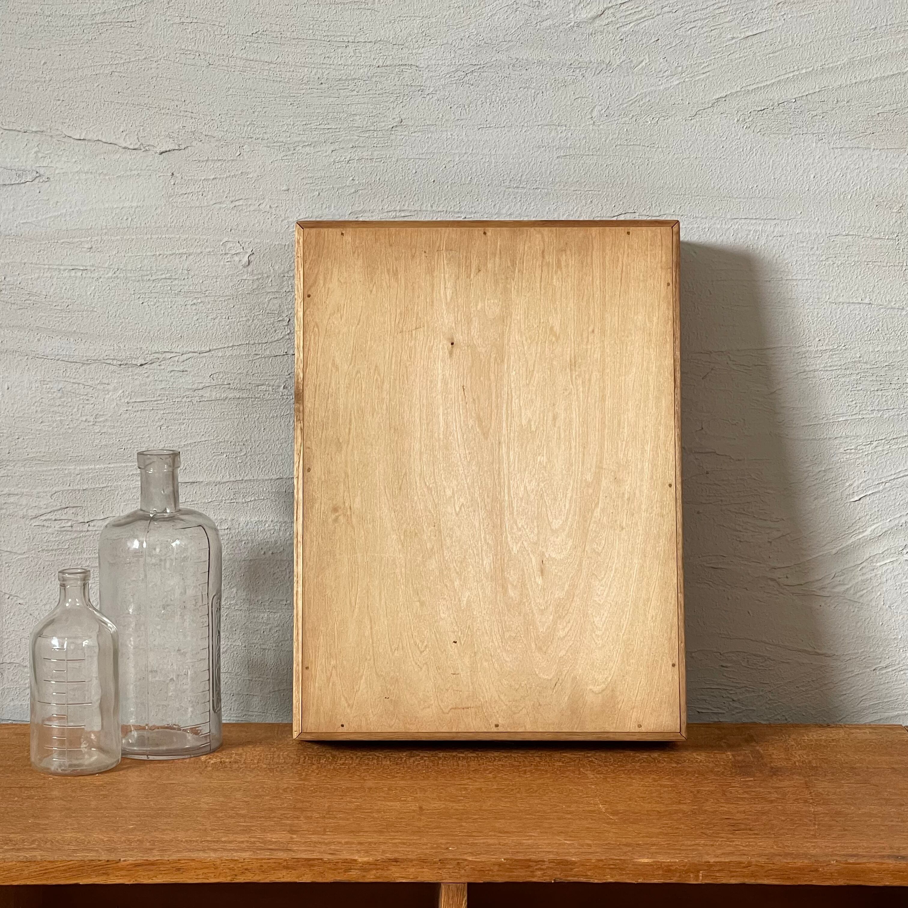 古い木材の枯れた雰囲気と木枠のガラス蓋が美しいガラスケースです。