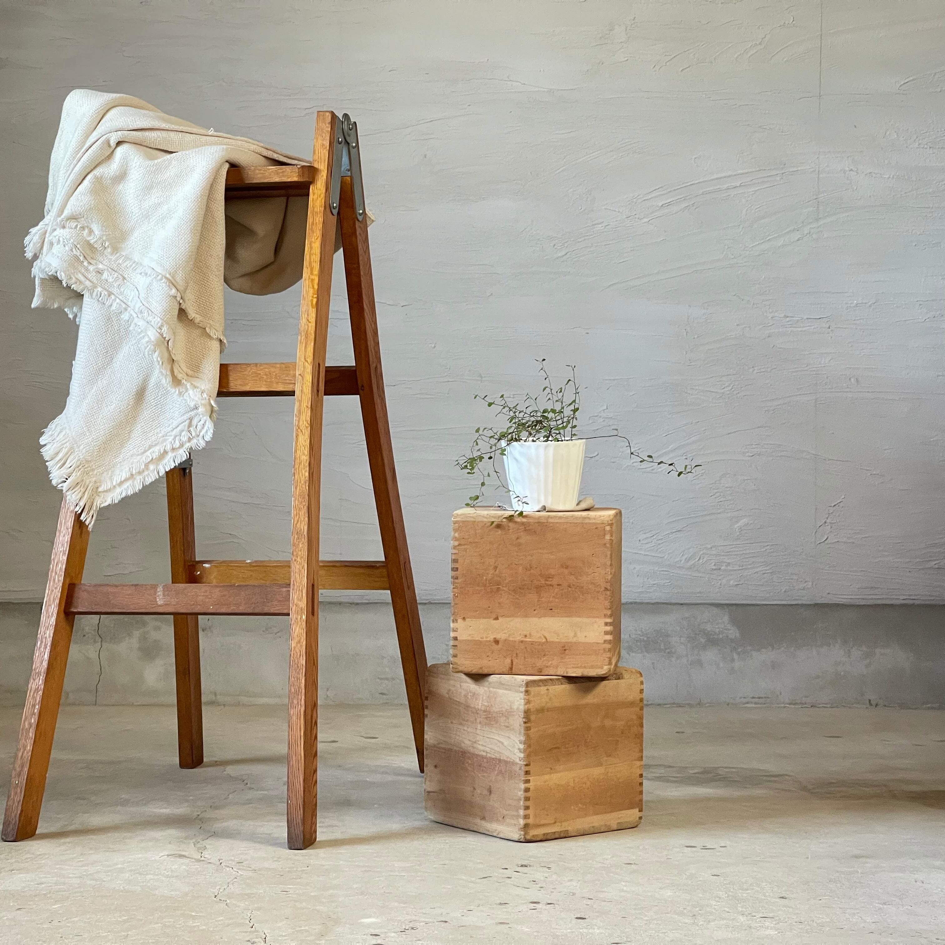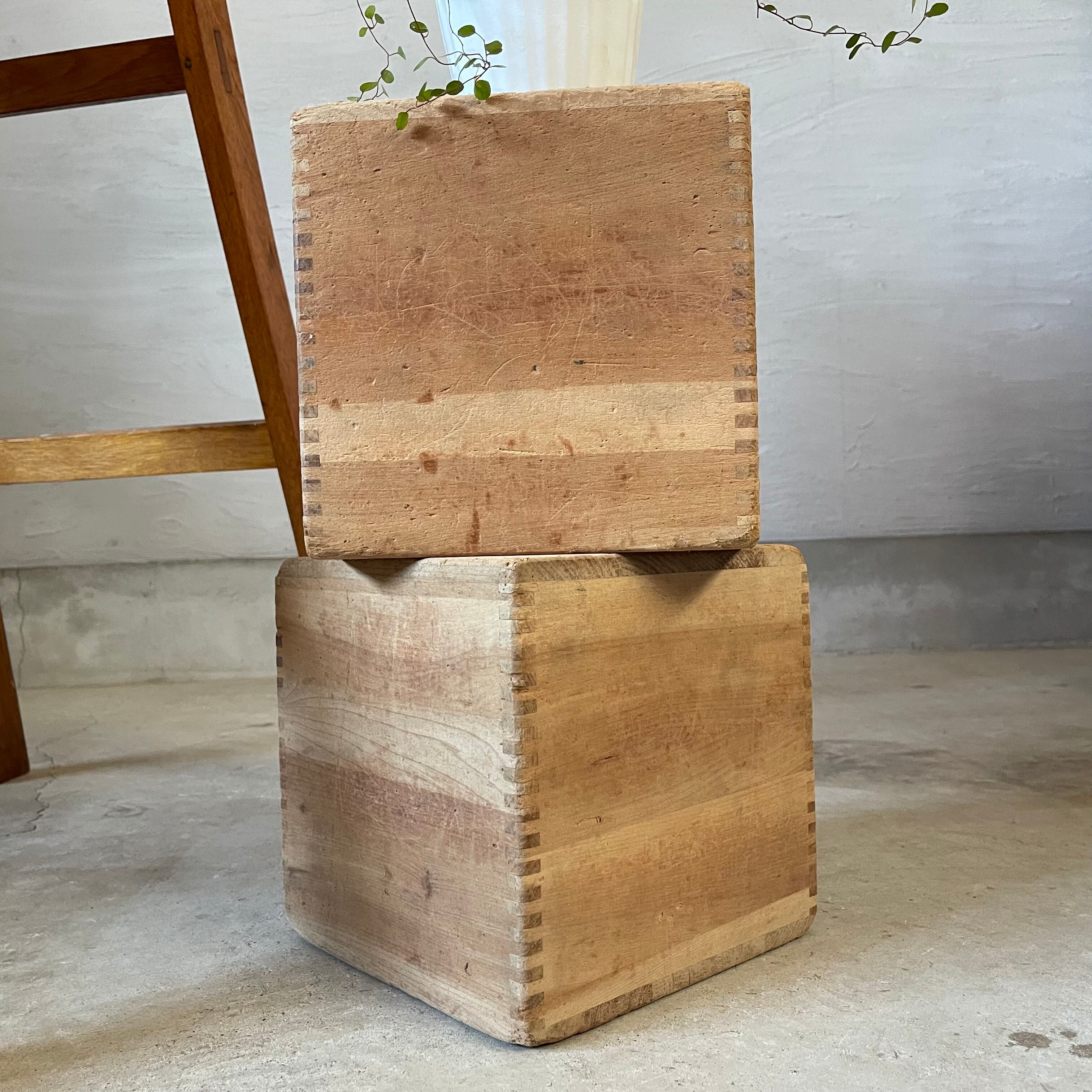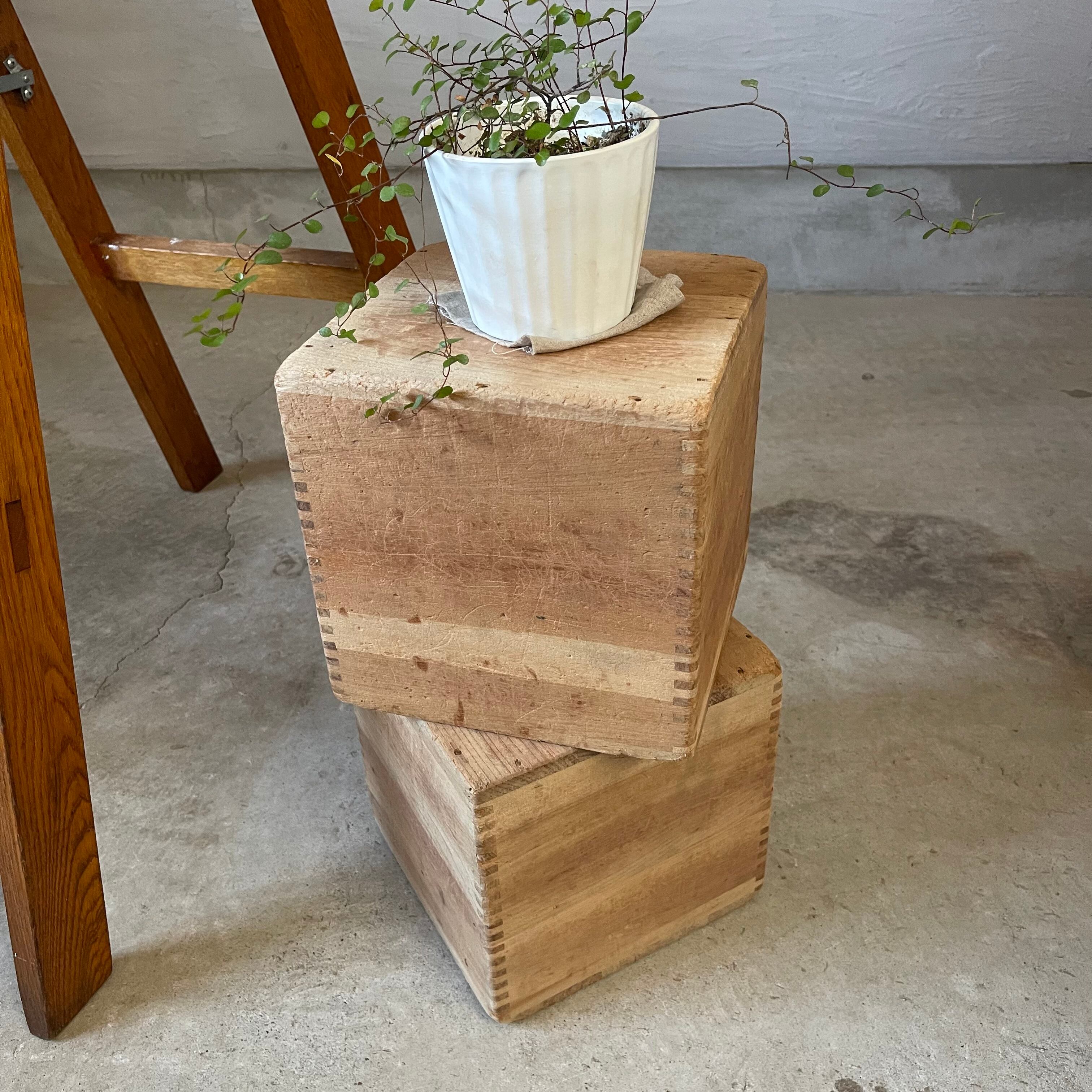 すっかり色の抜けた古木の質感とぴったりと組まれた木材の模様が美しい四角い木のオブジェです。
