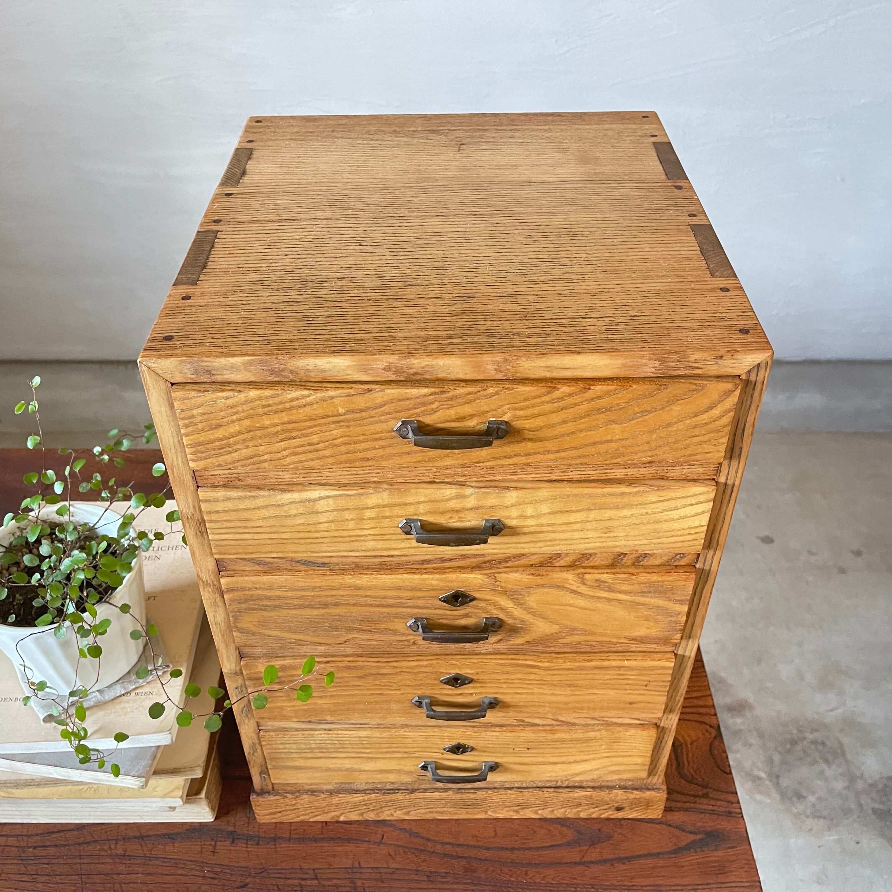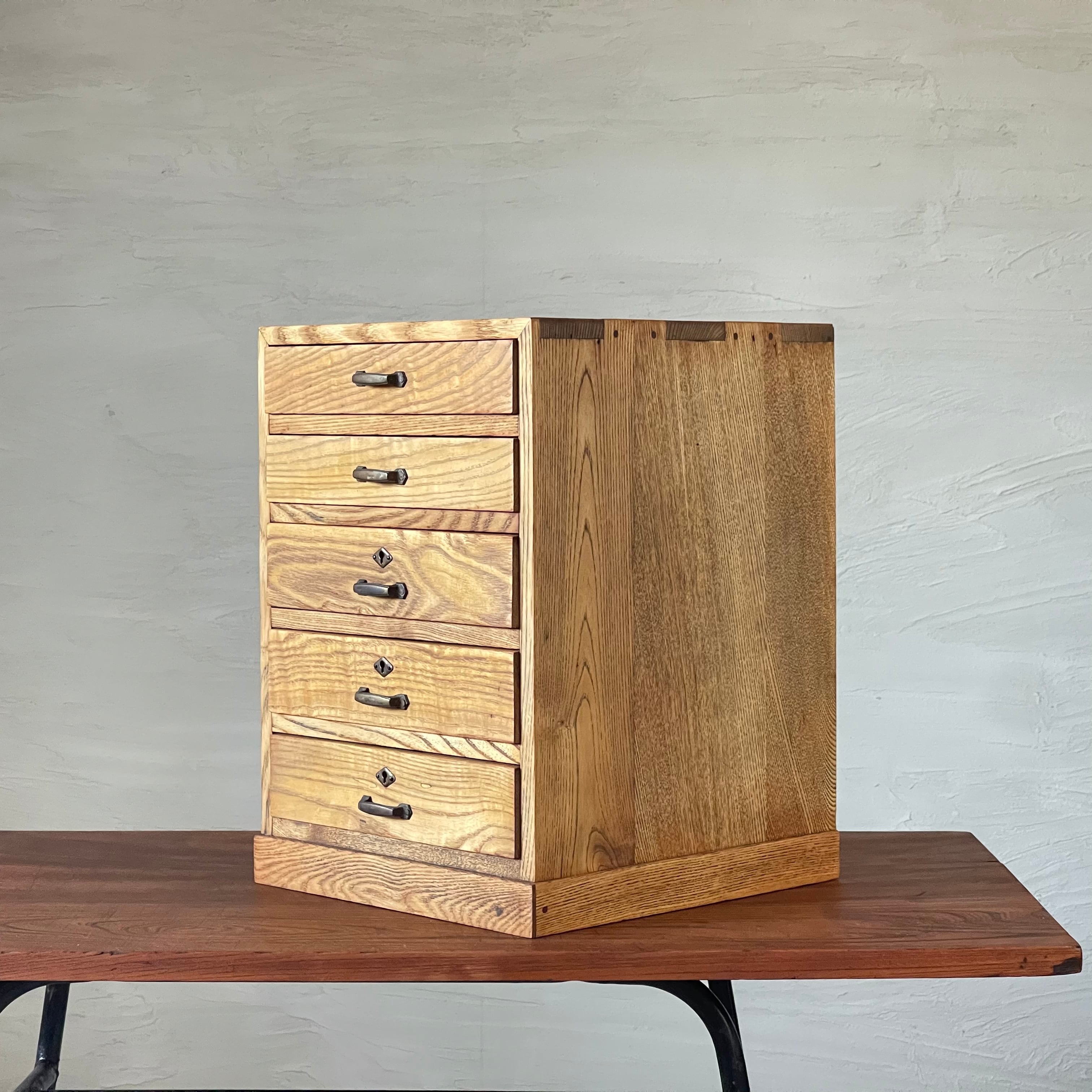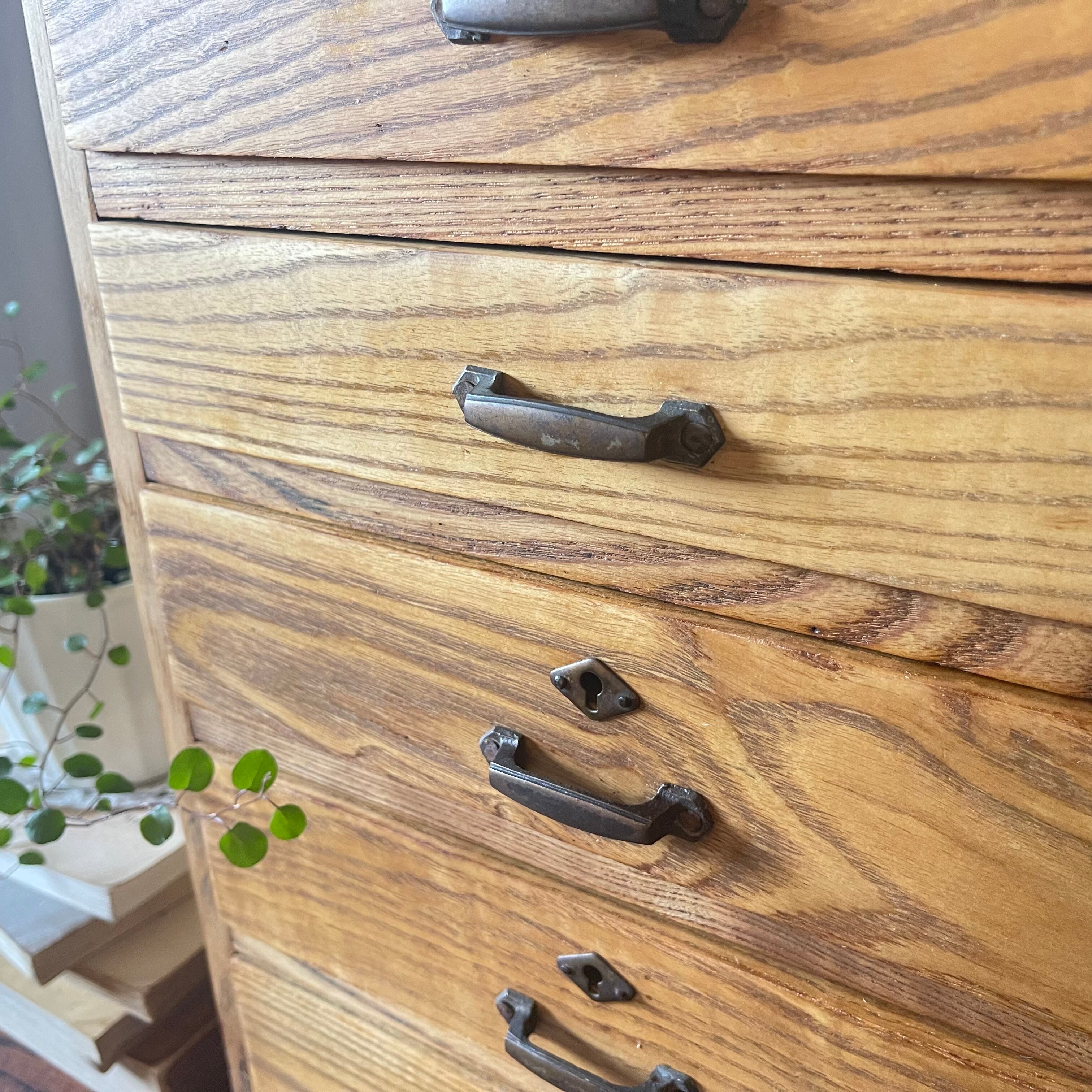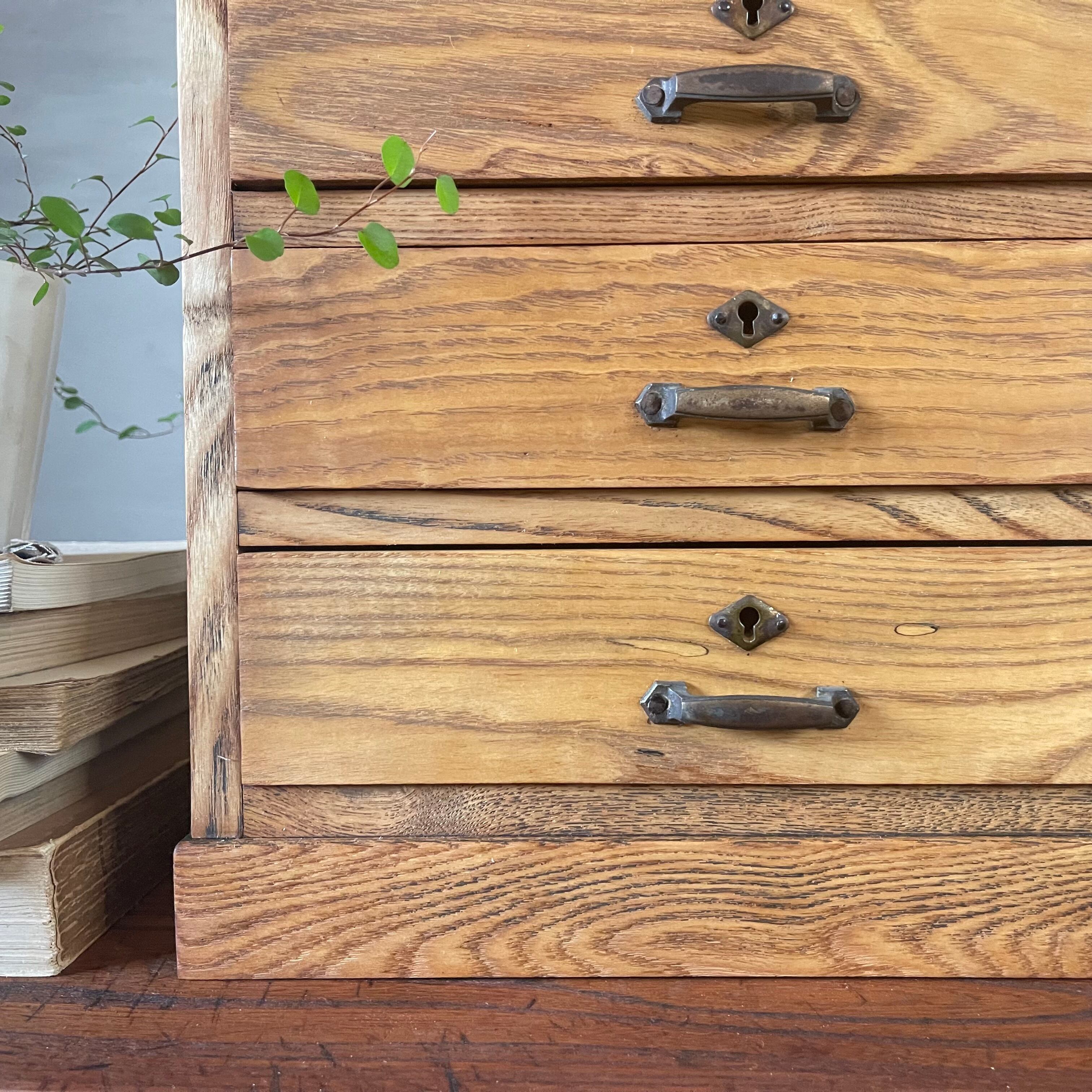 ナチュラルな木味と並んだ真鍮の取手が魅力的な5杯の引き出しです。