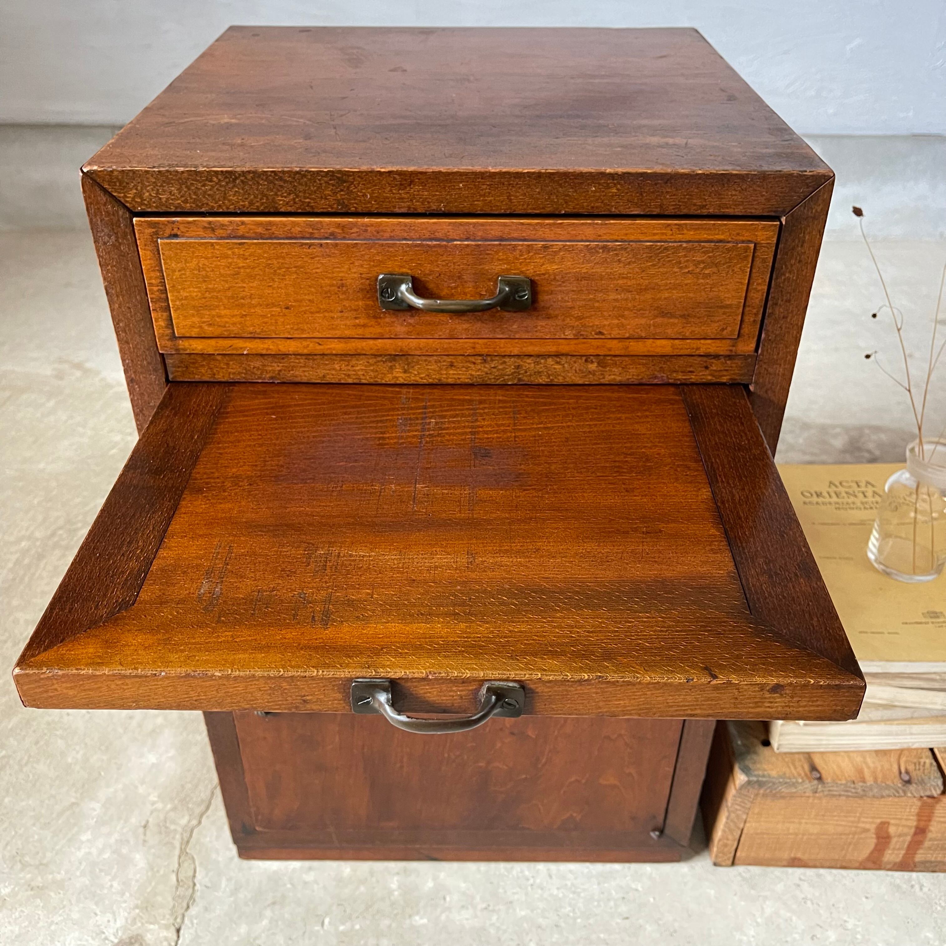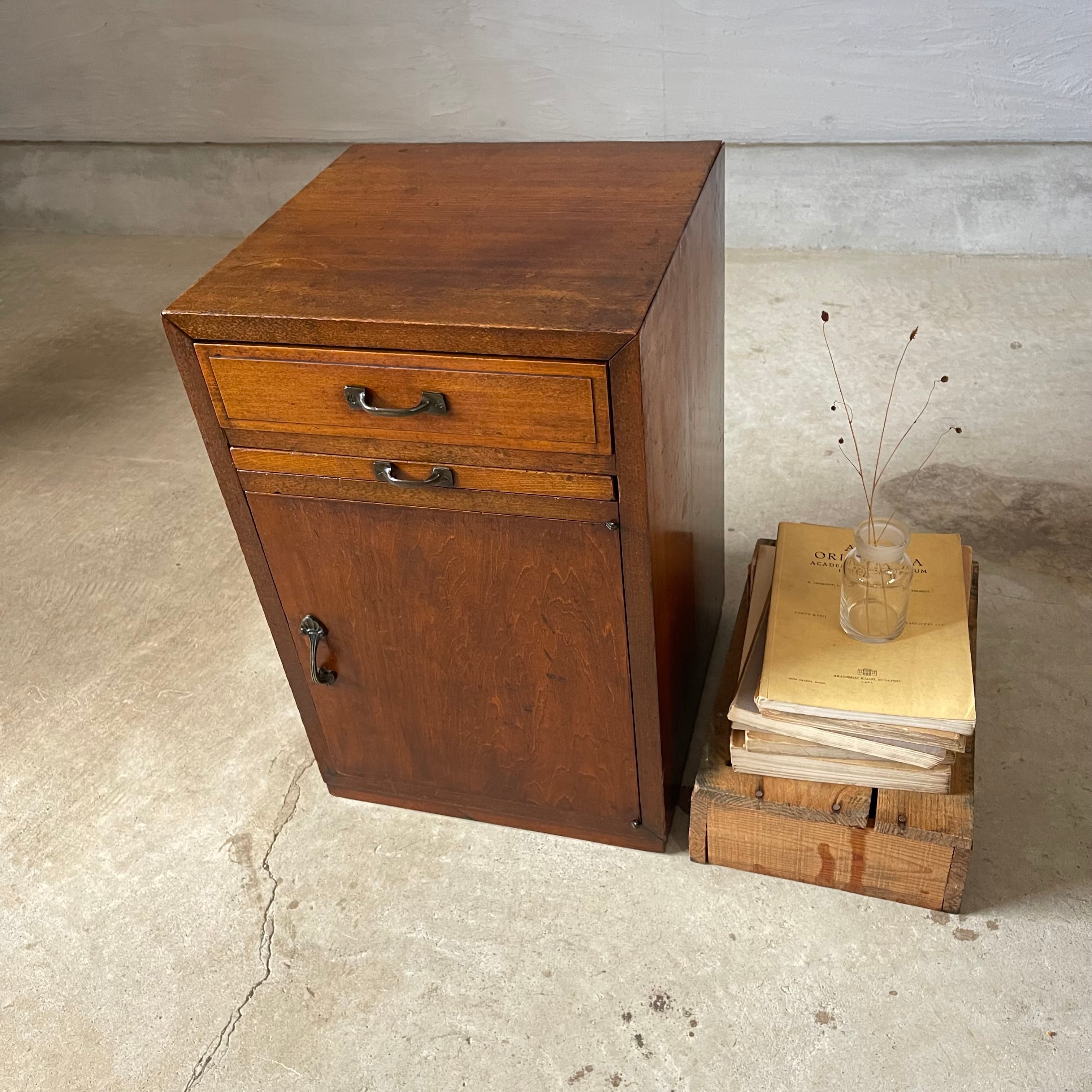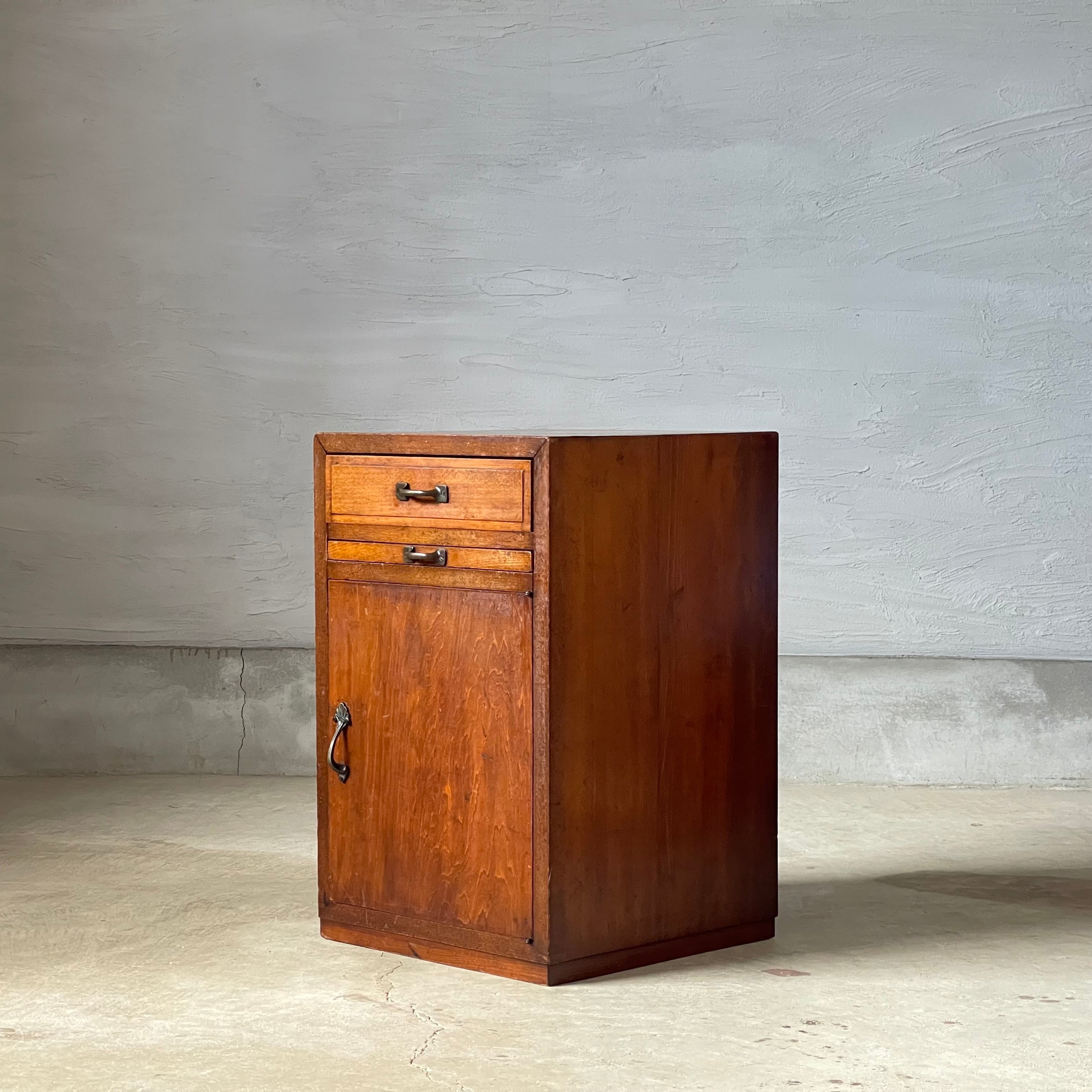 温かみのある経年変化と雰囲気のある金属取手が魅力的な古いサイドテーブルです。