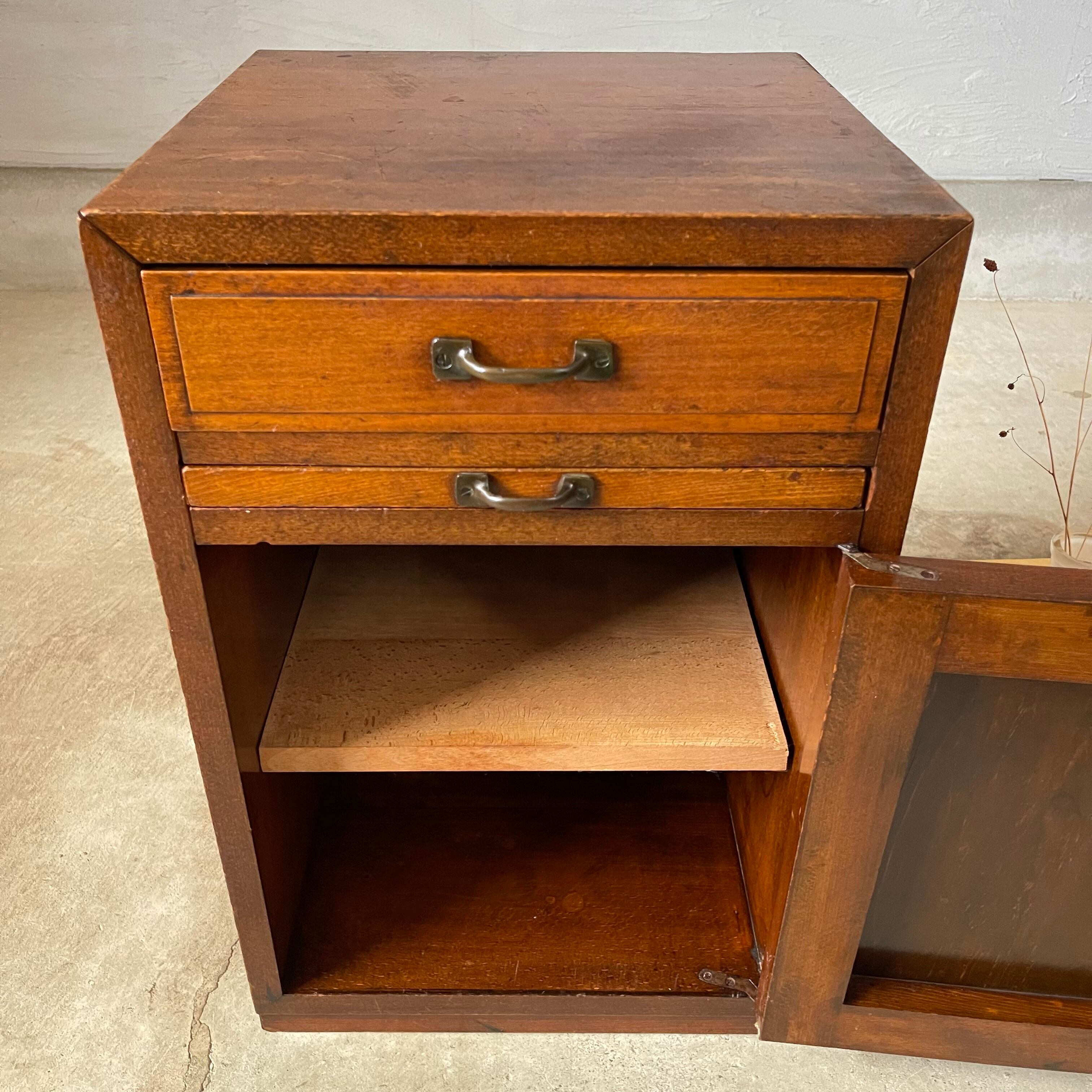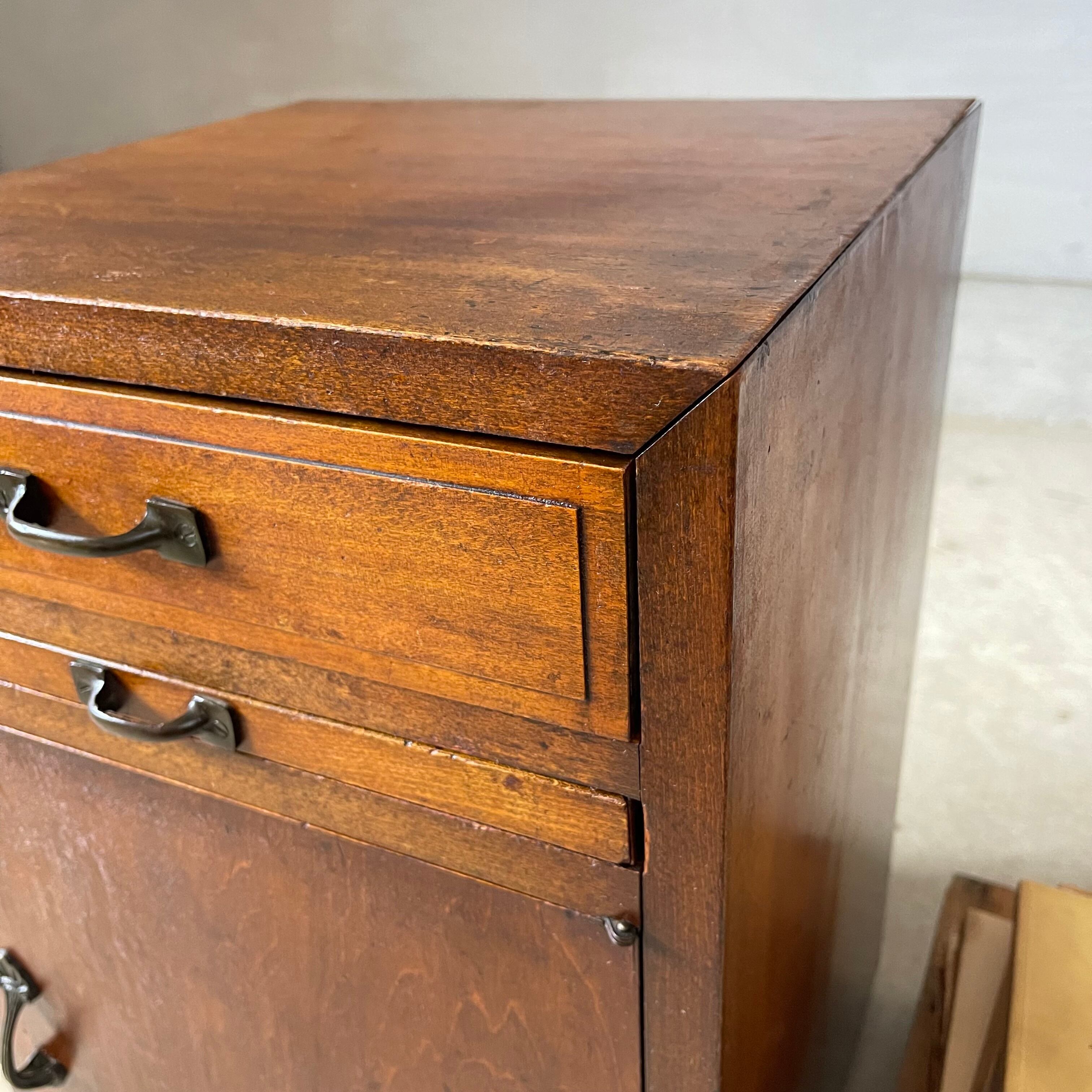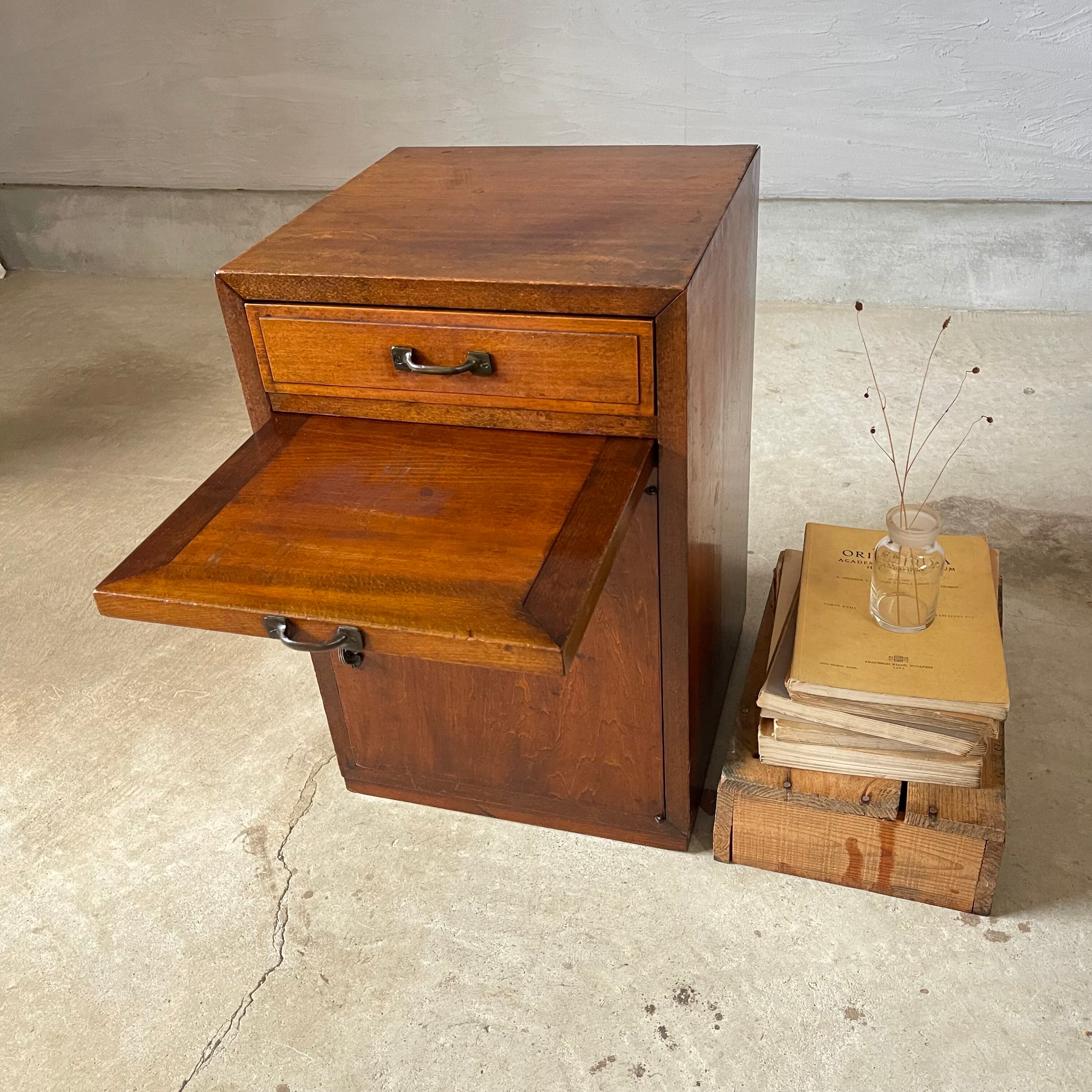 温かみのある経年変化と雰囲気のある金属取手が魅力的な古いサイドテーブルです。