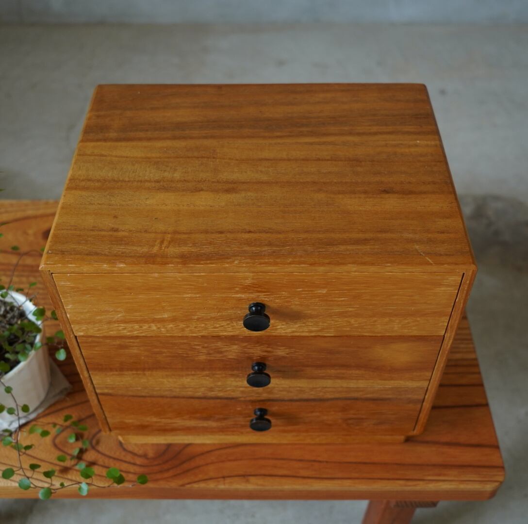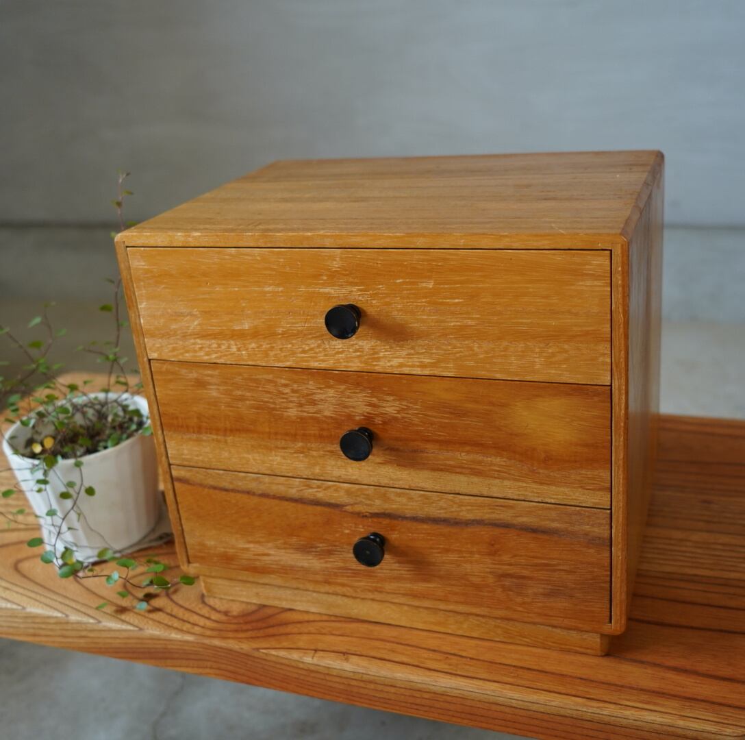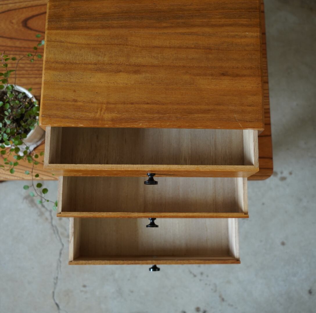 ナチュラルな木味と並んだ黒いつまみが可愛らしい3杯の小引き出しです。