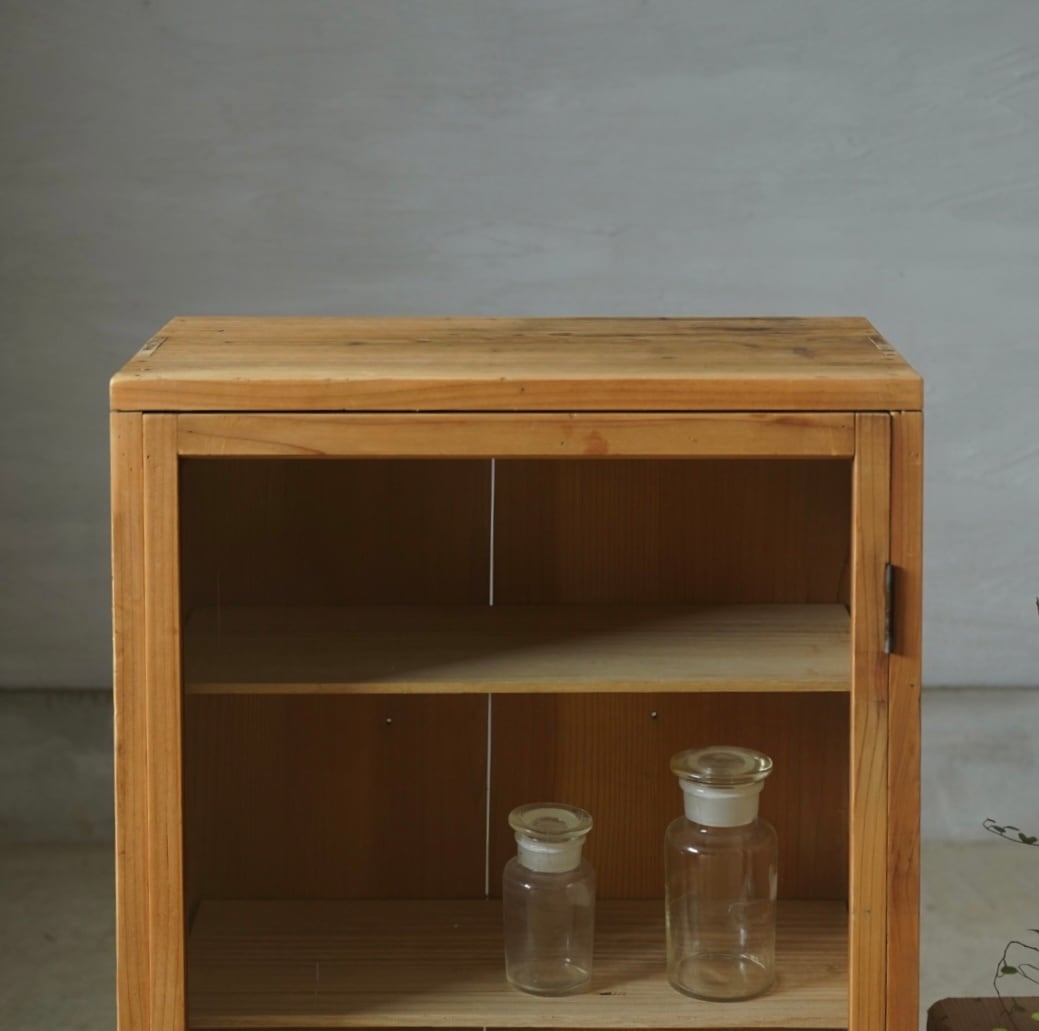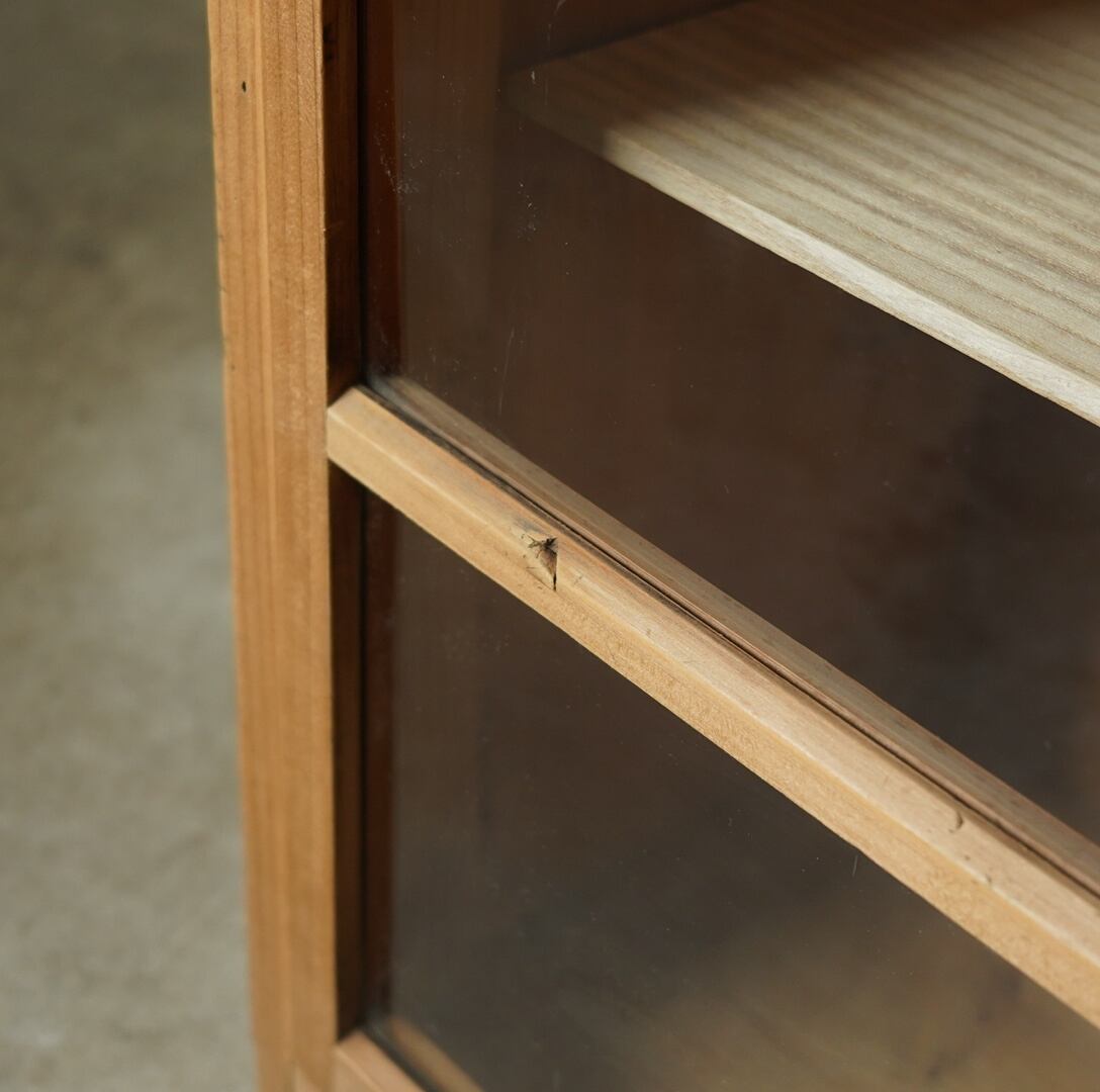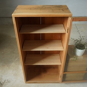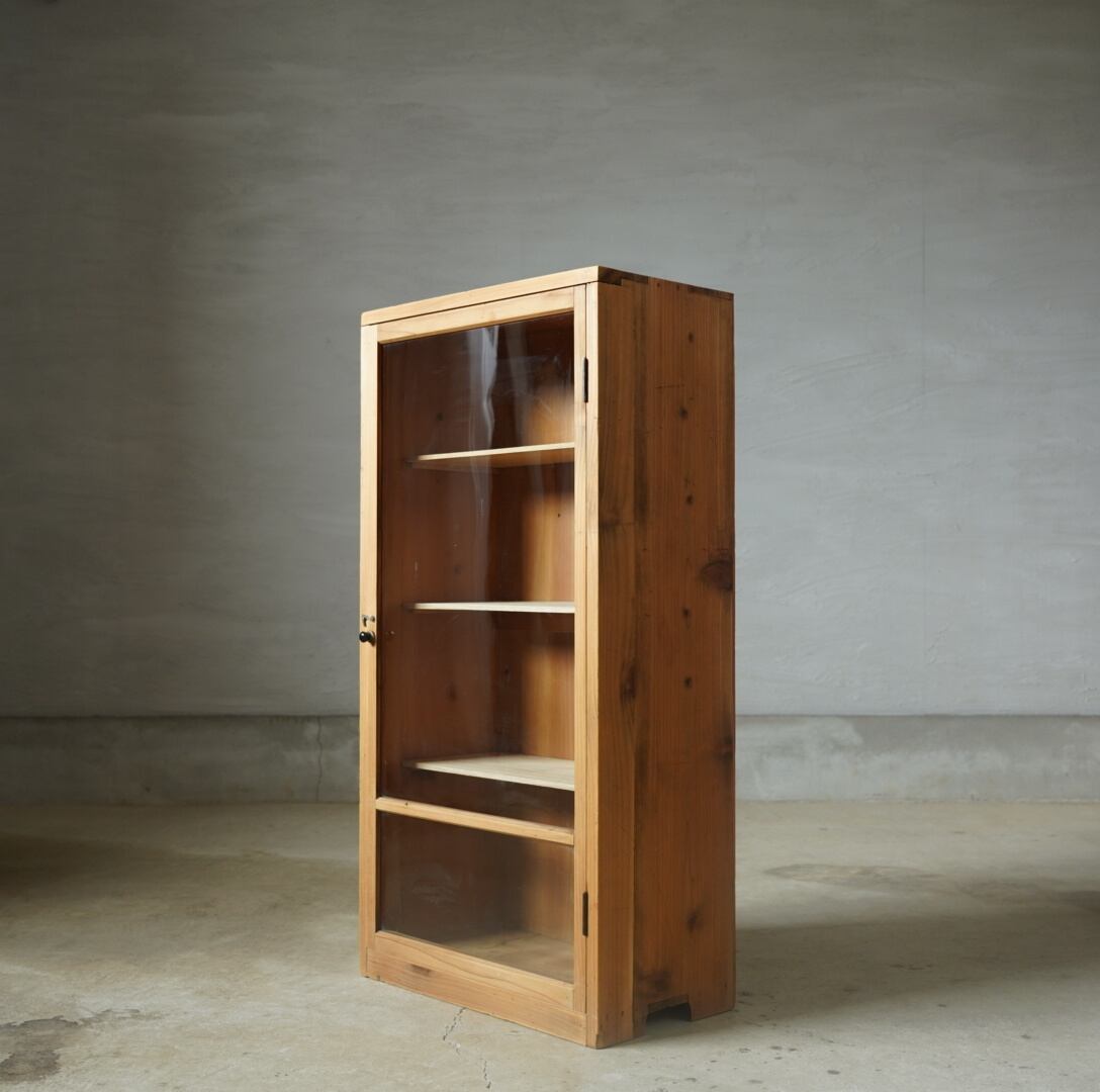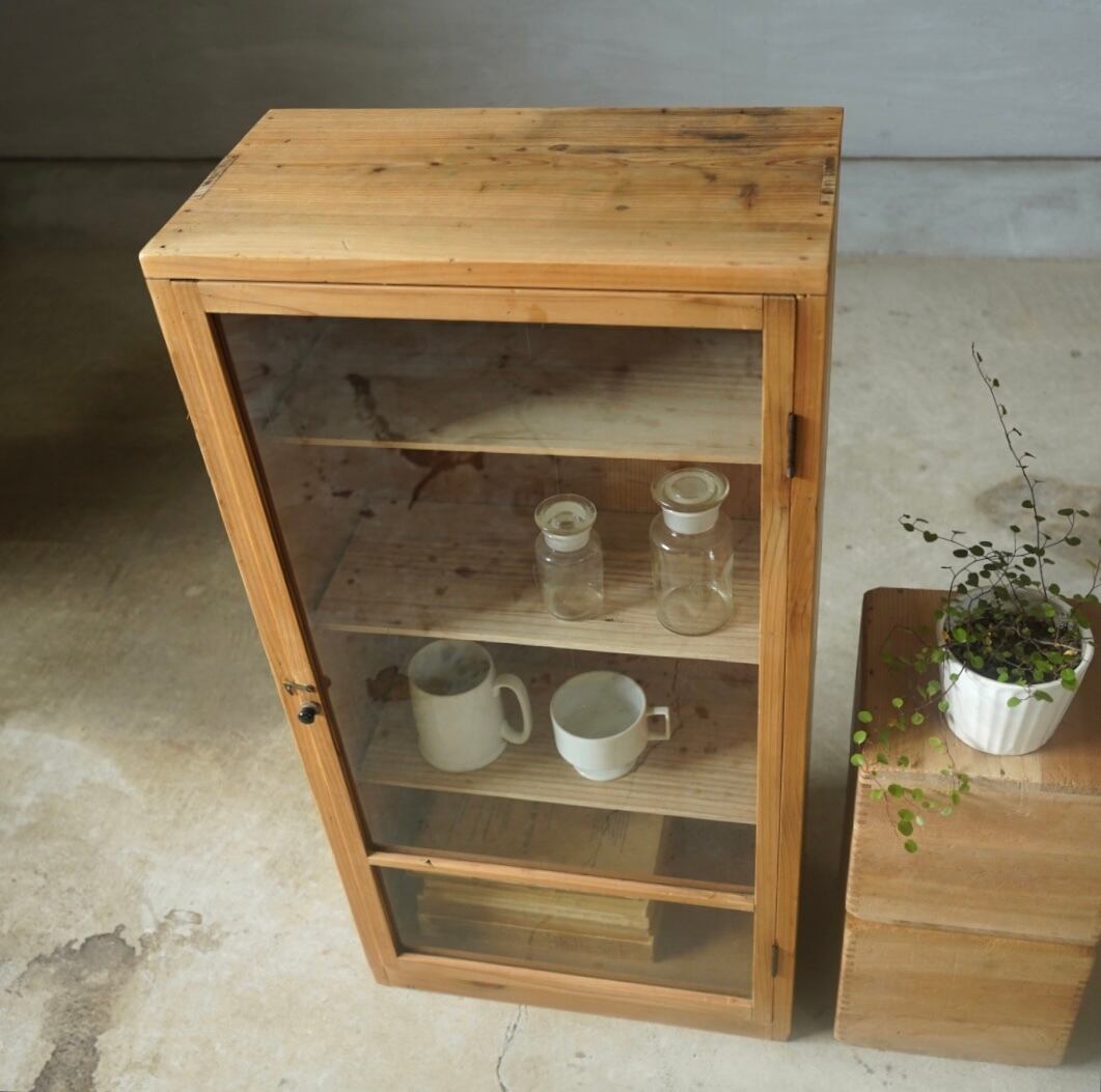 美しいガラスの開き戸と白木の素朴な雰囲気が魅力的な古いガラスケースです。