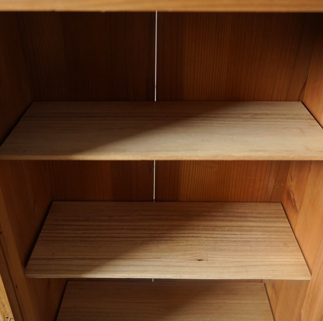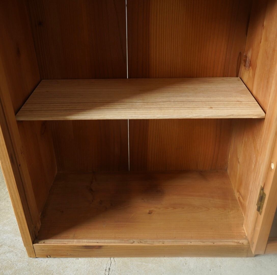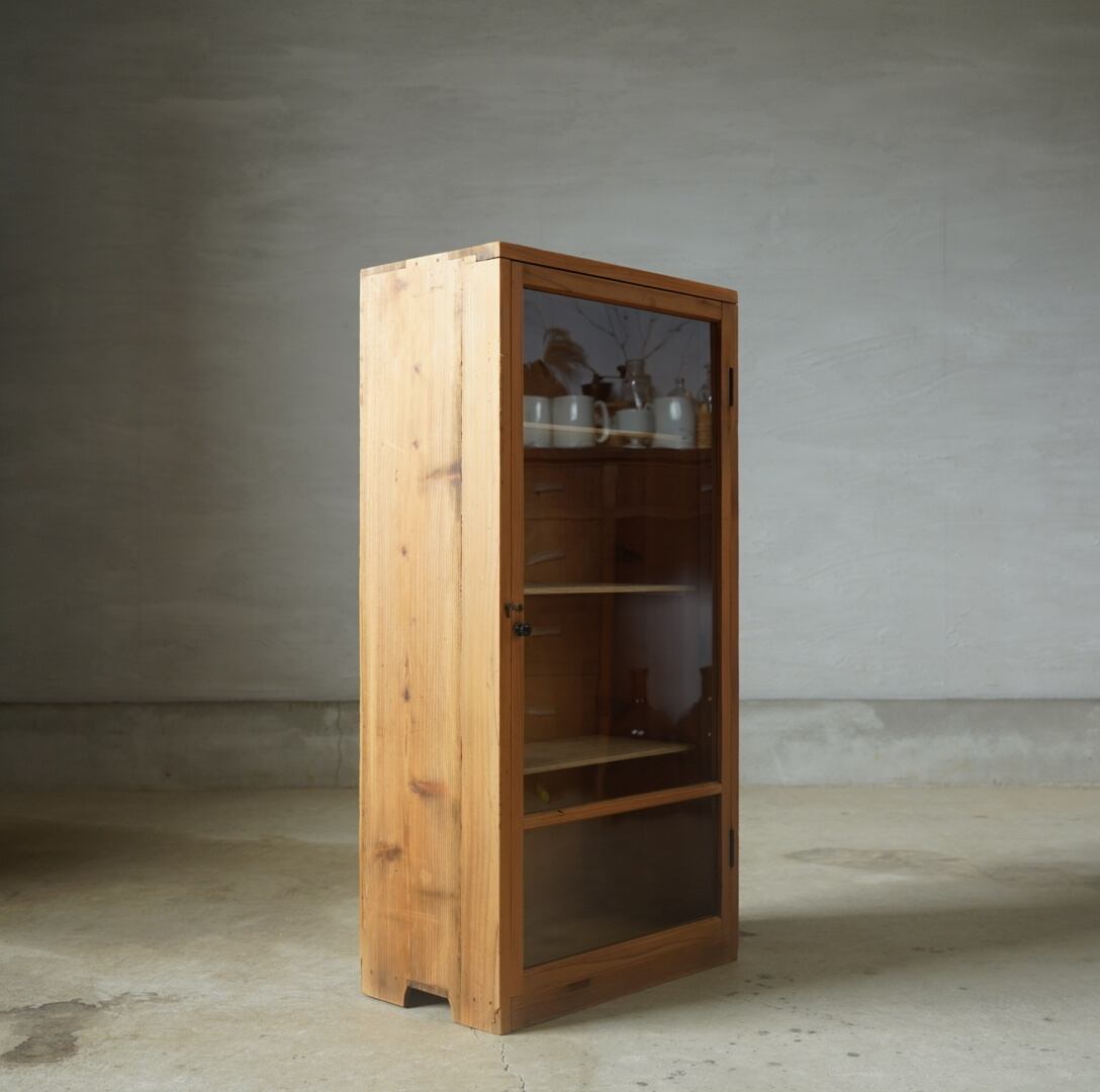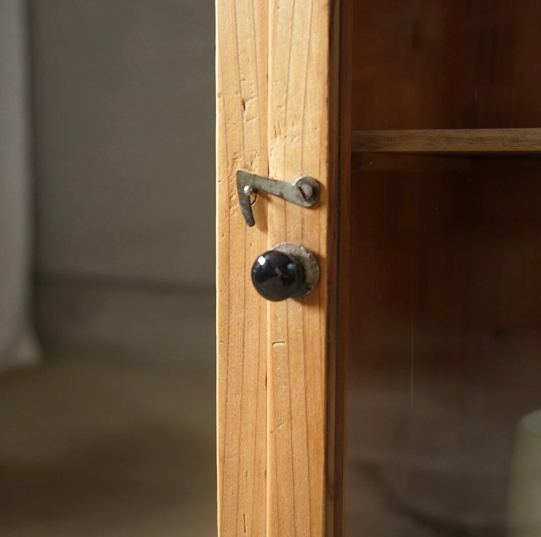 美しいガラスの開き戸と白木の素朴な雰囲気が魅力的な古いガラスケースです。
