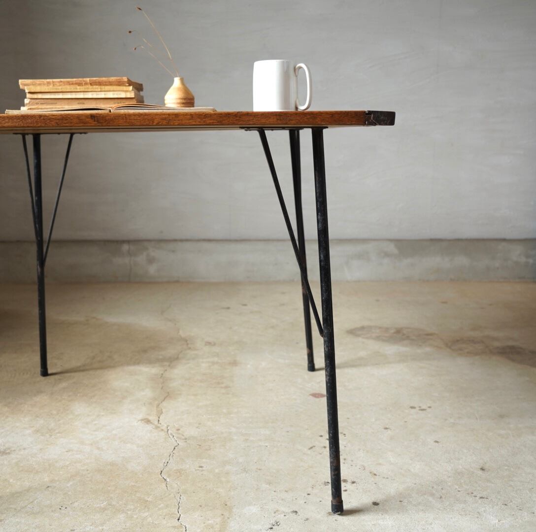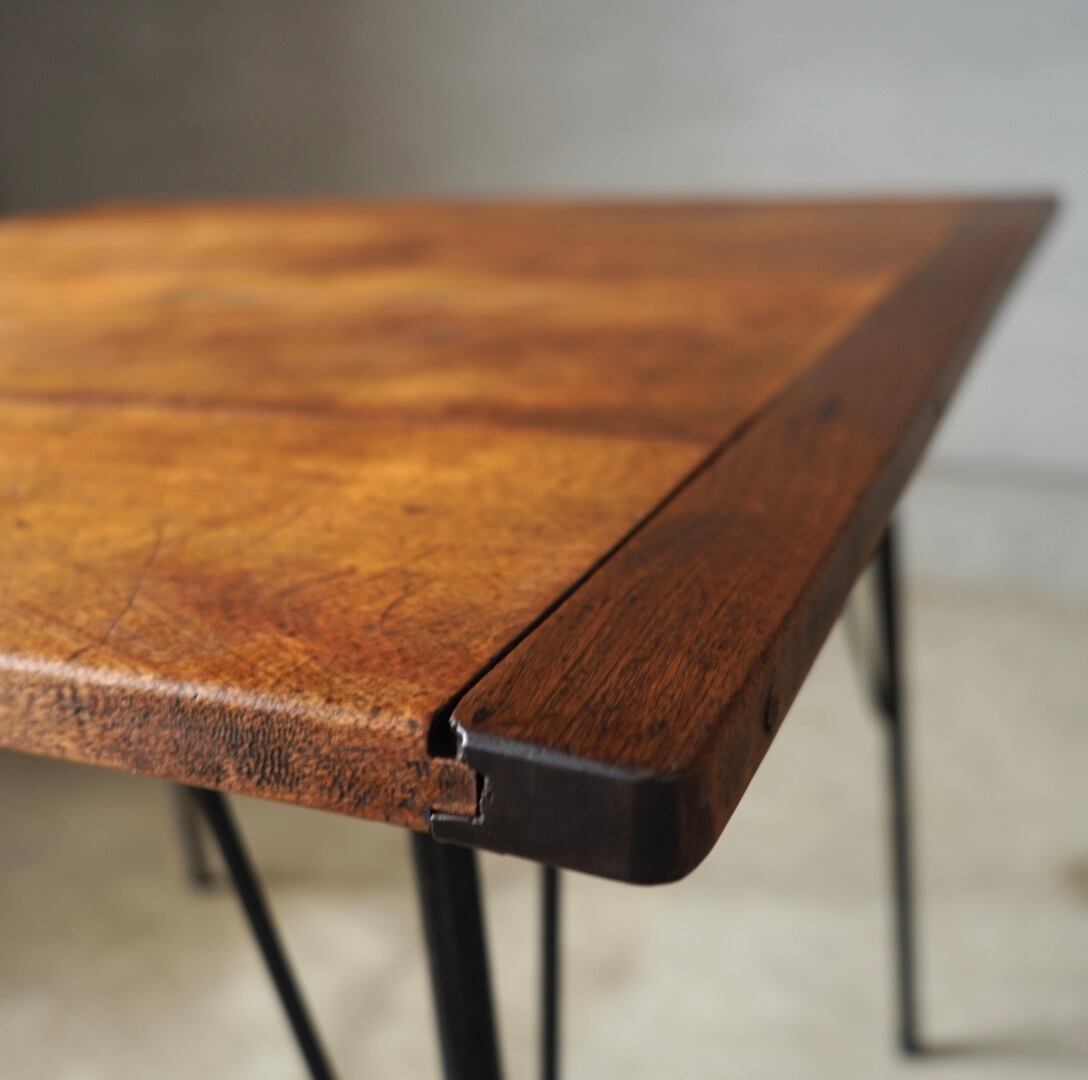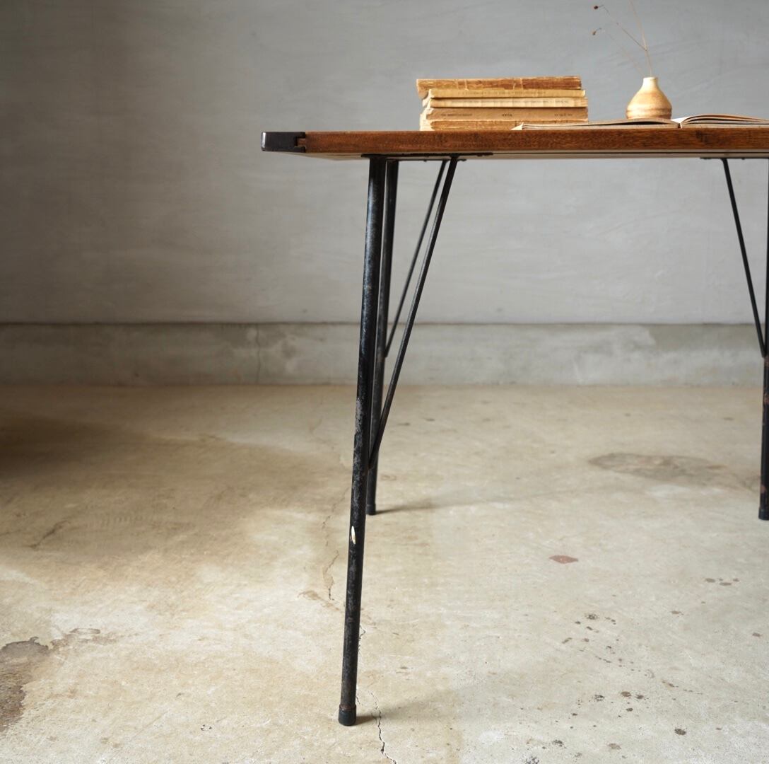 天板に使われた無垢材の温かみのある経年変化とすっきりとしたアイアン脚が美しいテーブルです。