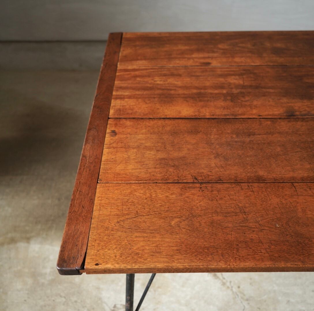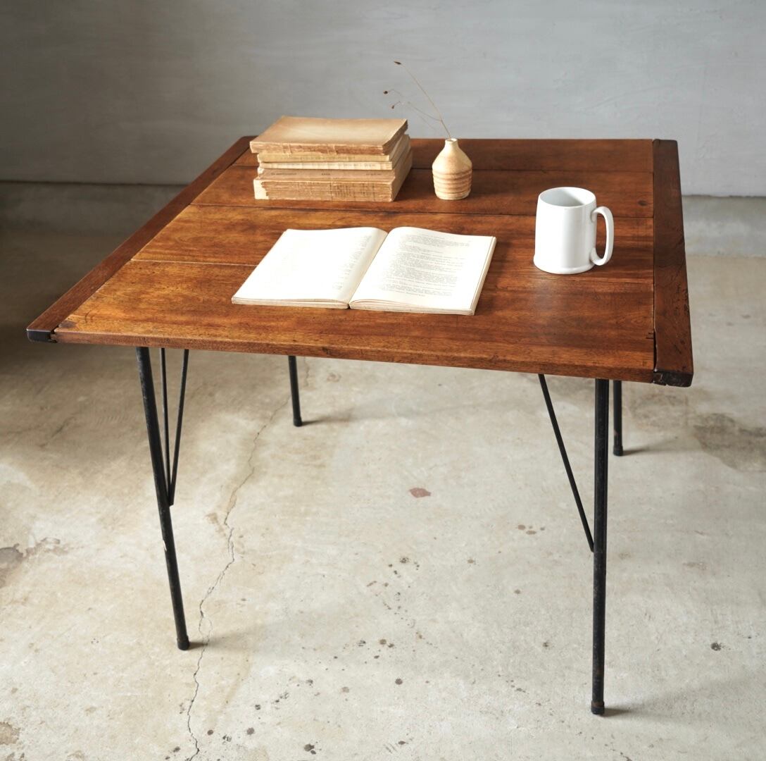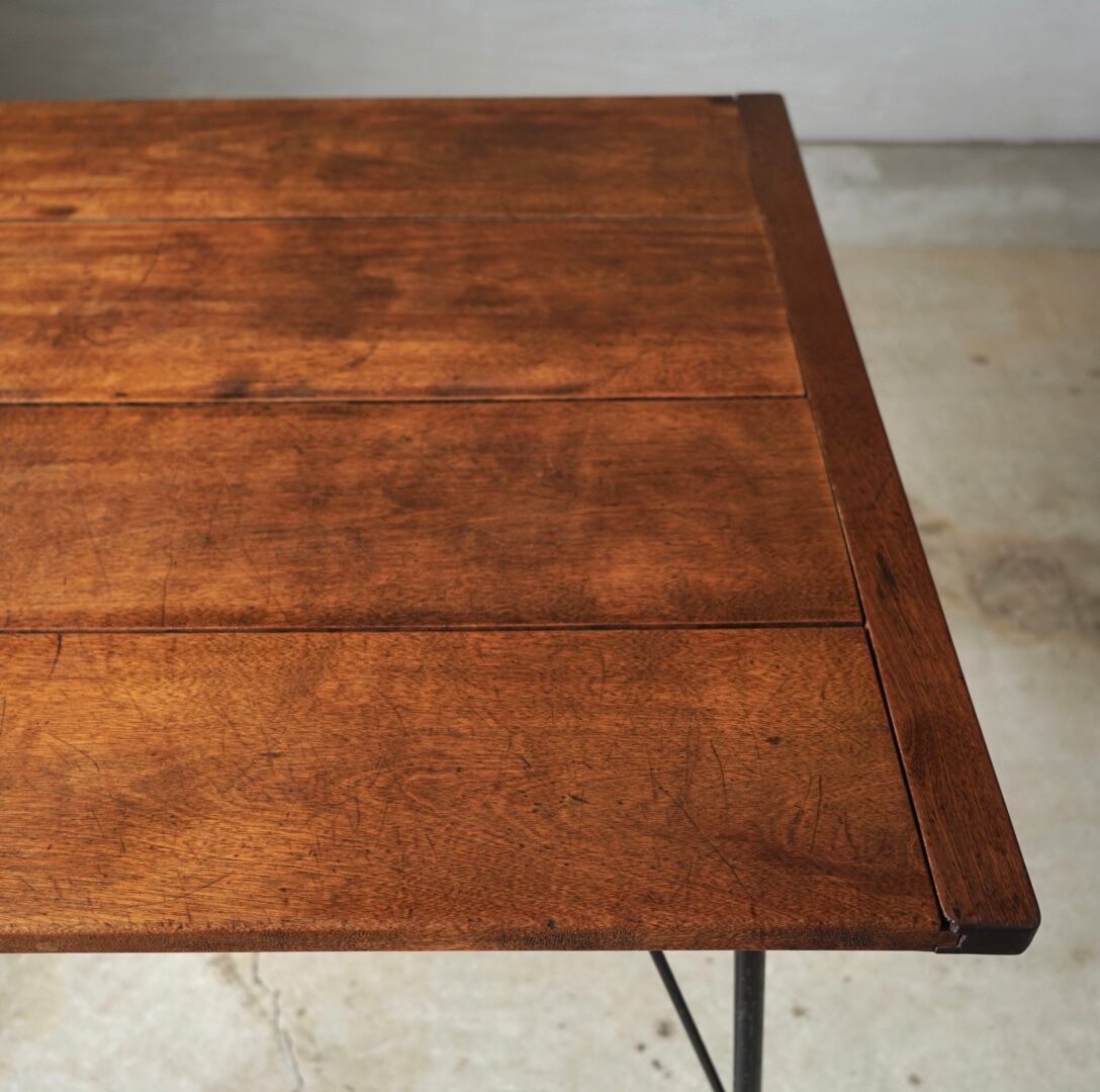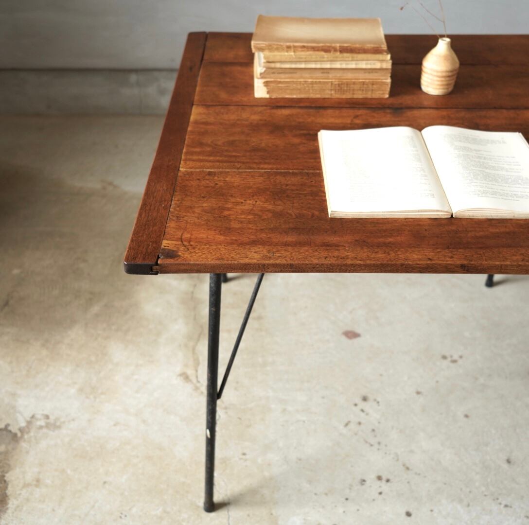 天板に使われた無垢材の温かみのある経年変化とすっきりとしたアイアン脚が美しいテーブルです。