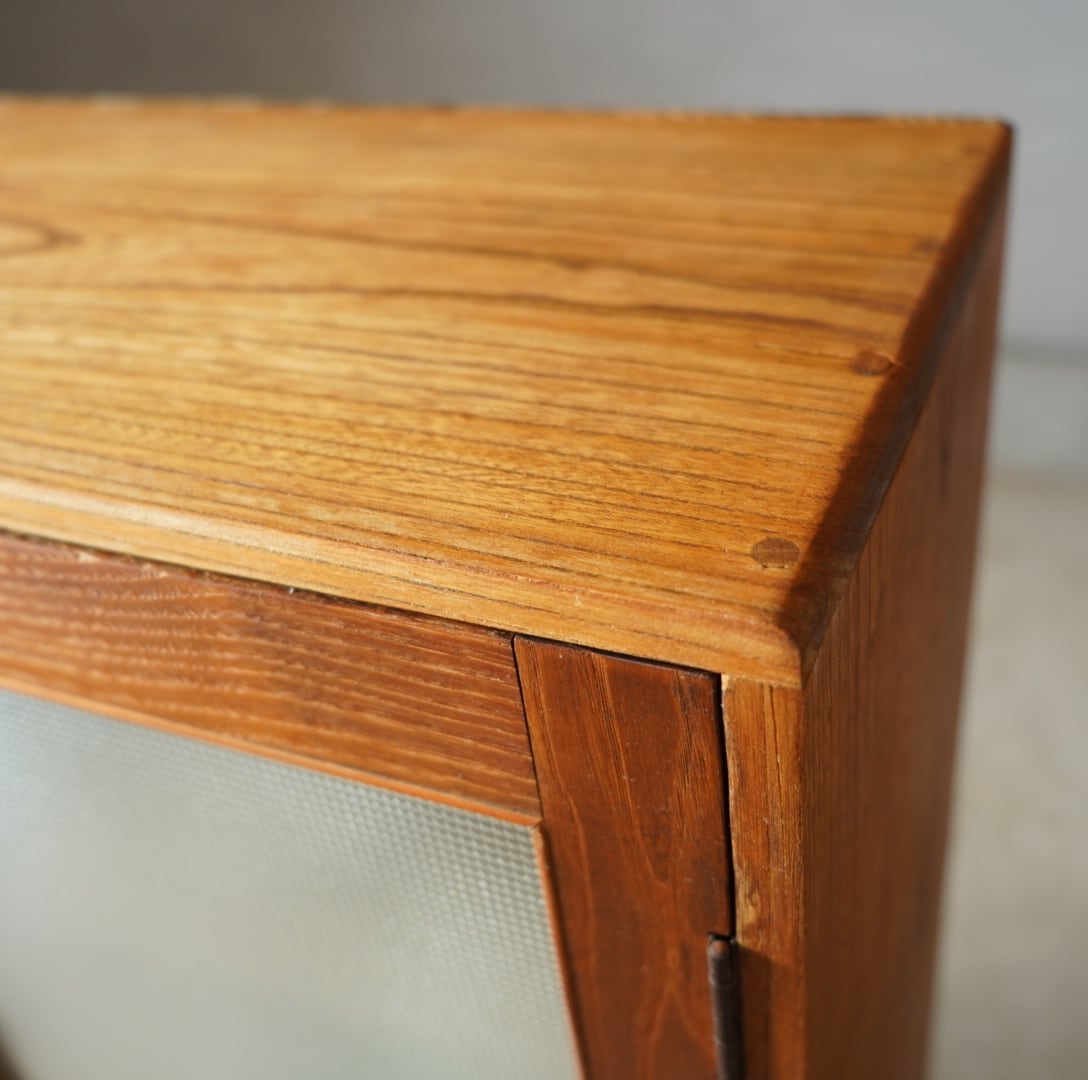 無垢材のナチュラルな木味と個性的なデザインが魅力的なキャビネットです。