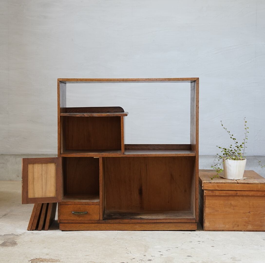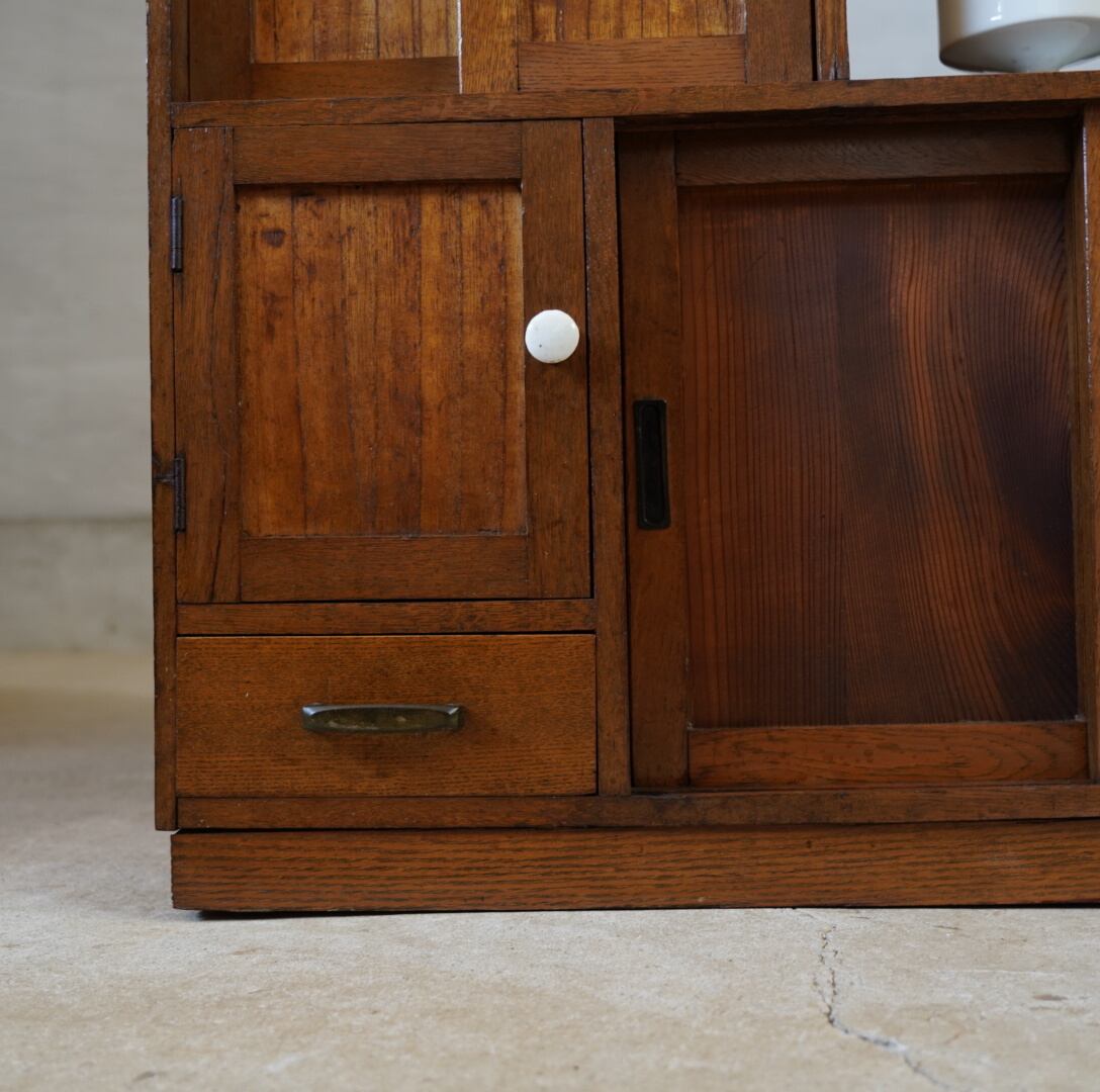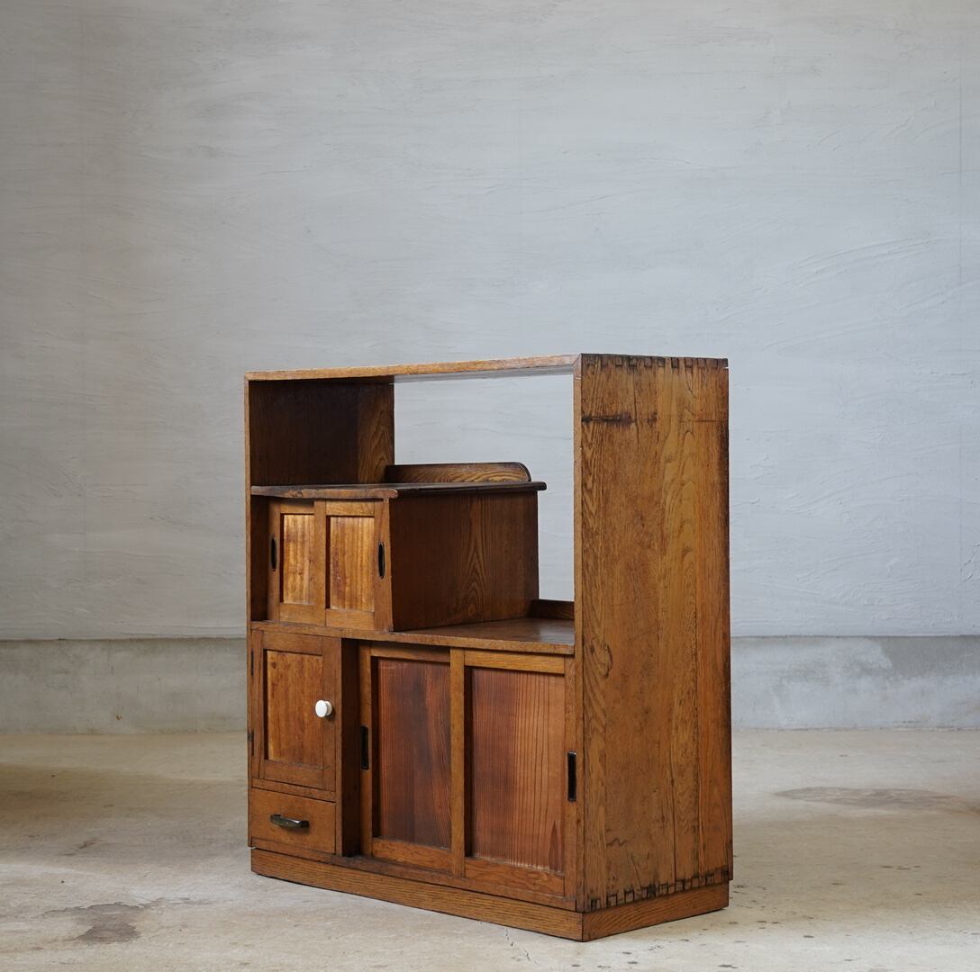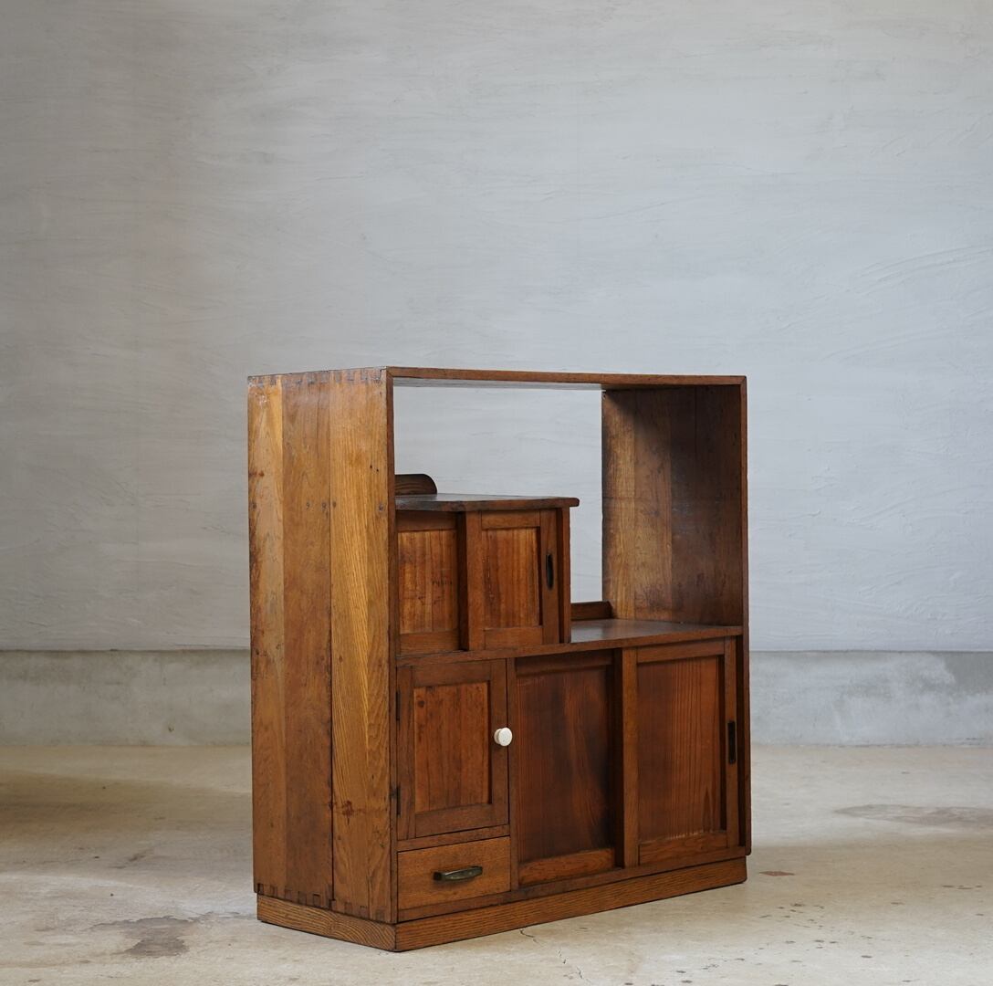 楢材の温かみのある経年変化と個性的なデザインが魅力的な古い収納棚です。