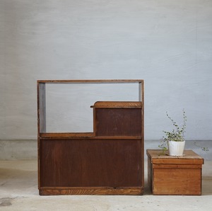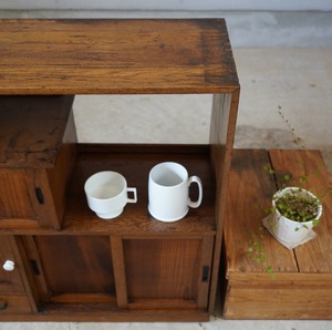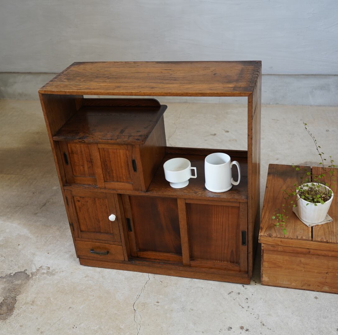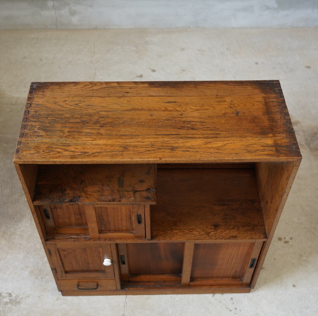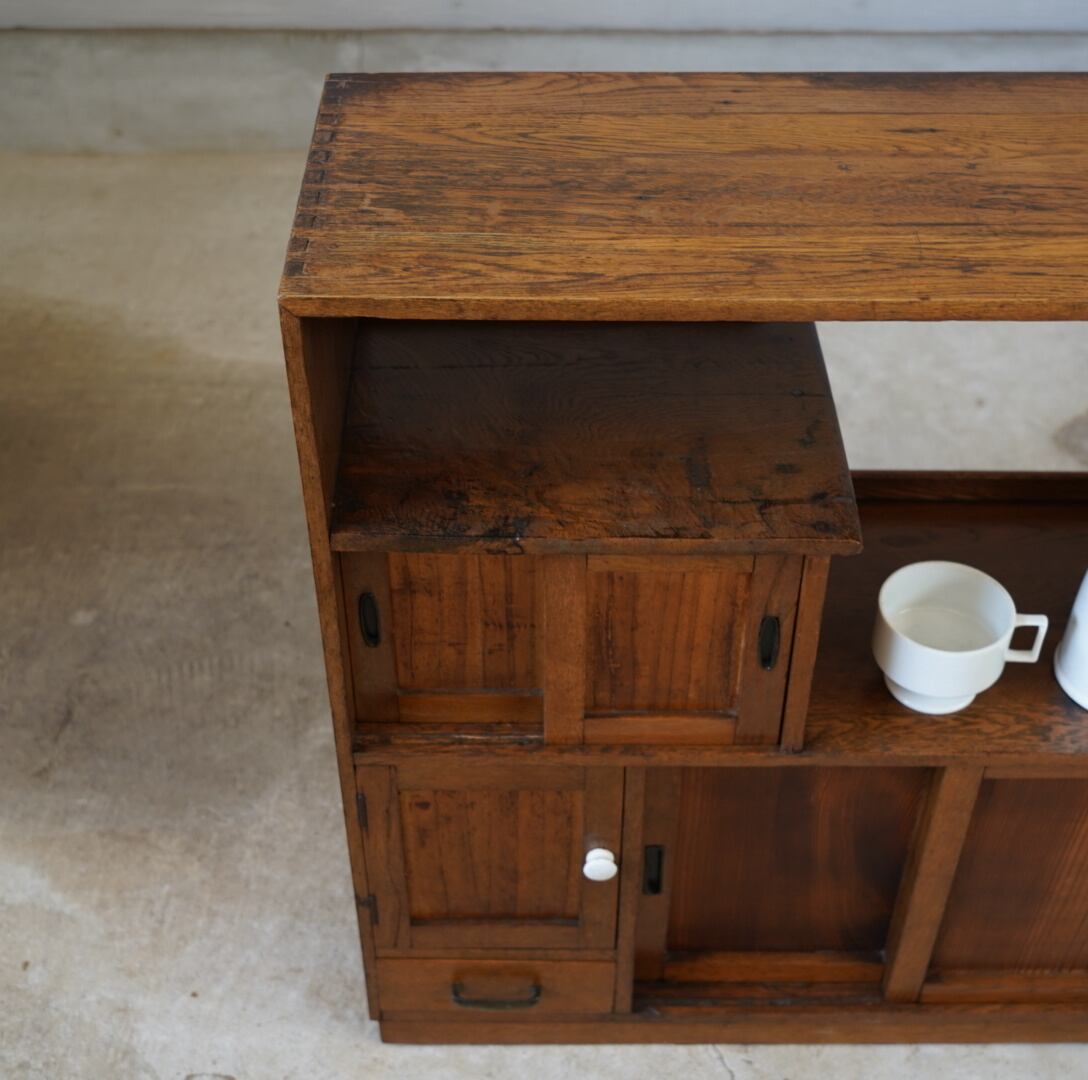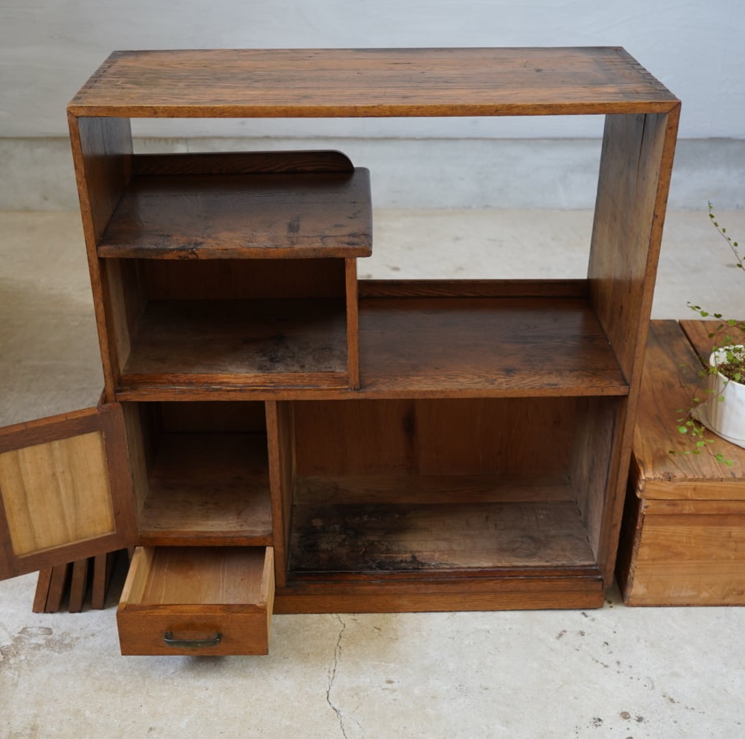 楢材の温かみのある経年変化と個性的なデザインが魅力的な古い収納棚です。