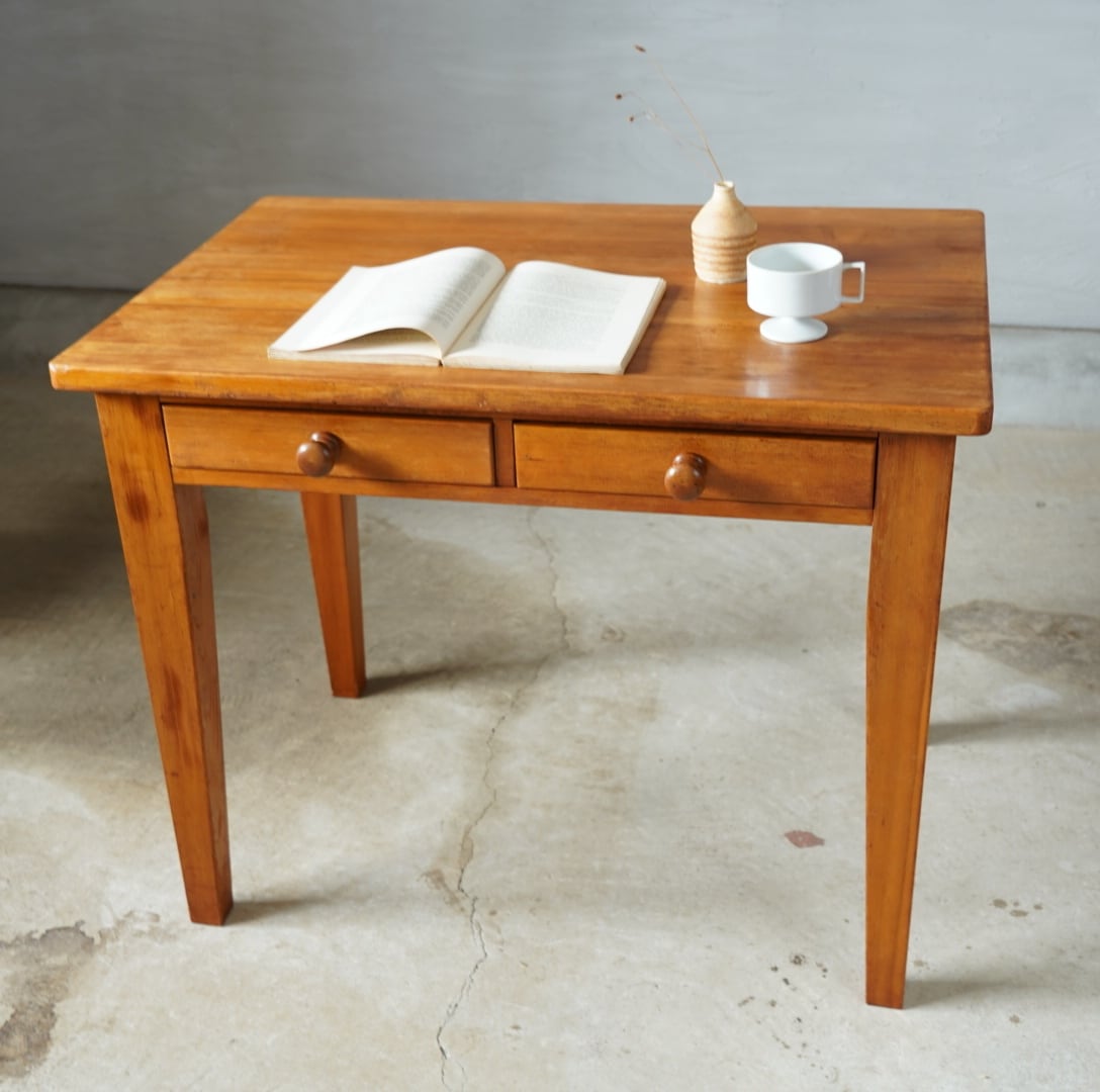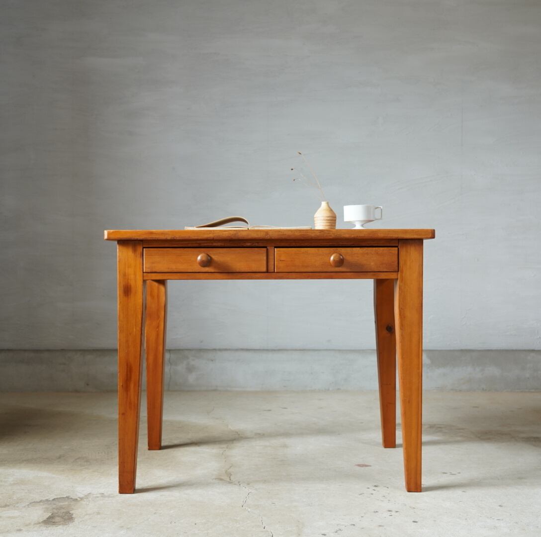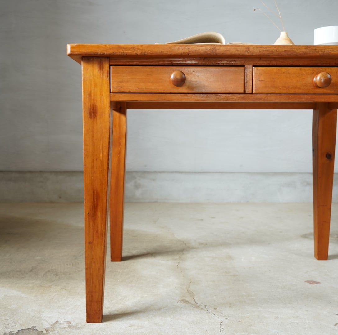 パイン材の温かみのある経年変化と木製取手の引き出しが可愛らしいデスクです。