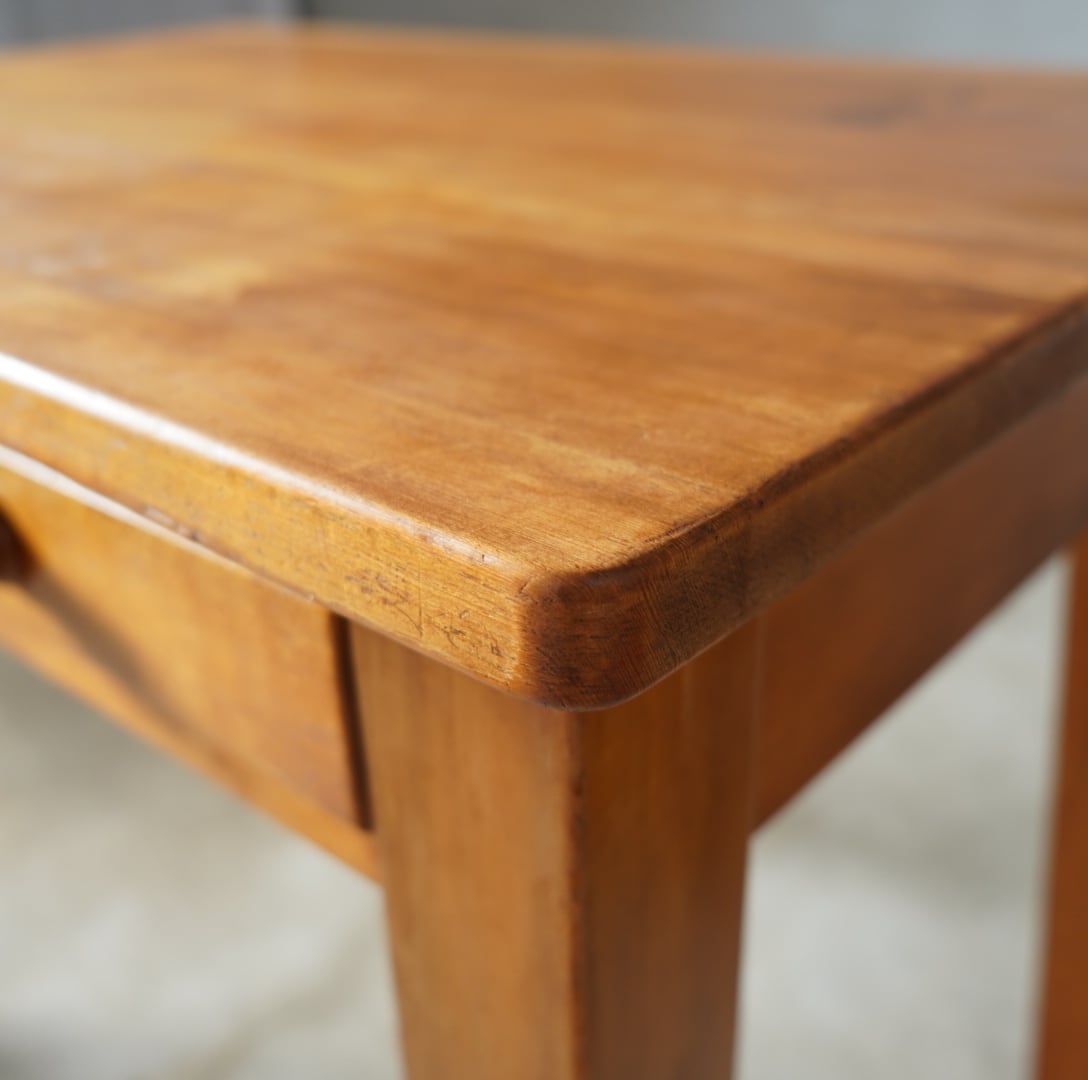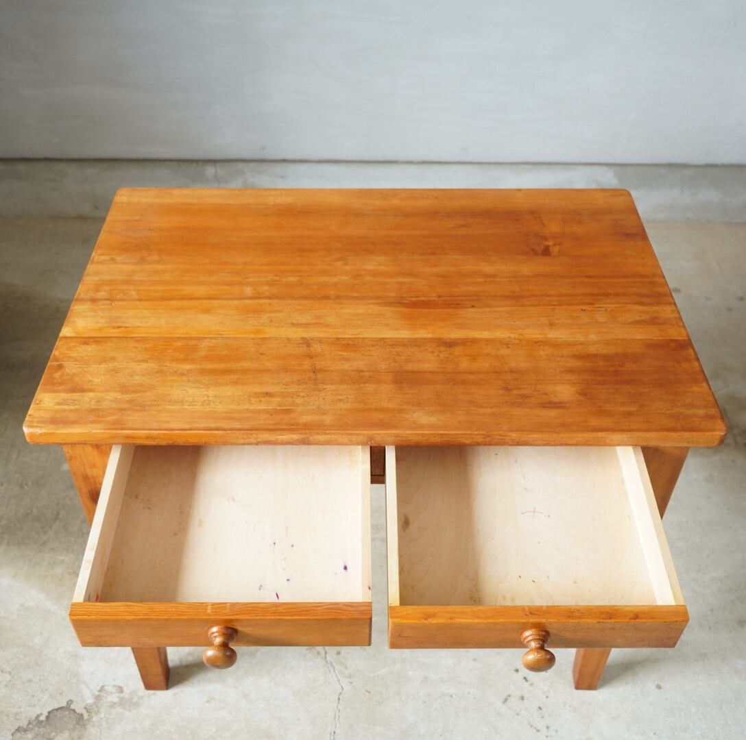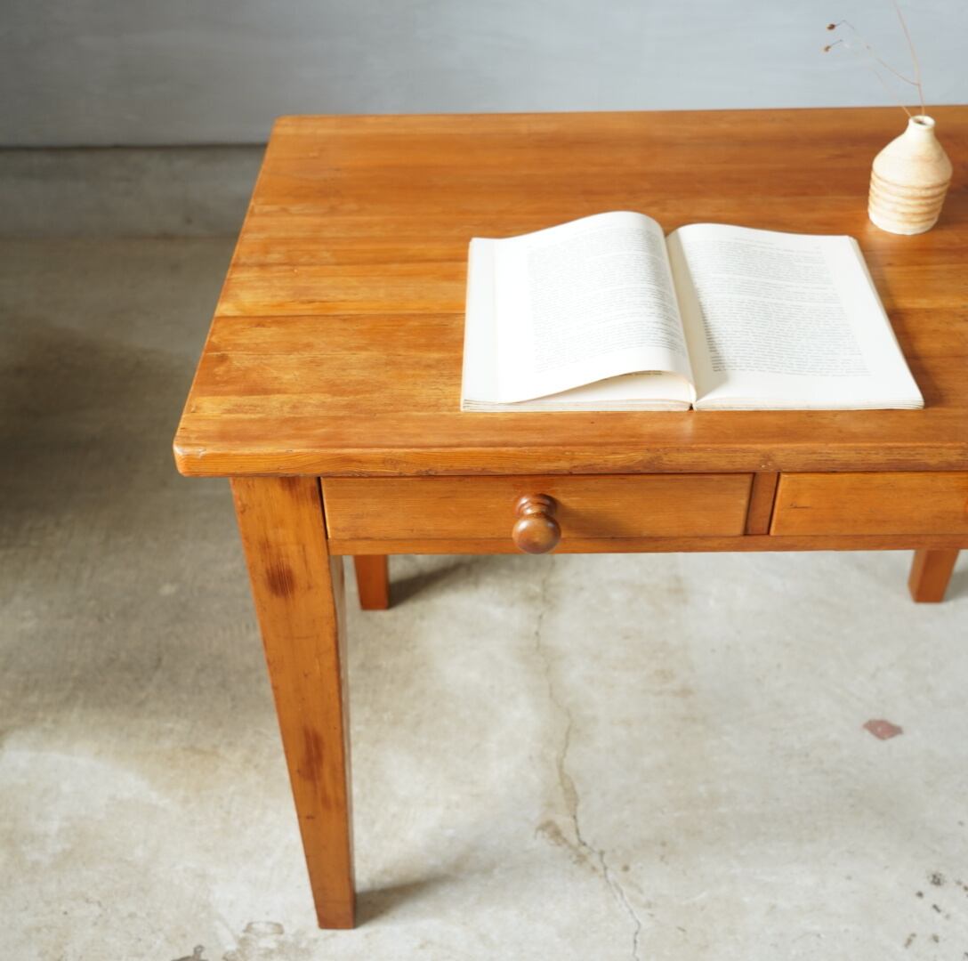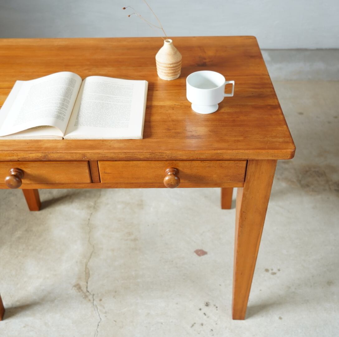 パイン材の温かみのある経年変化と木製取手の引き出しが可愛らしいデスクです。