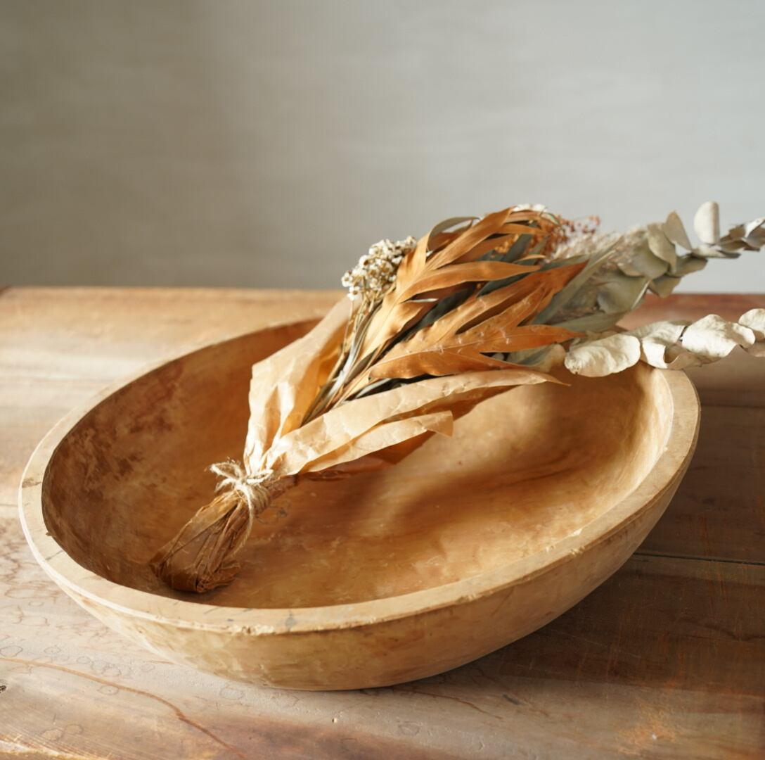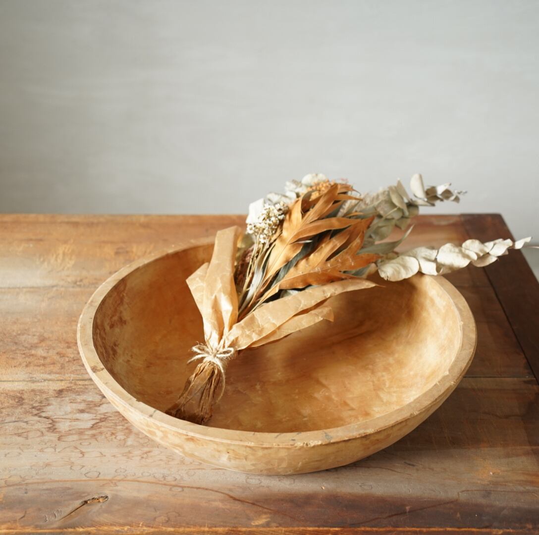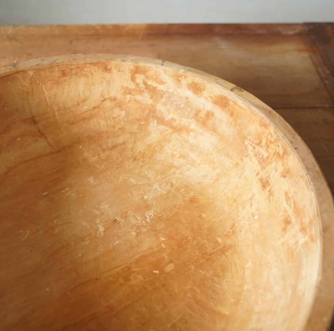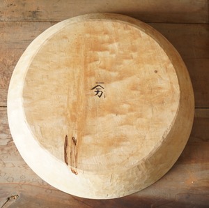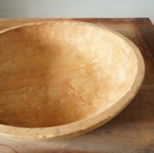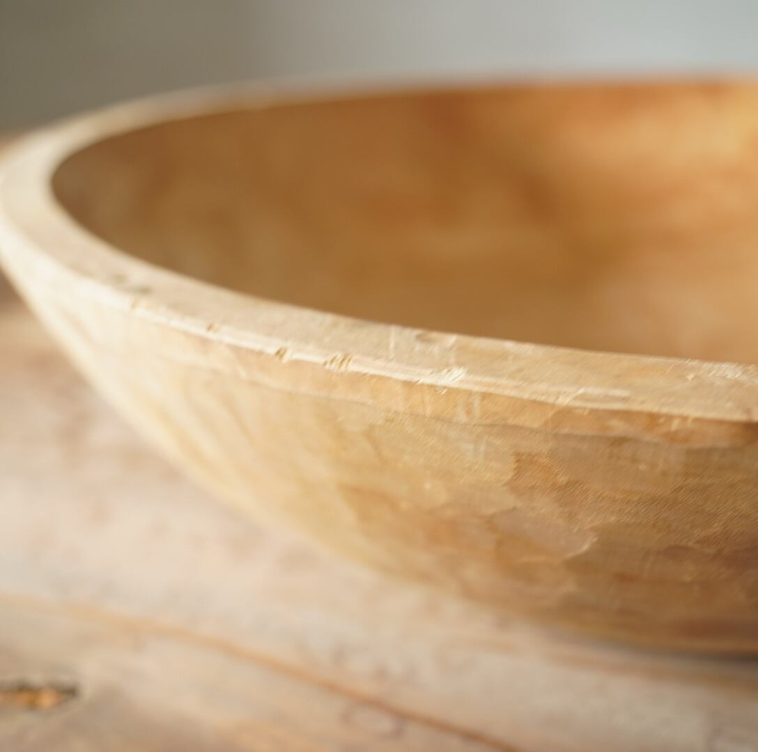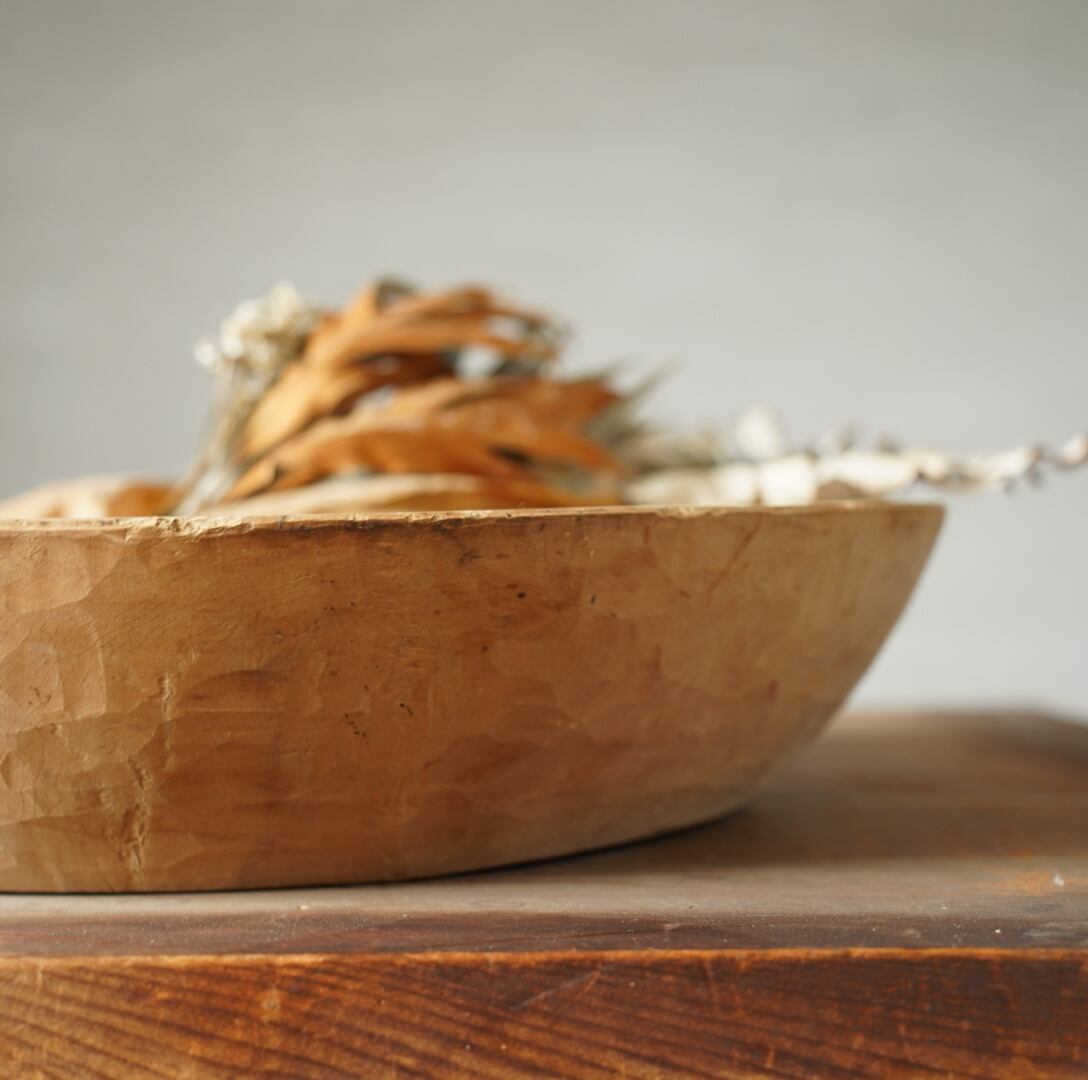 古い木の素朴な風合いと木肌にのこされた鑿の跡が美しいウッドボウルです。