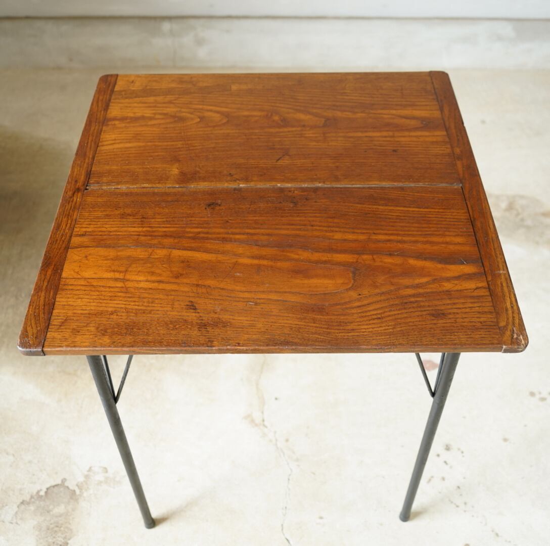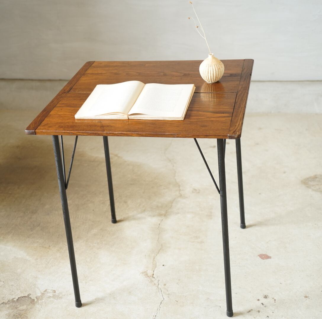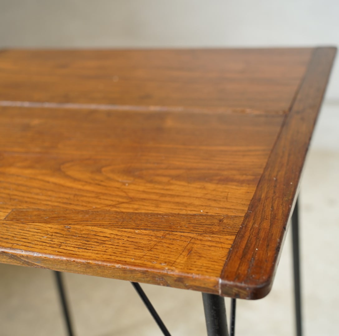 天板に使われた無垢材の温かみのある経年変化とすっきりとしたアイアン脚が美しいテーブルです。