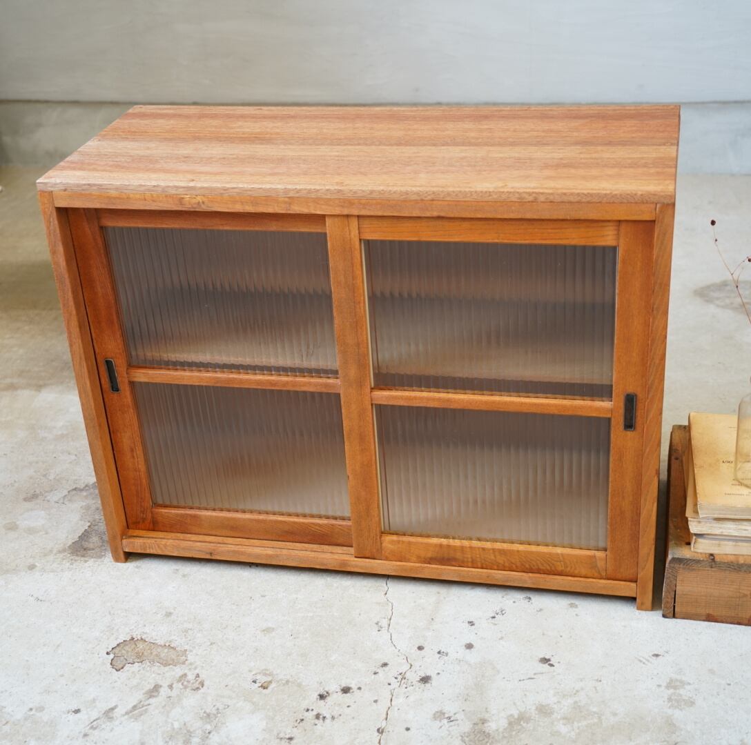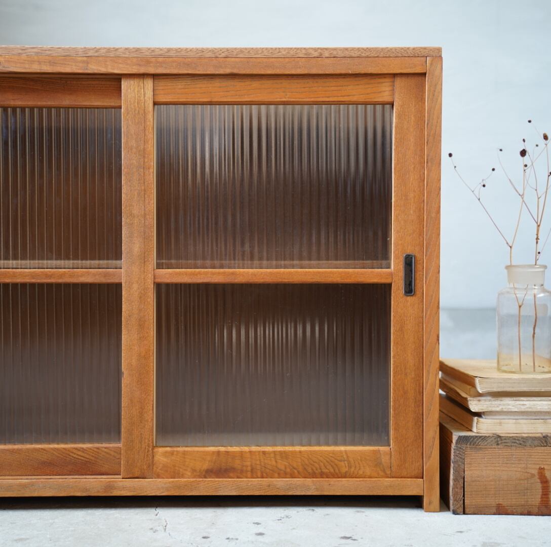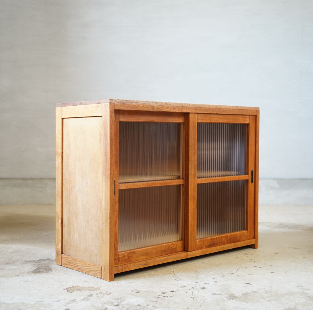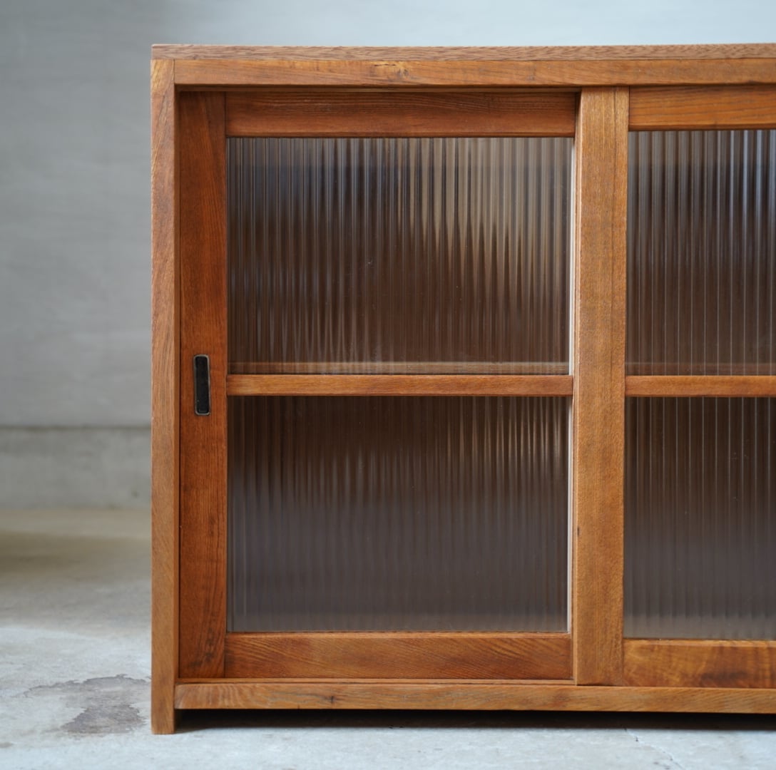 温かみのある経年変化ときらきらと光を反射するモールガラスの引き戸が美しい食器棚です。