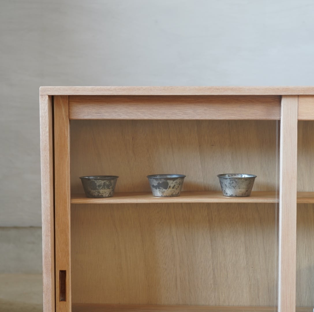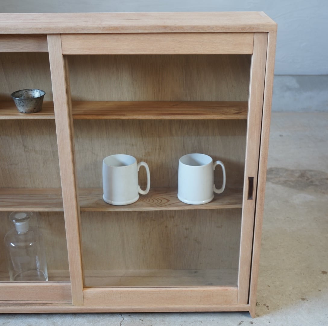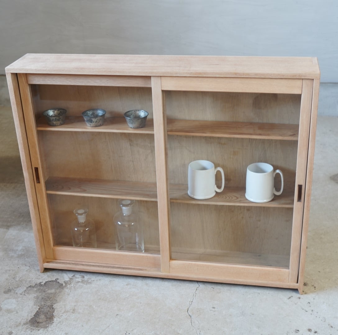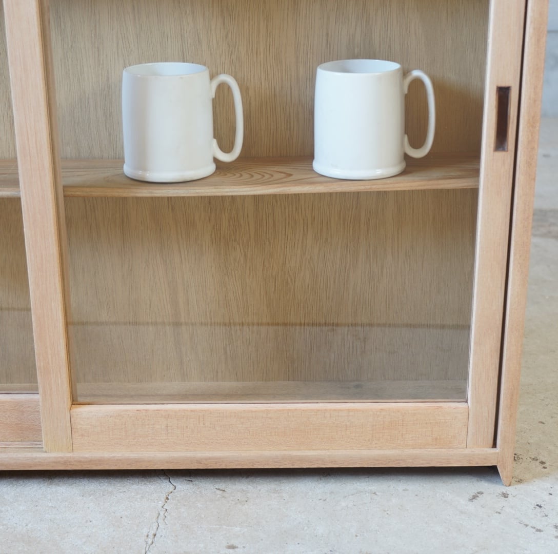 白木のナチュラルな木味と大きなガラスの引き戸が中に収めるお品物の魅力を引き立てます。