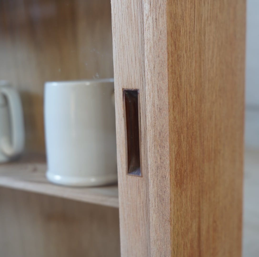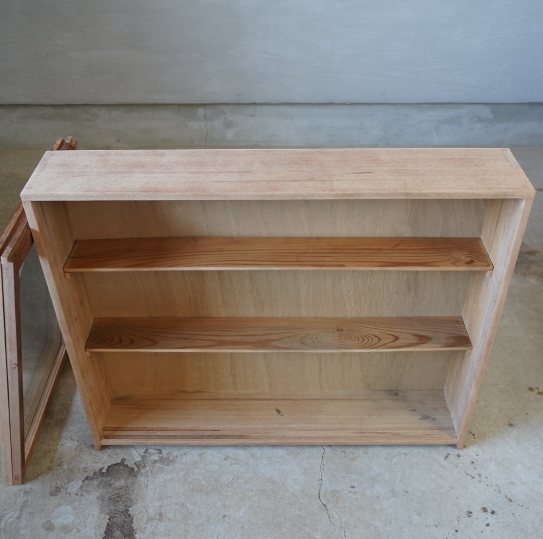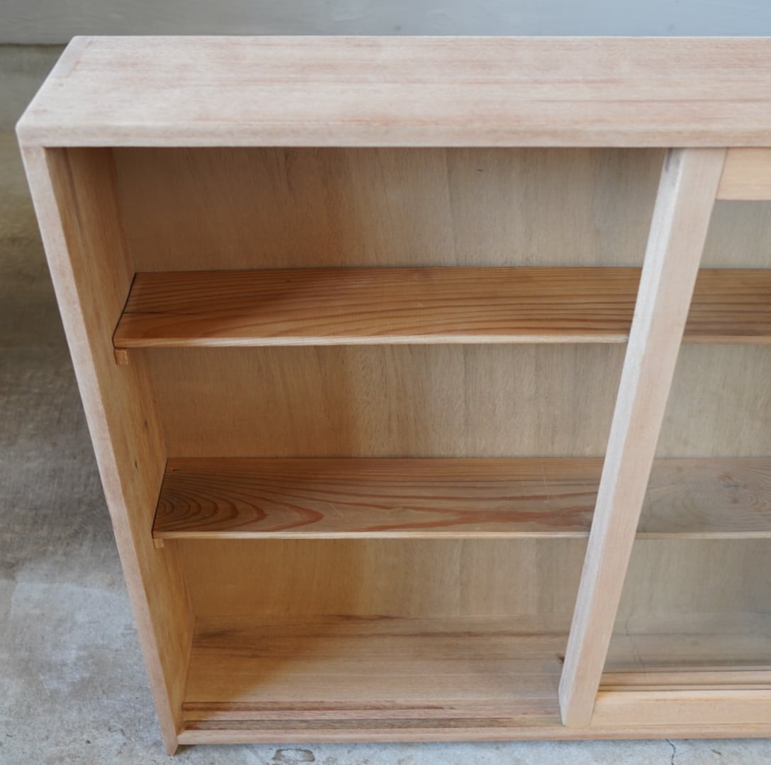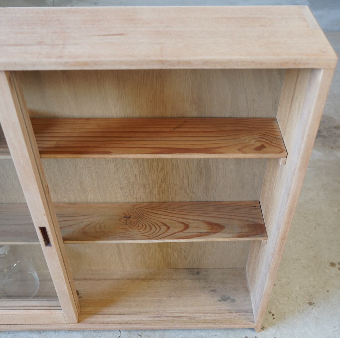 白木のナチュラルな木味と大きなガラスの引き戸が中に収めるお品物の魅力を引き立てます。