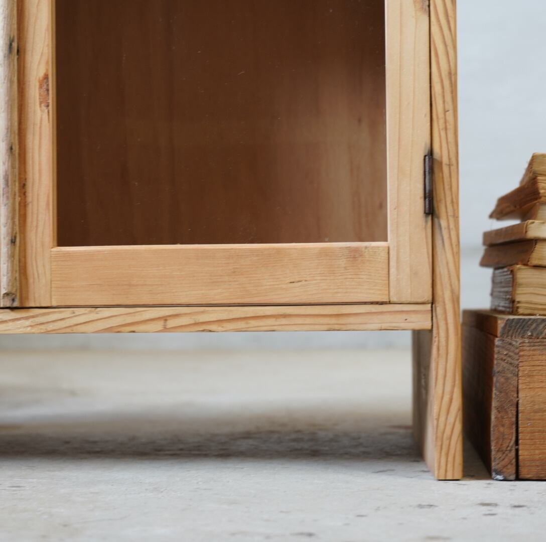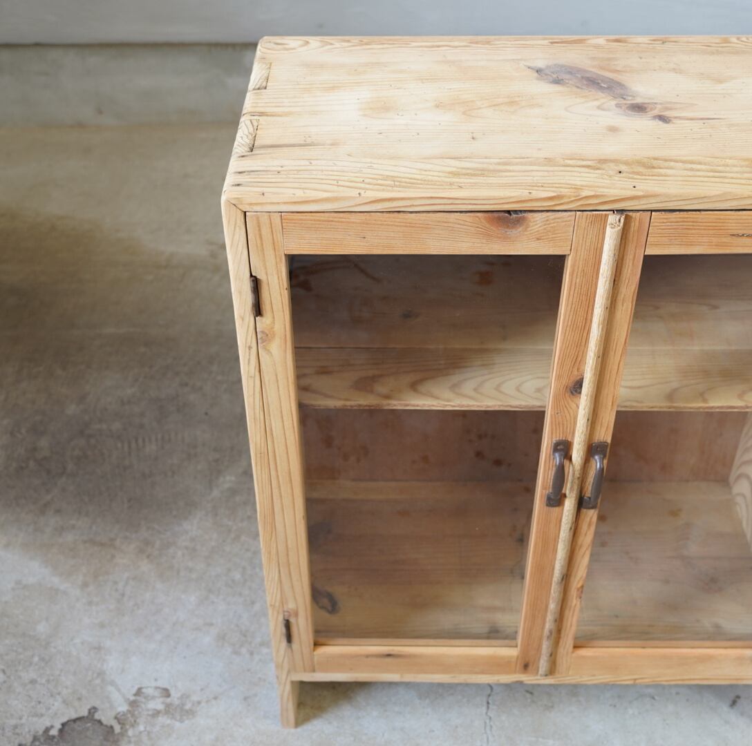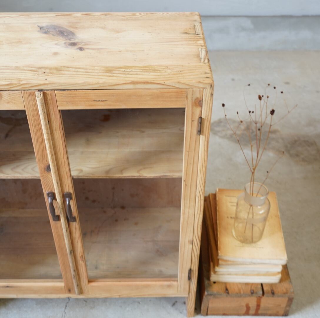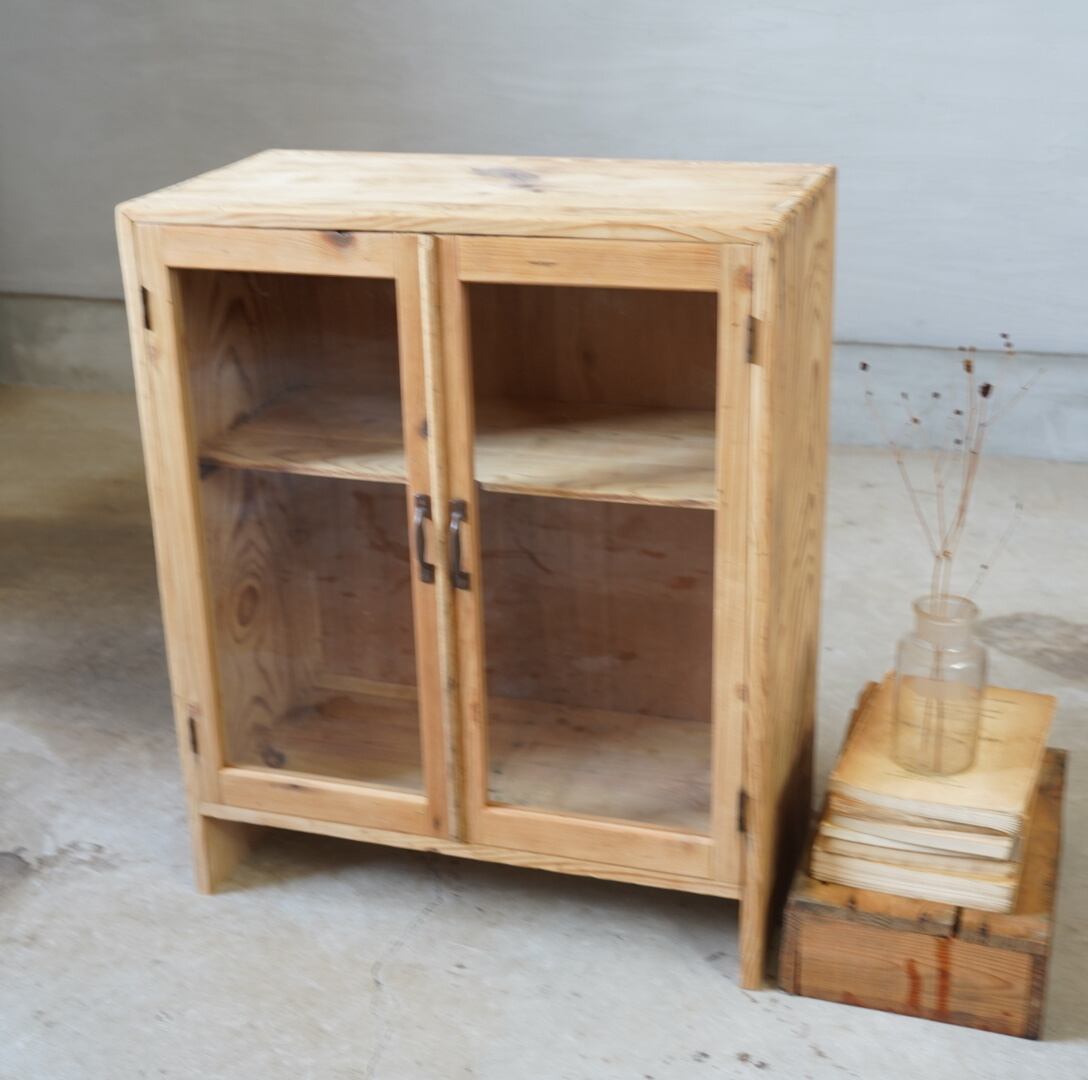 白木のナチュラルな木味と大きなガラスの開き戸が美しいキャビネットです。