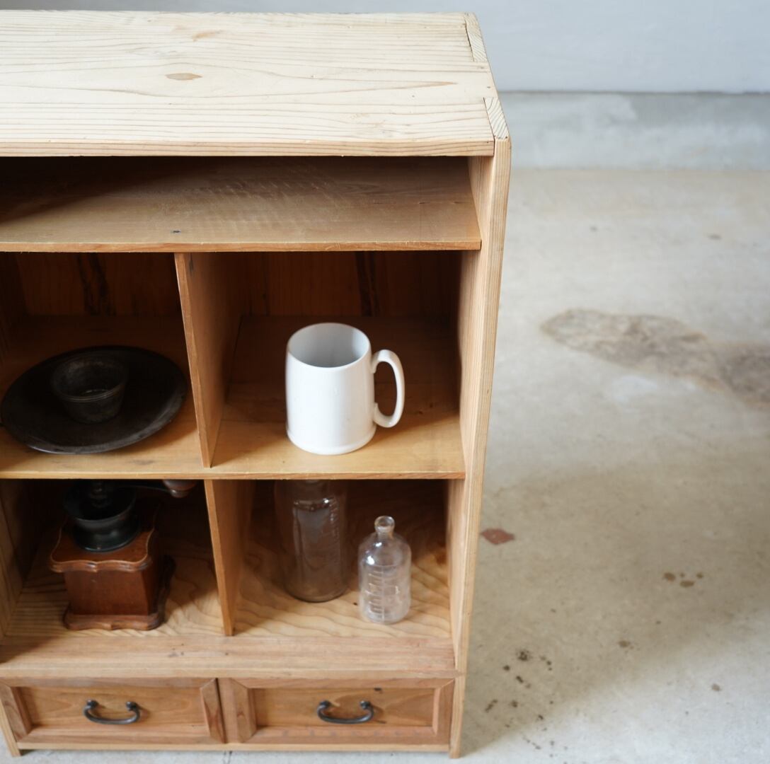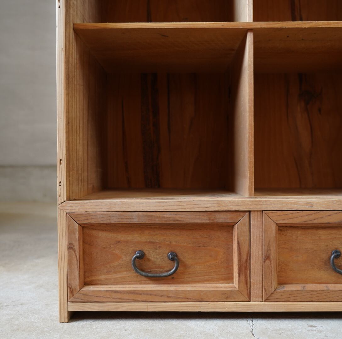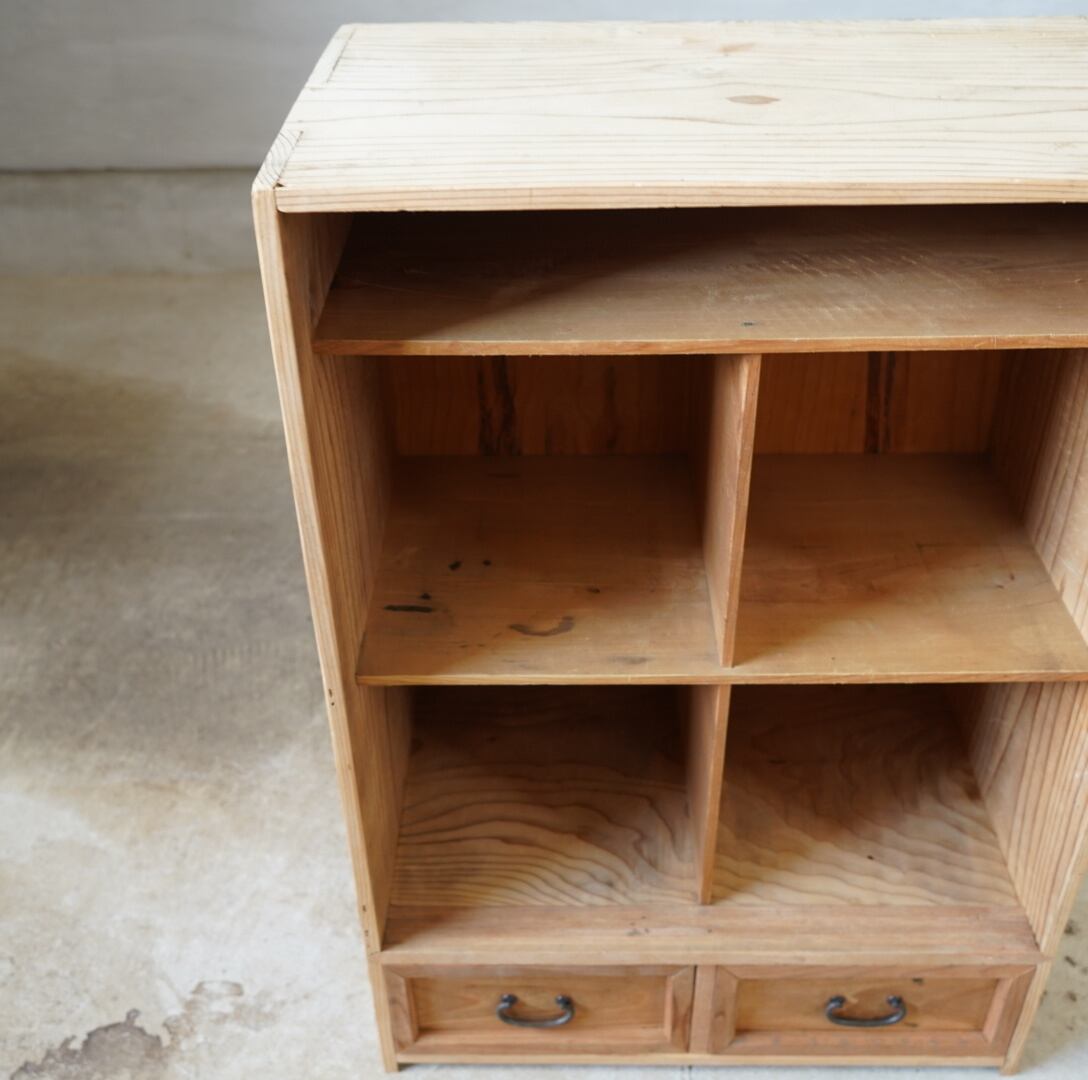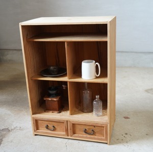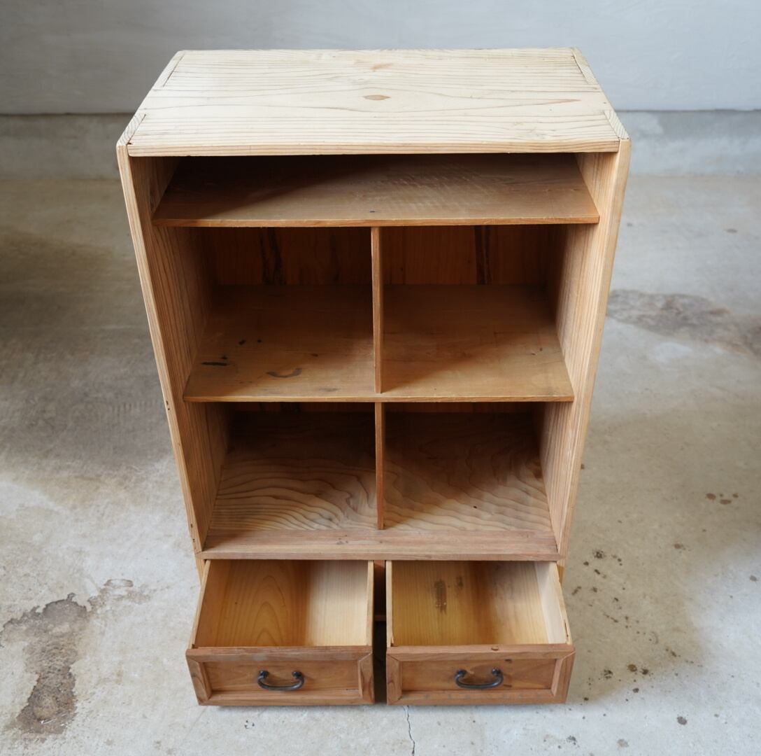 すっかりと色の抜けた古木の風合いと2杯の引き出しが美しい木製棚です。