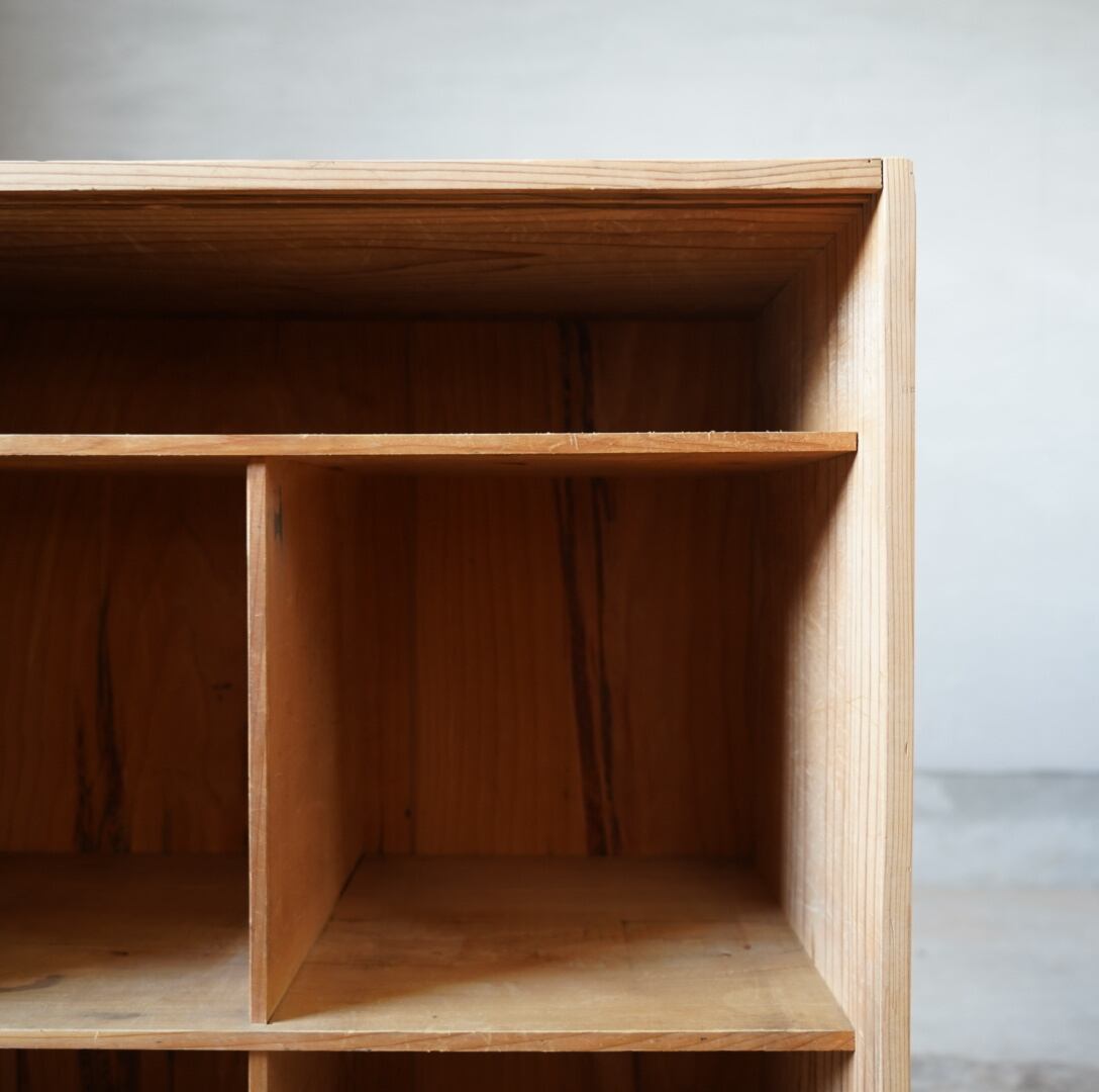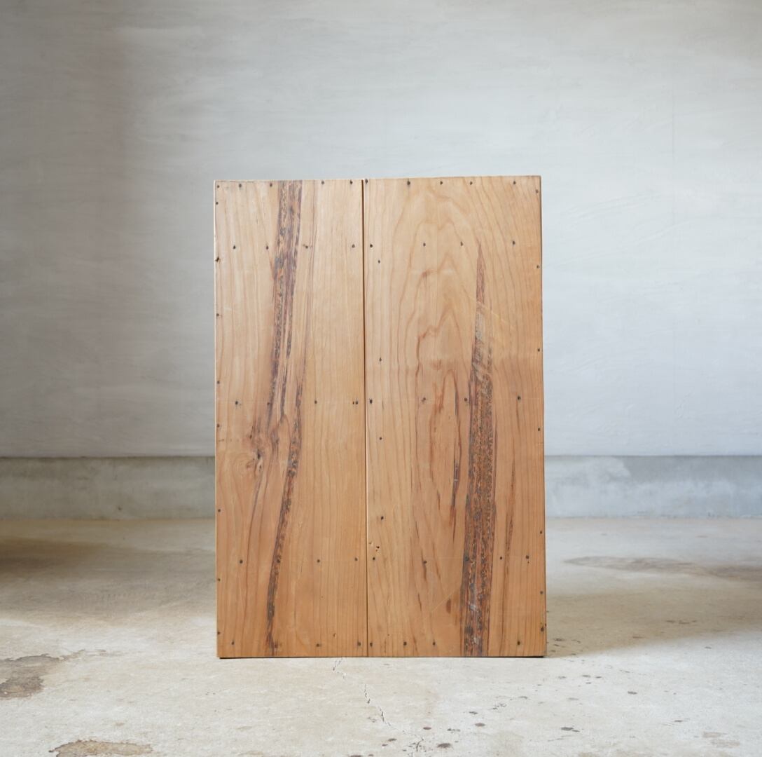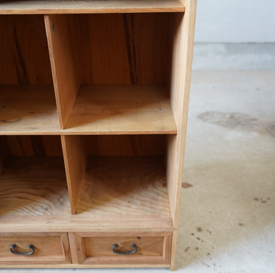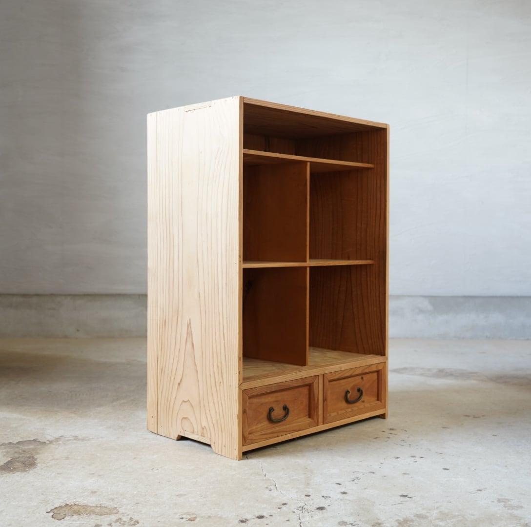 すっかりと色の抜けた古木の風合いと2杯の引き出しが美しい木製棚です。