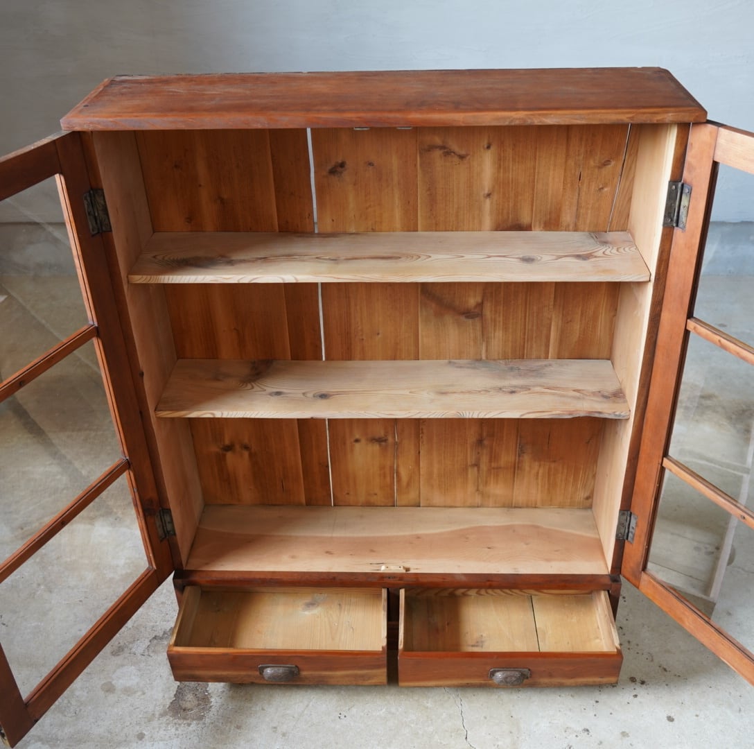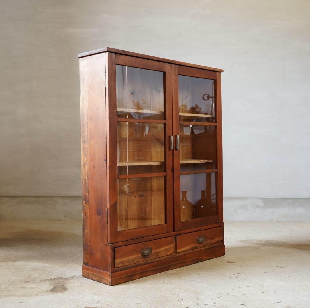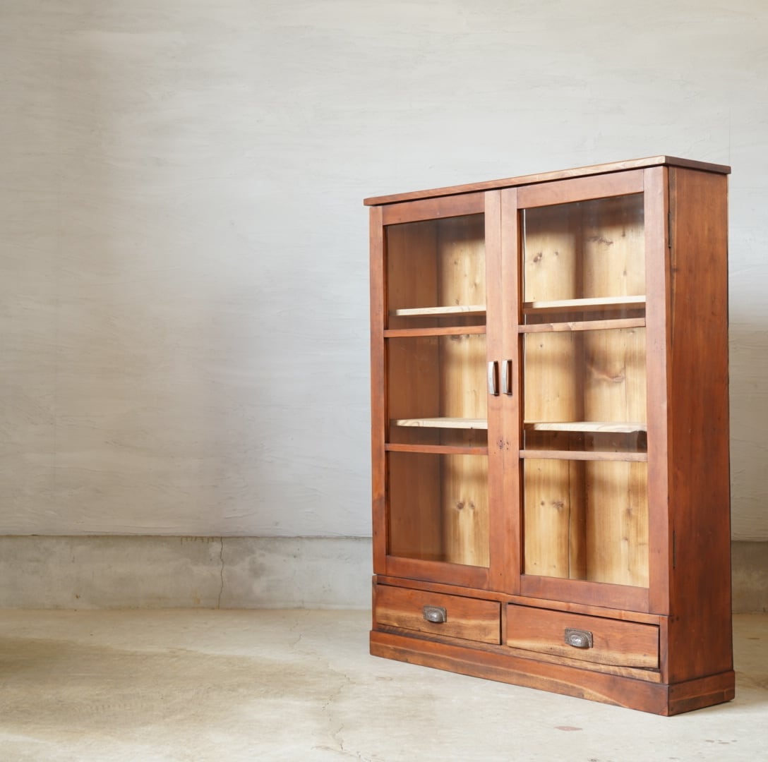 無垢材の温かみのある経年変化と大きな格子ガラスの開き戸が美しいキャビネットです。