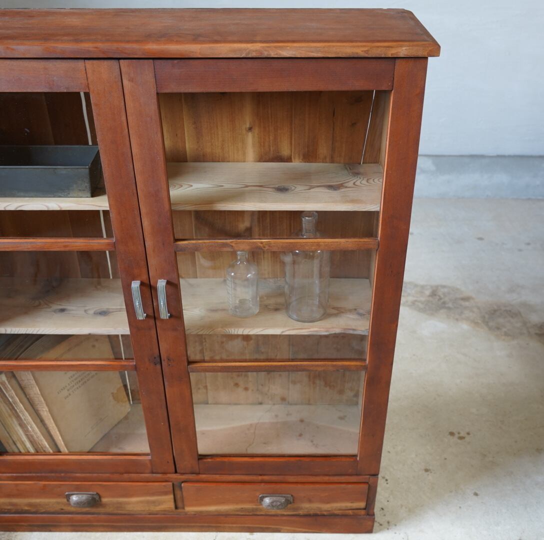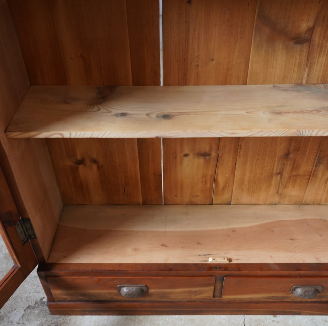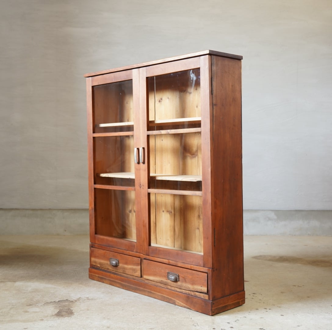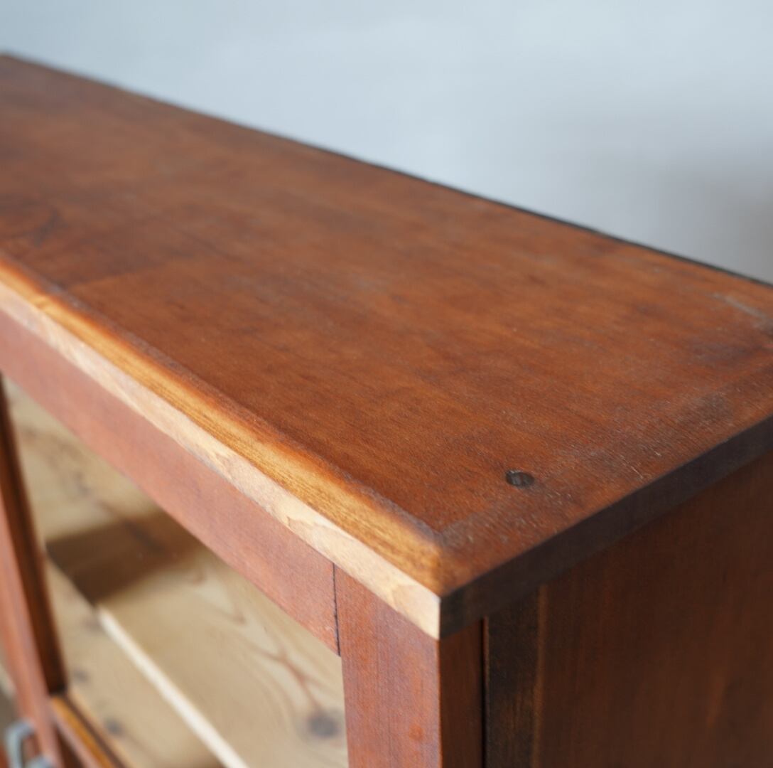 無垢材の温かみのある経年変化と大きな格子ガラスの開き戸が美しいキャビネットです。