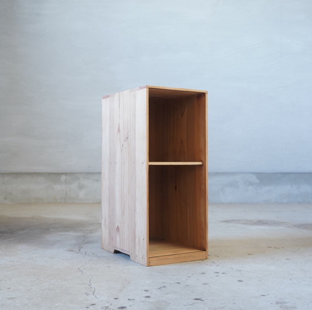 すっかりと色の抜けた古木の風合いが美しい2段の木製棚です。