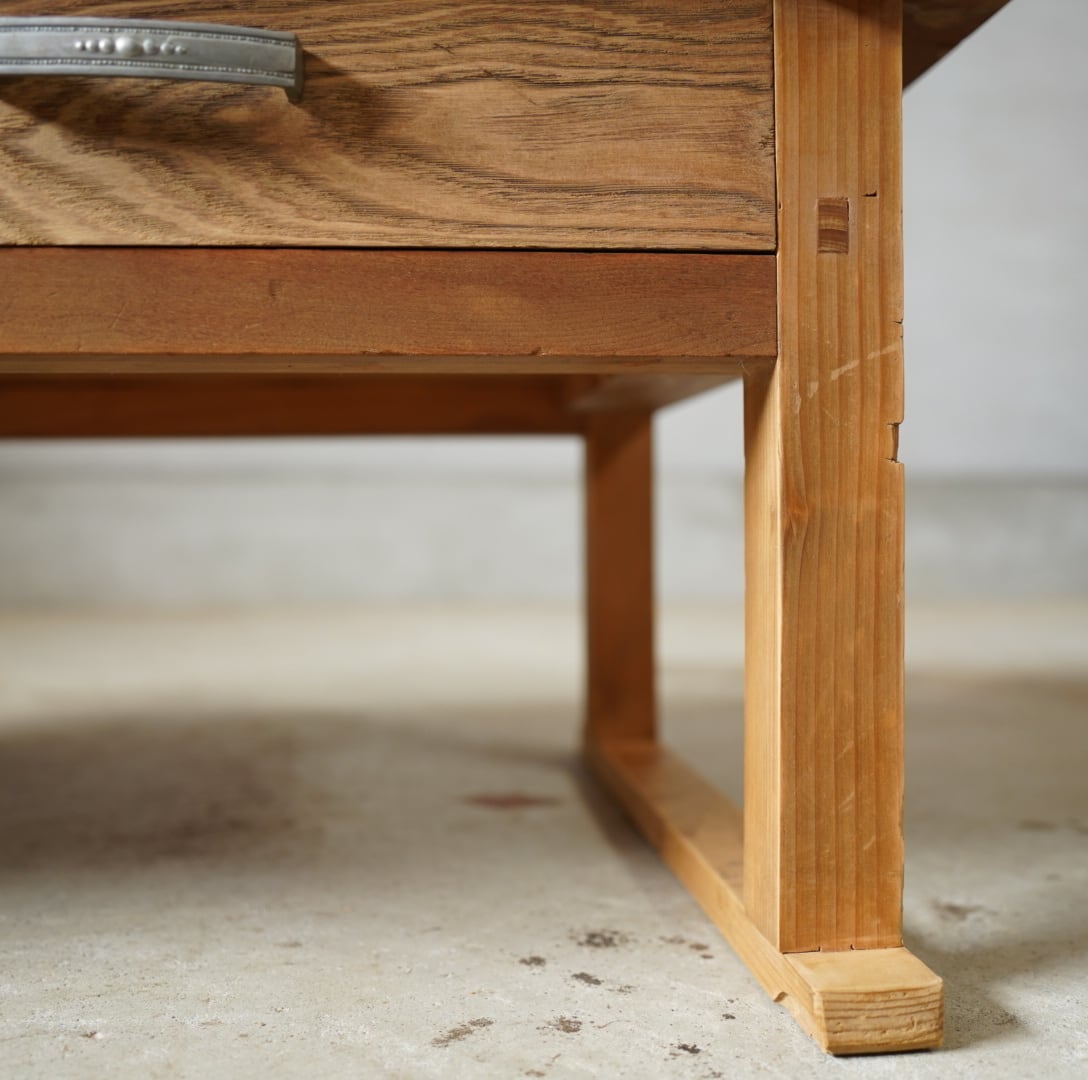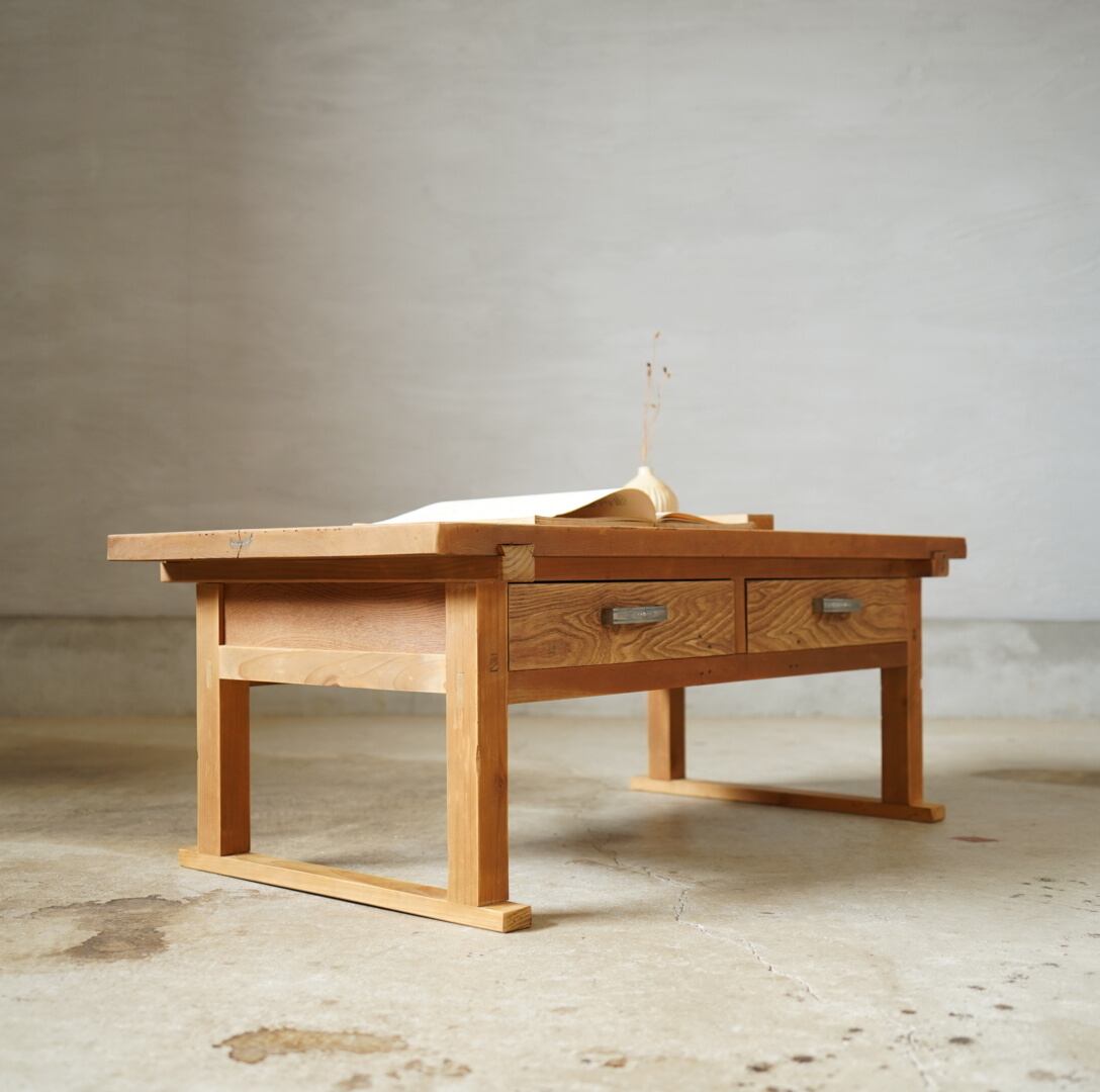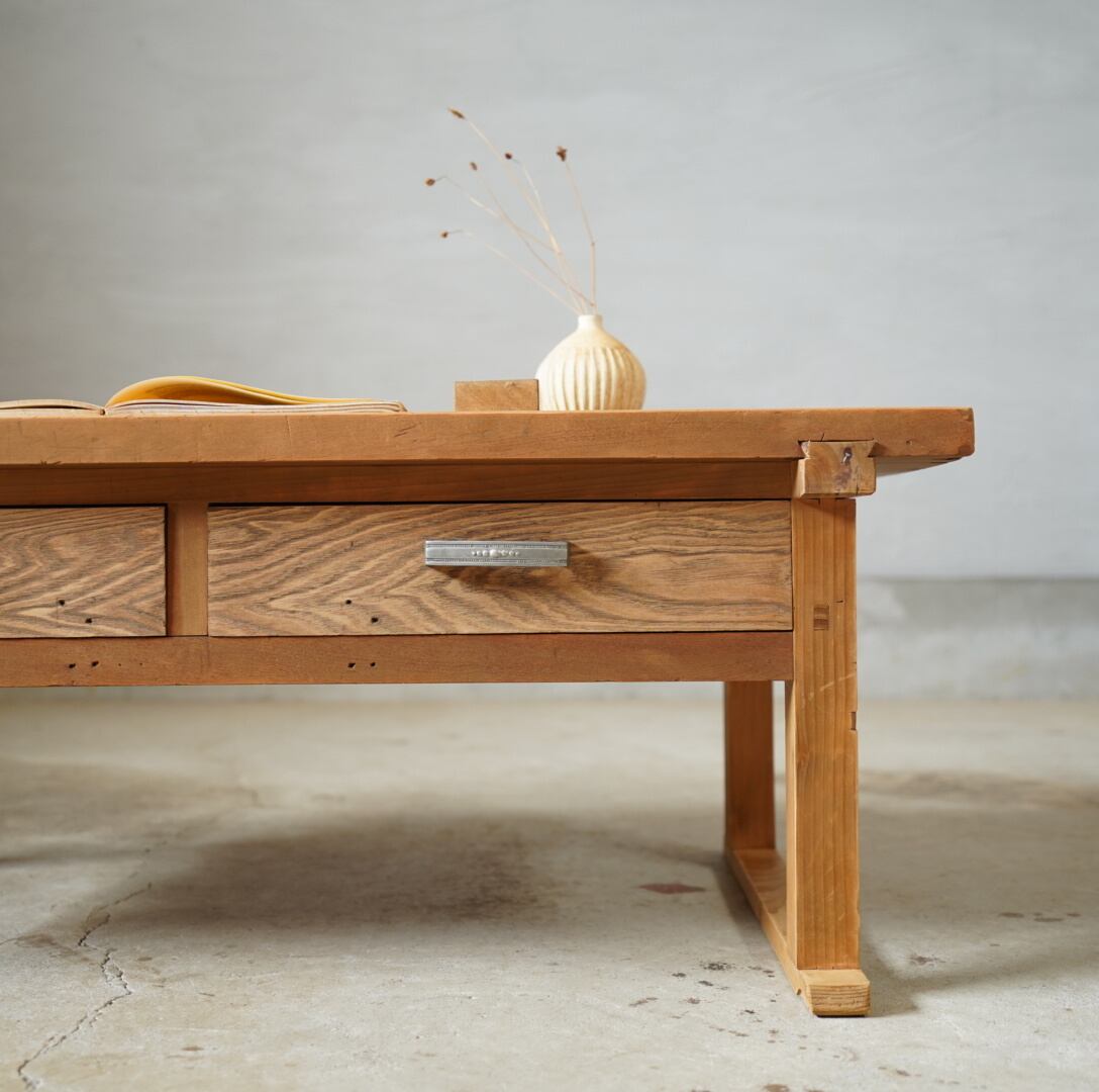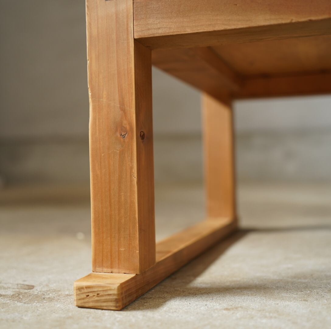 天板には一枚板がつかわれ、木材を組むようにしてつくられており、どっしりとした重厚感があります。