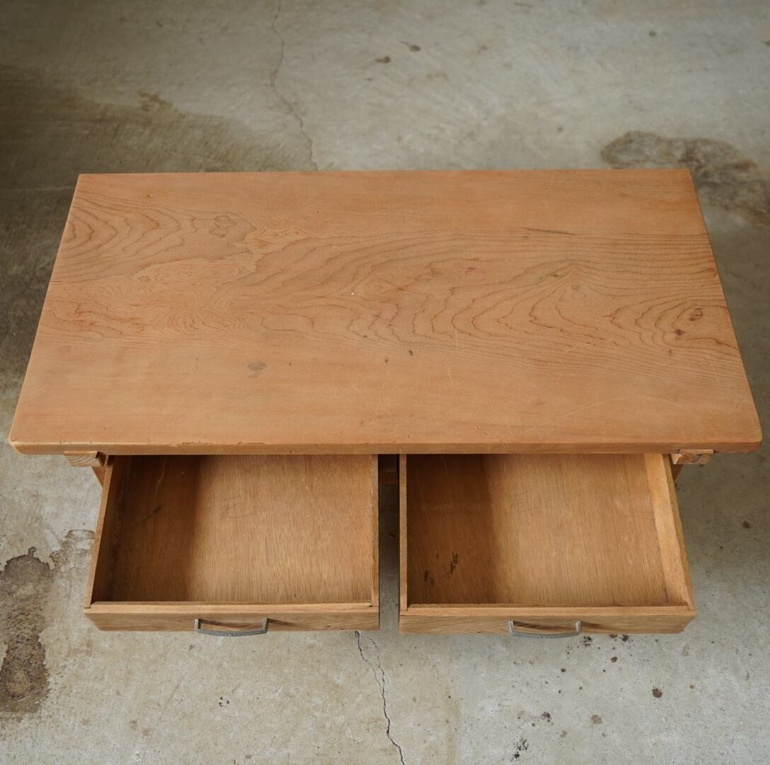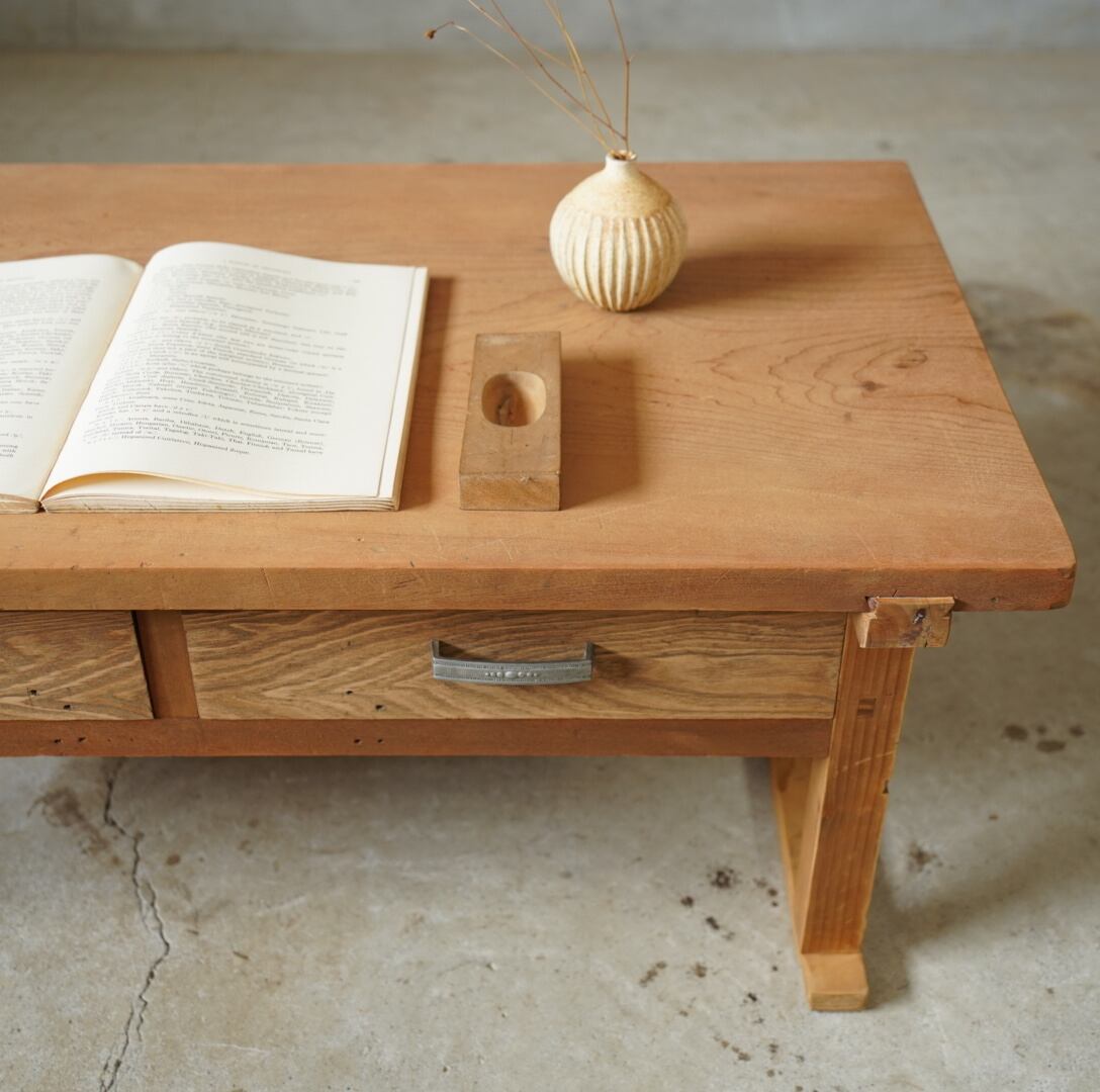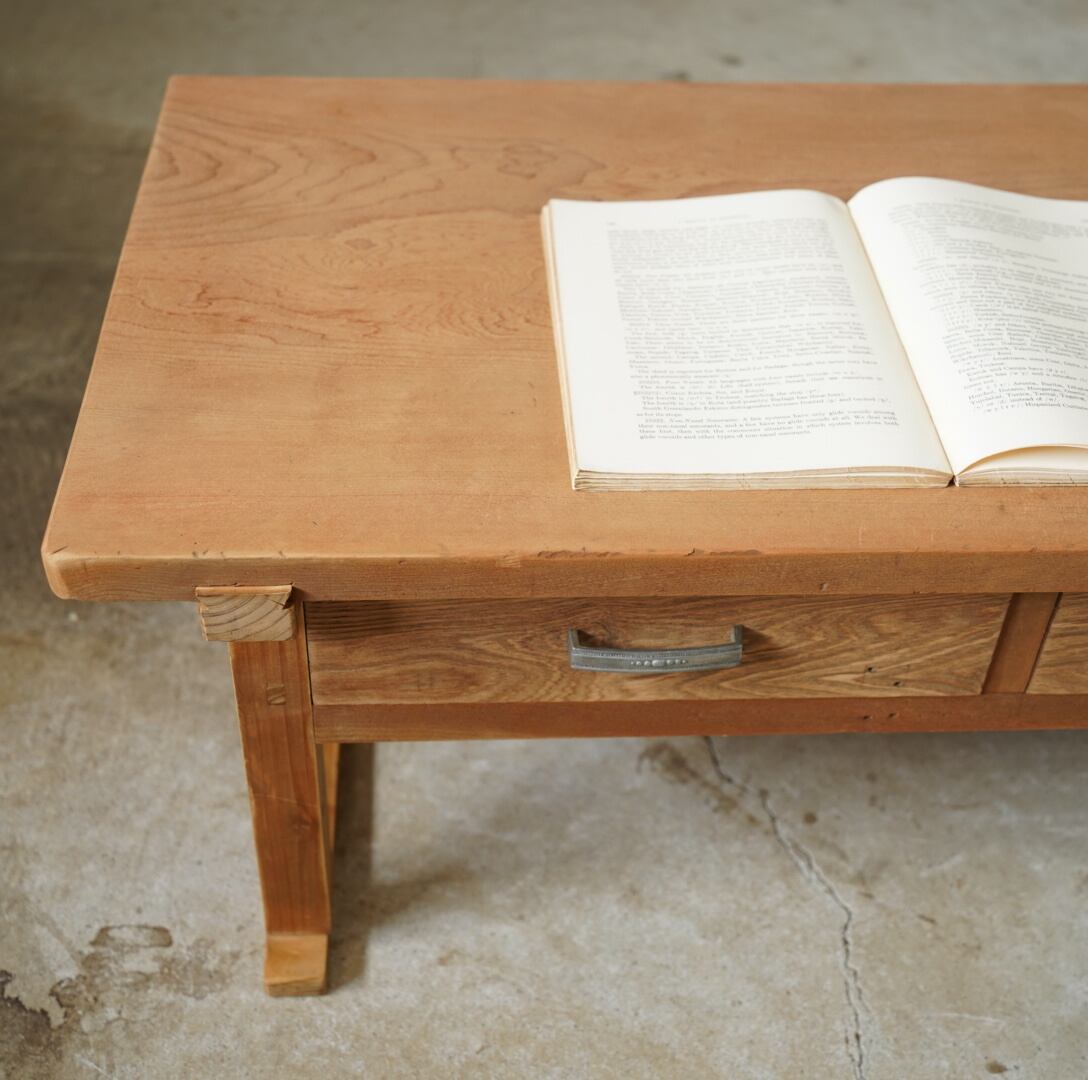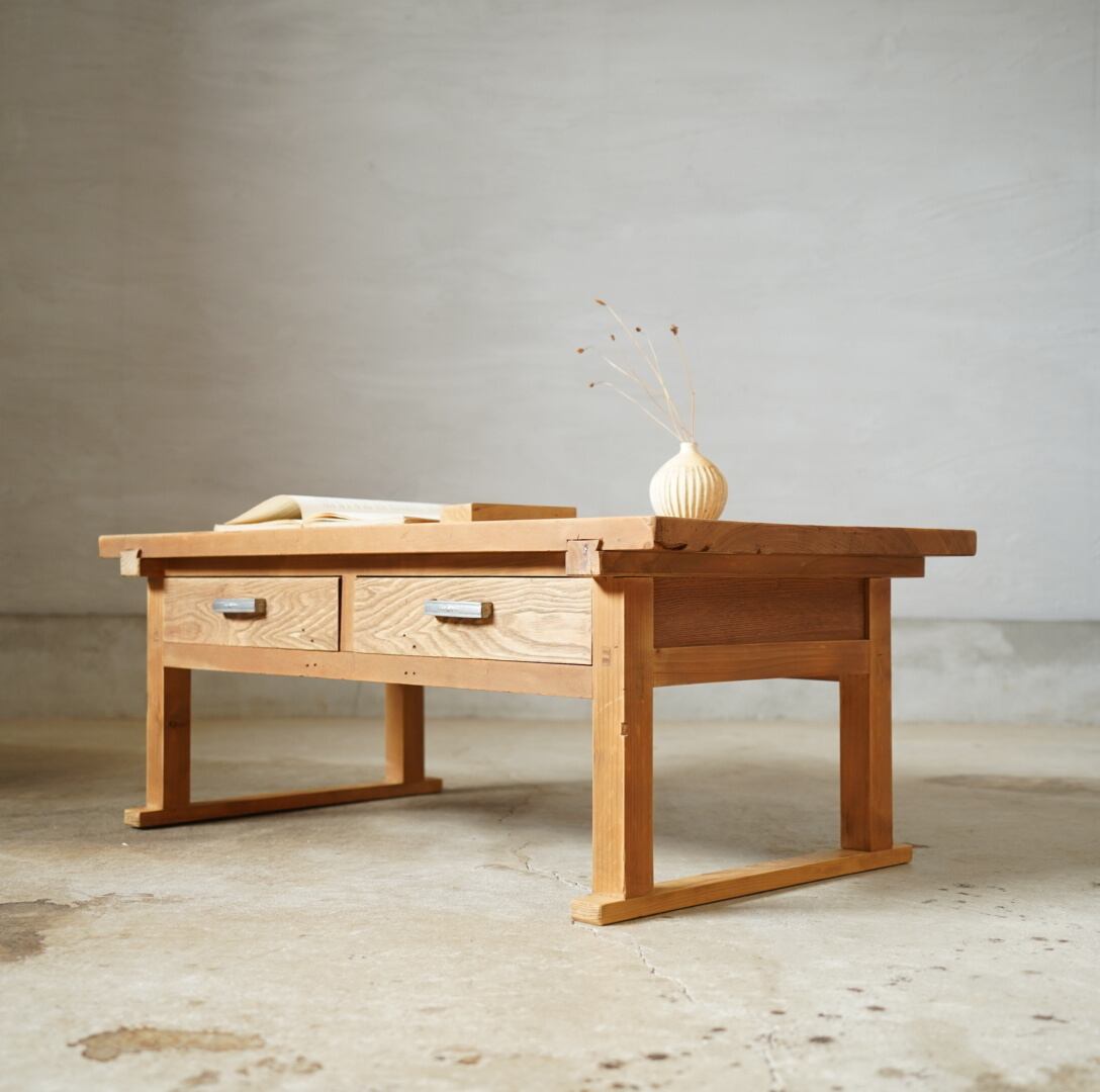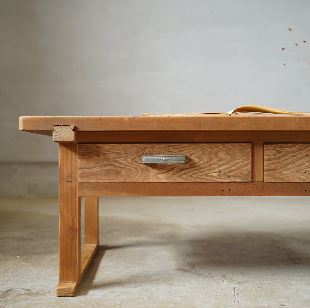無垢材のナチュラルな木味と金属取手の引き出しが美しいコーヒーテーブルです。