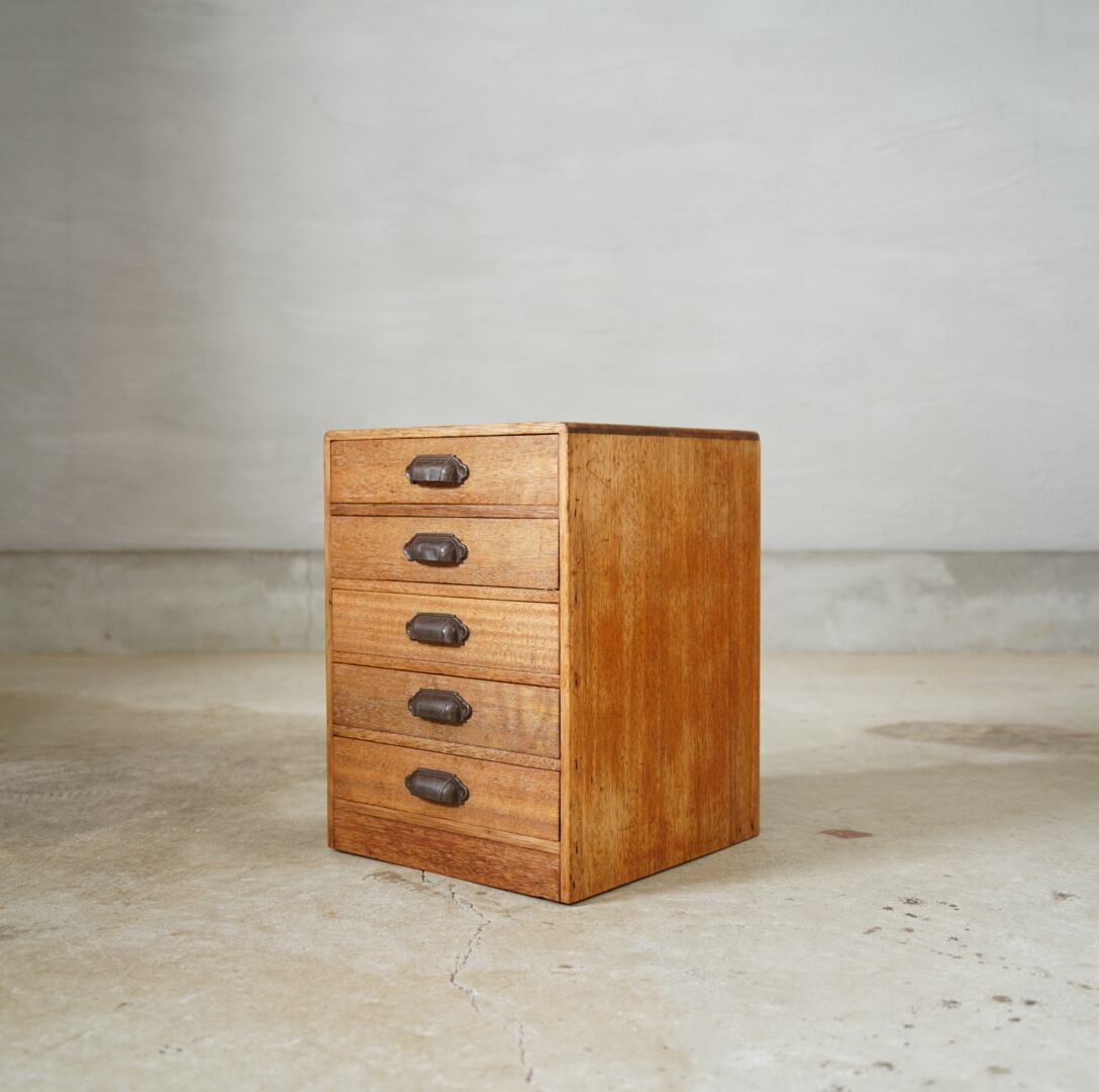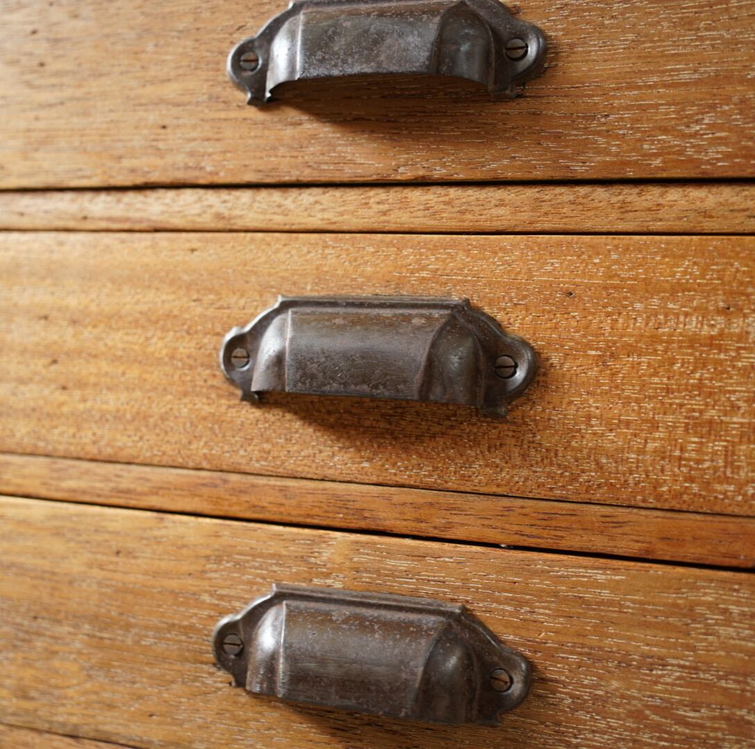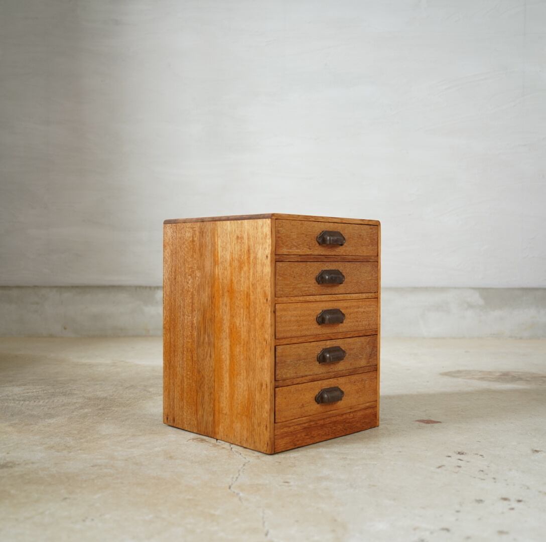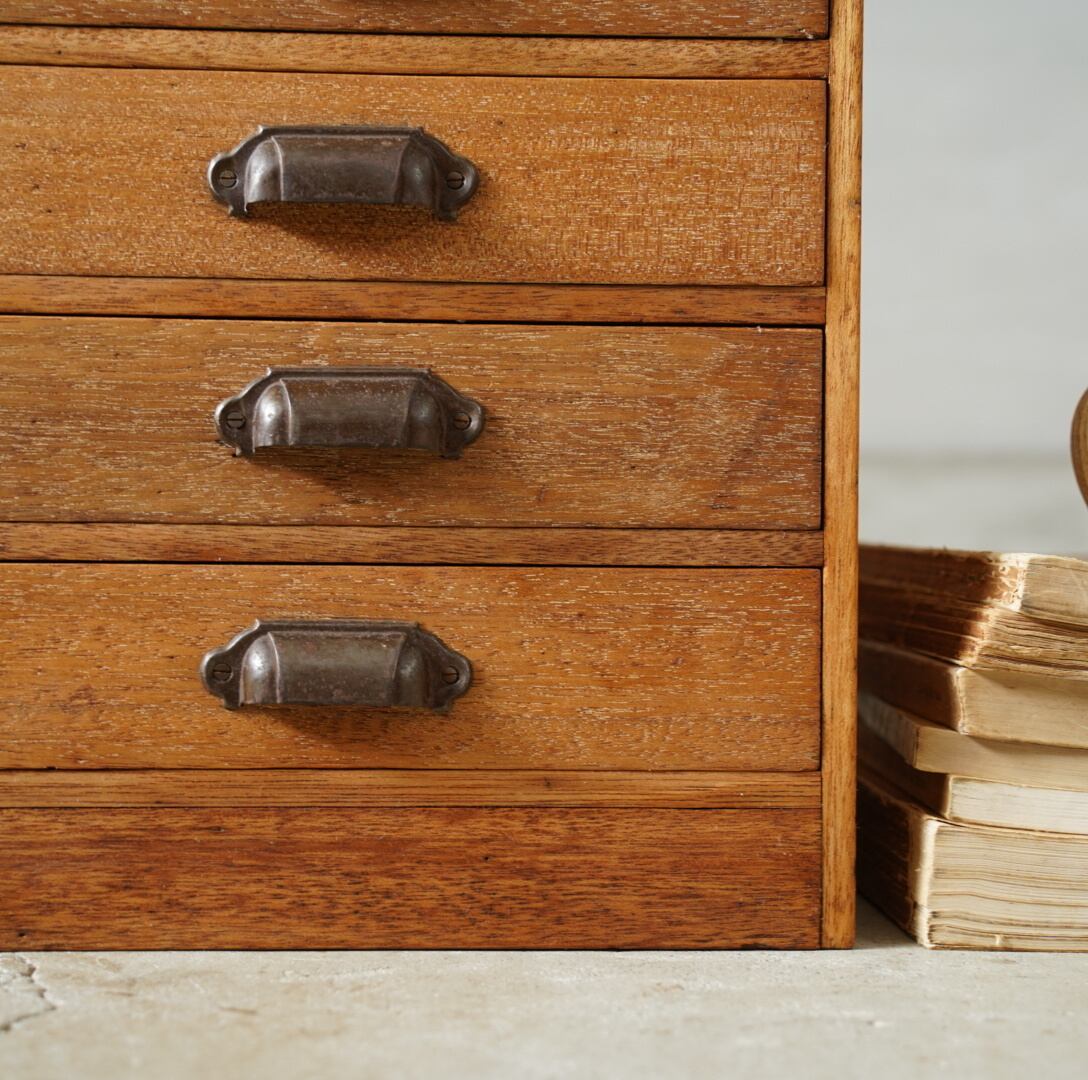 温かみのある経年変化と黒い金属取手が魅力的な古い5杯の引き出しです。
