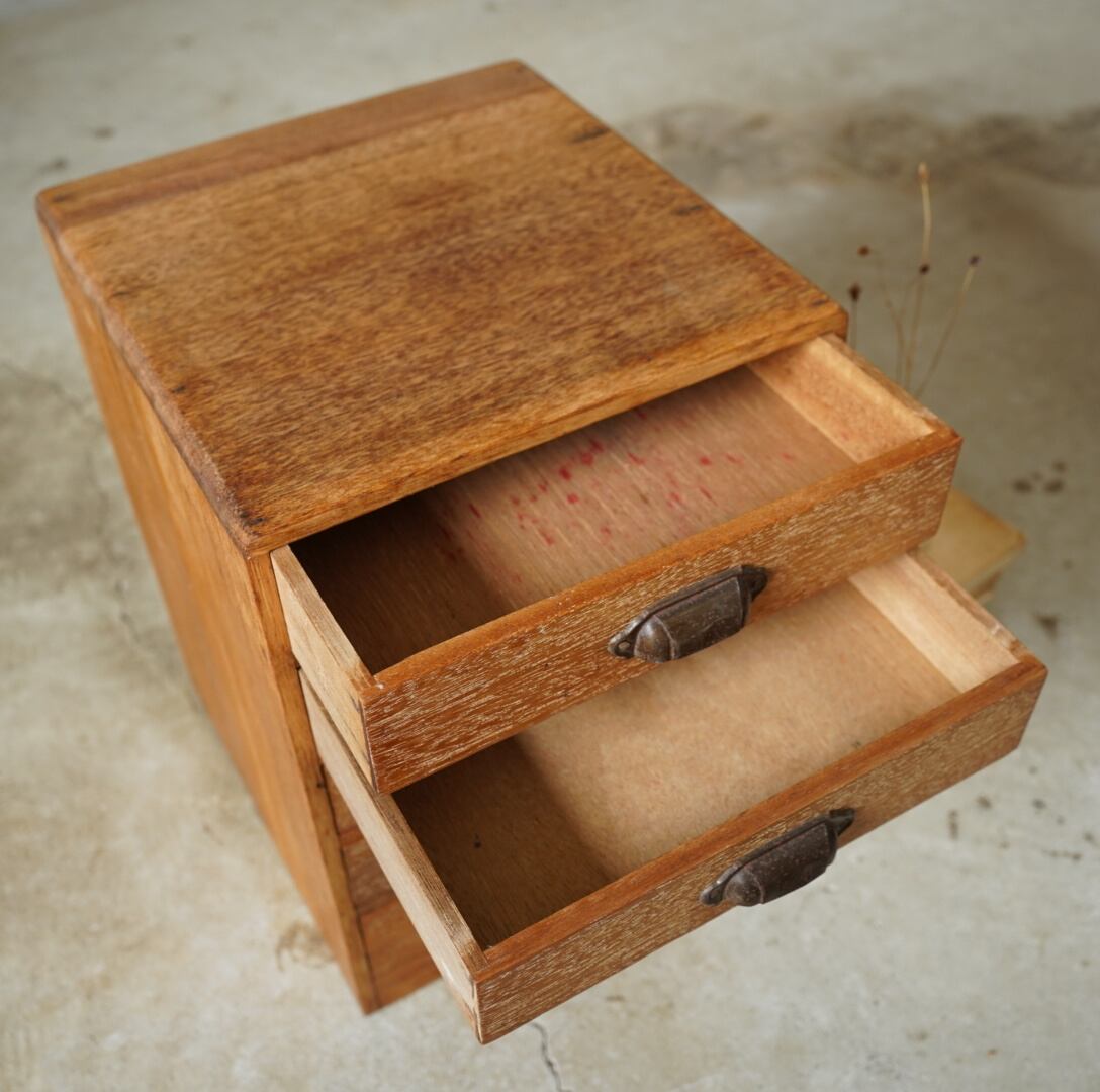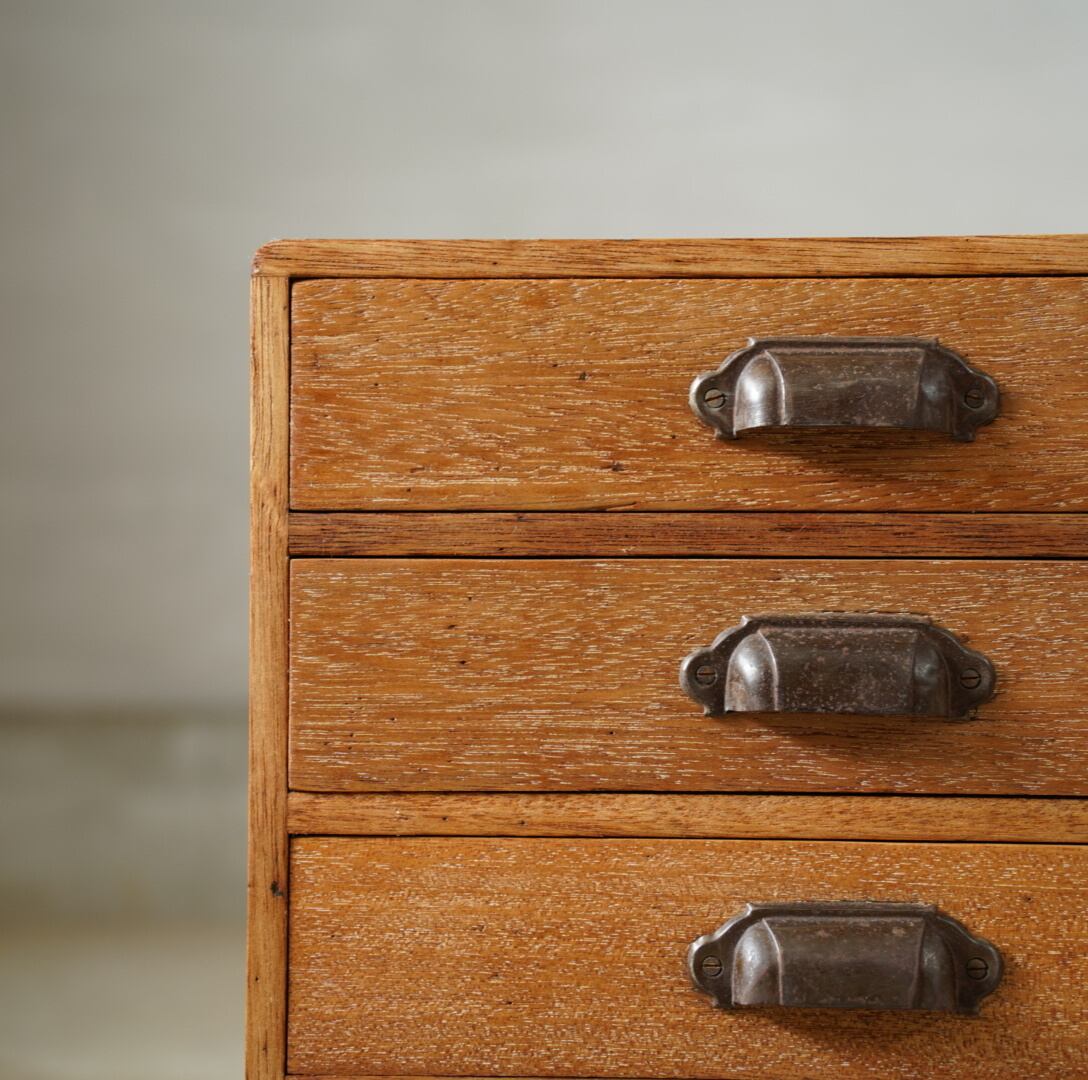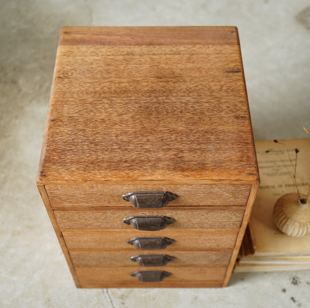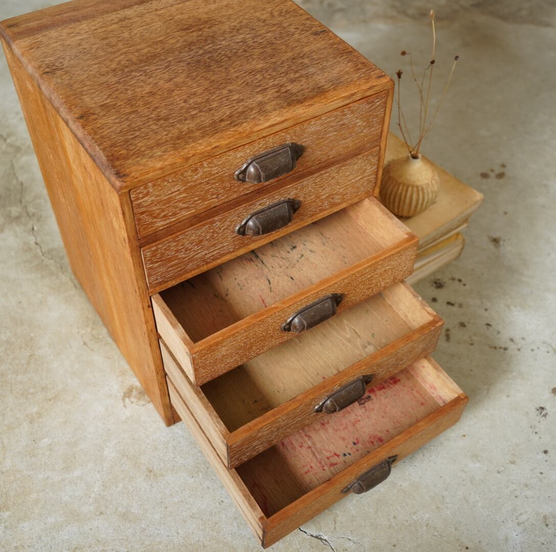 温かみのある経年変化と黒い金属取手が魅力的な古い5杯の引き出しです。
