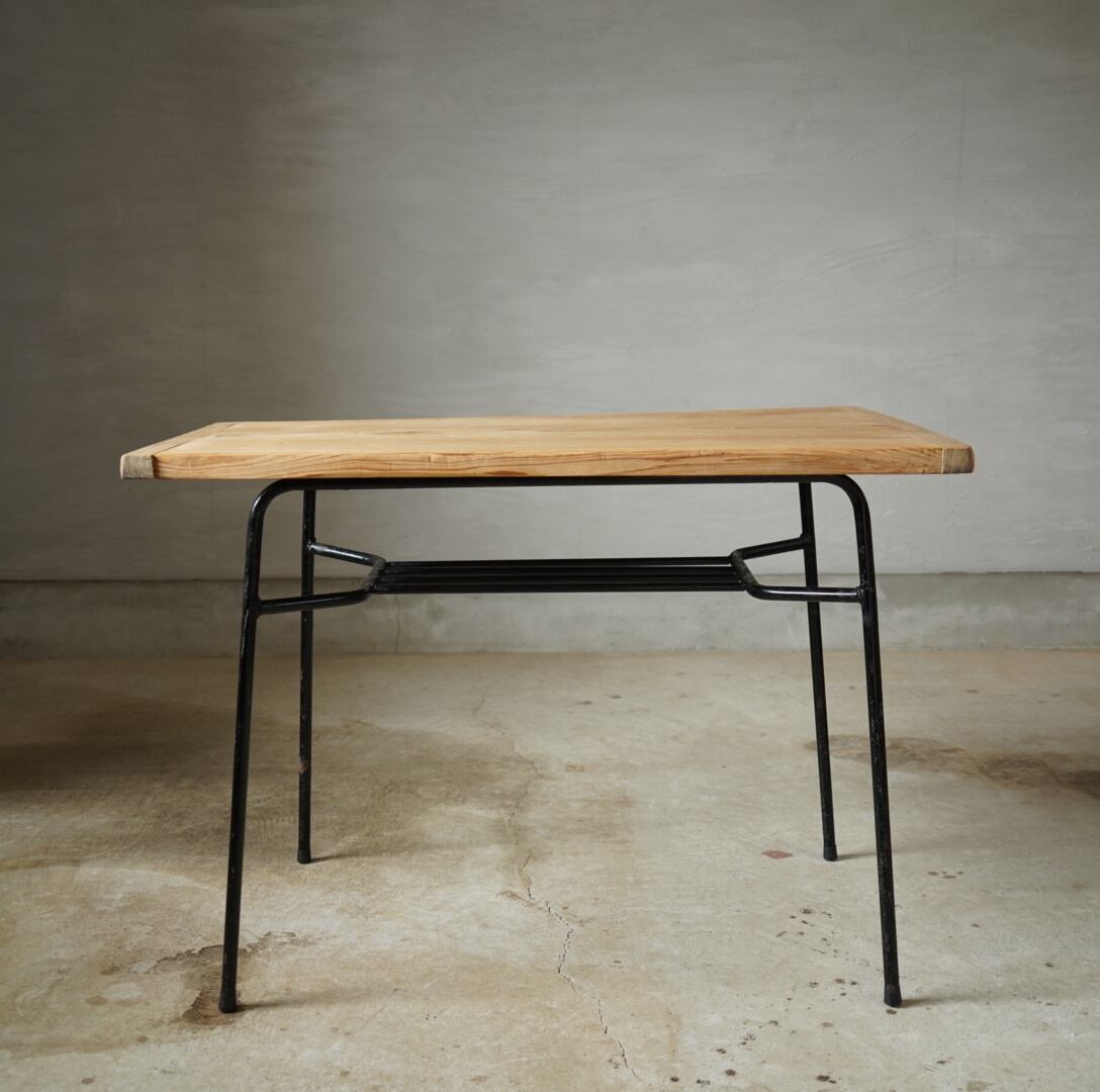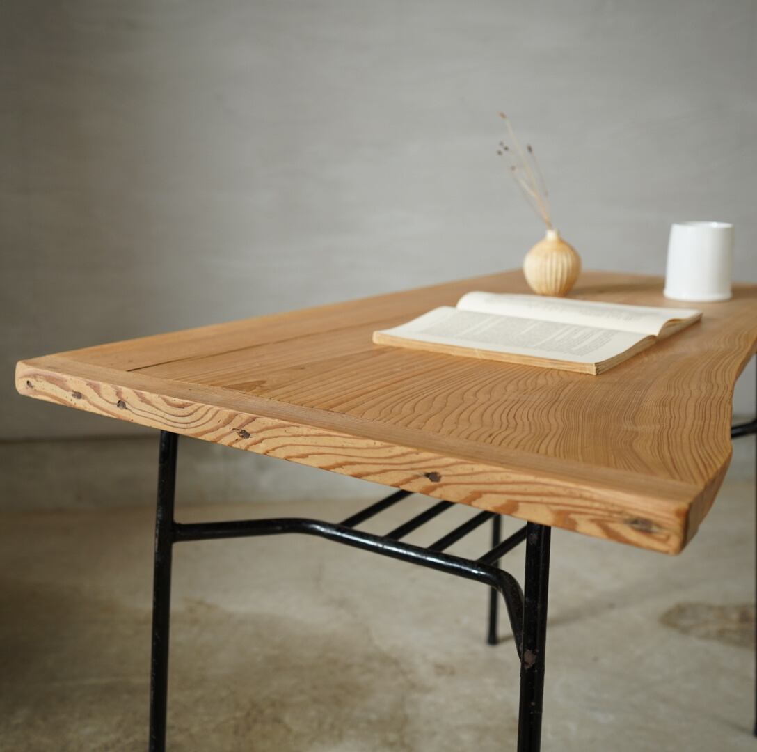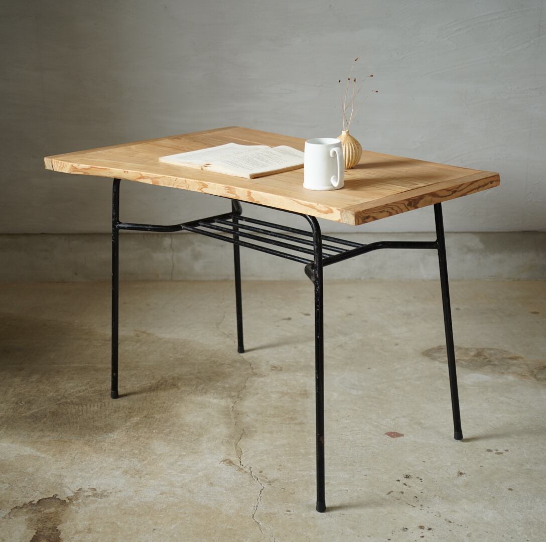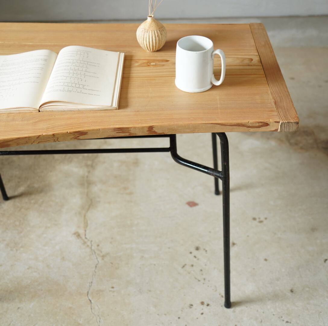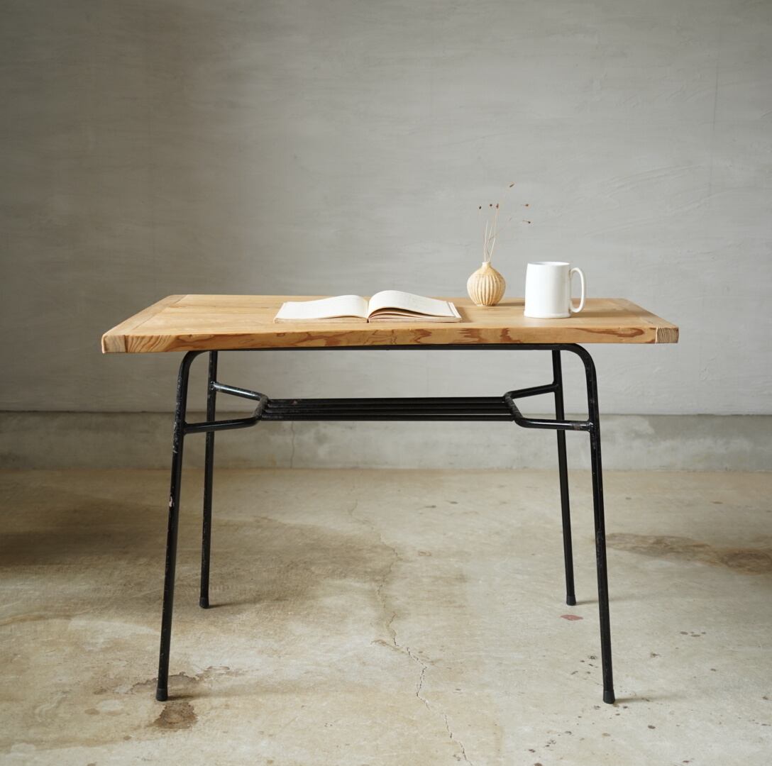 古材の天板に古いアイアン脚が合わせられたテーブル。