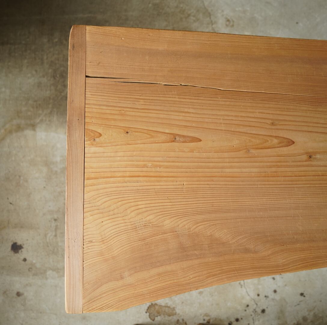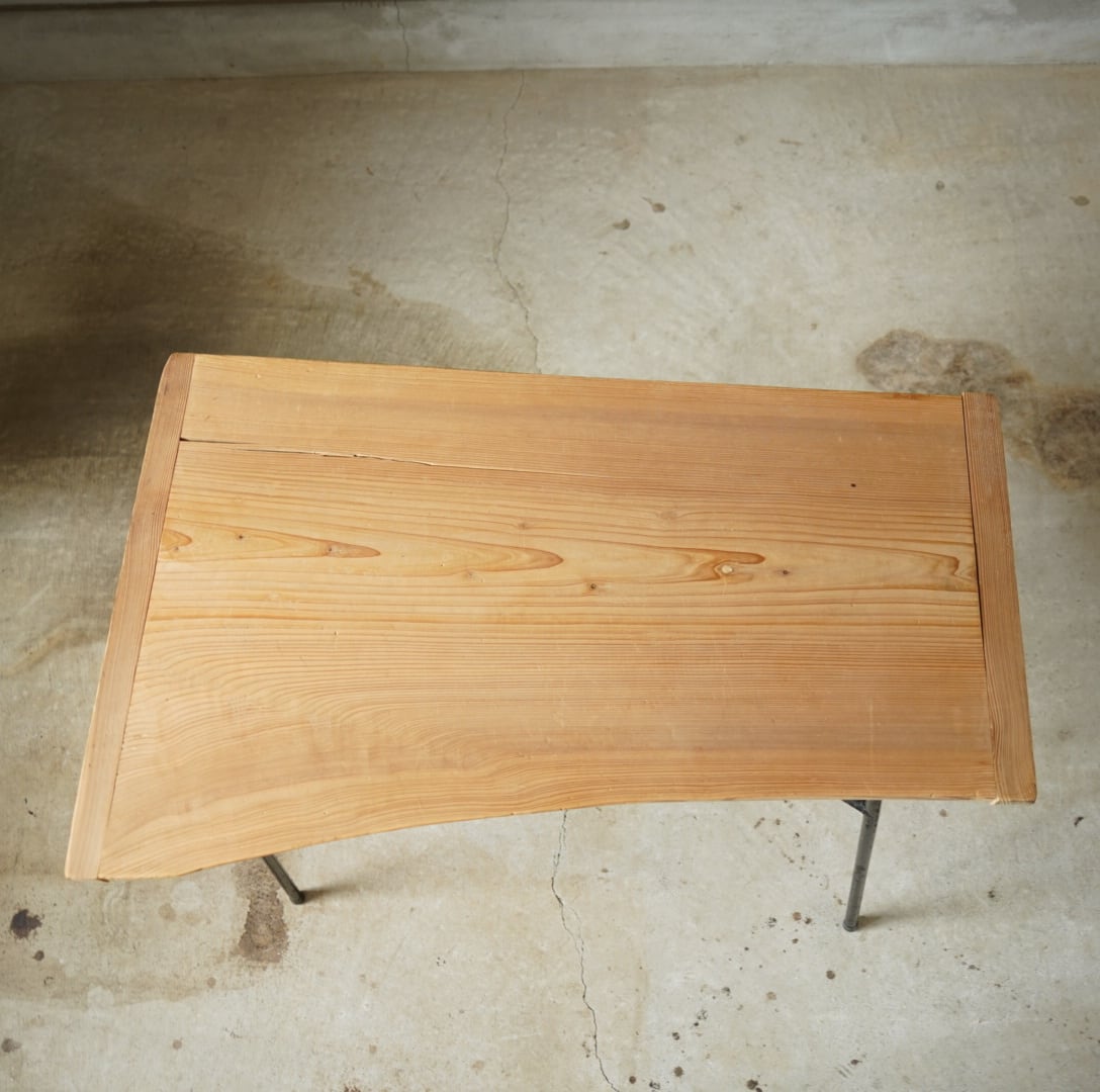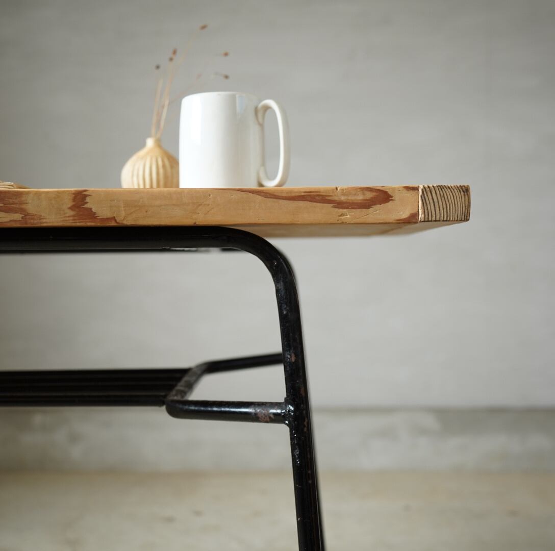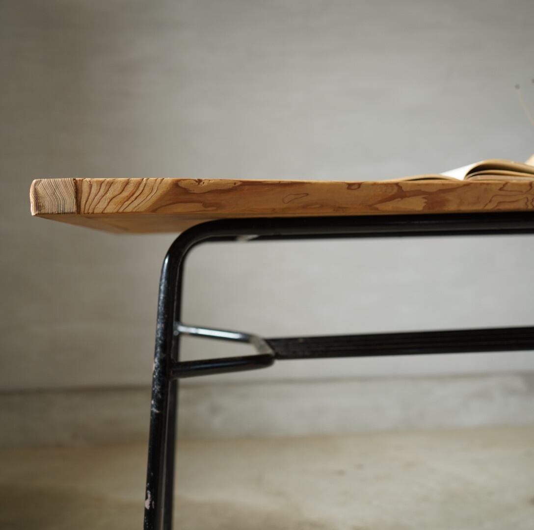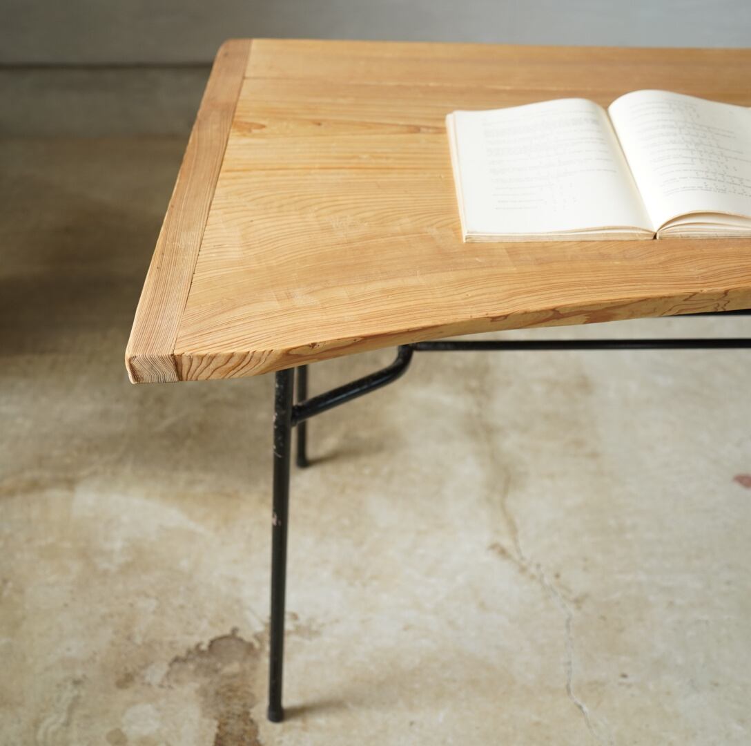 古材の天板に古いアイアン脚が合わせられたテーブル。