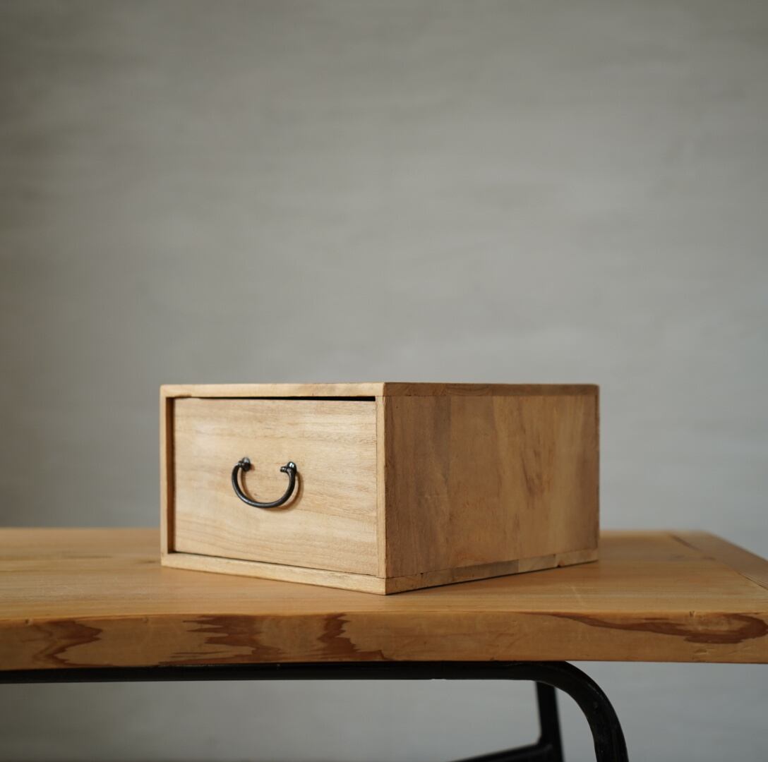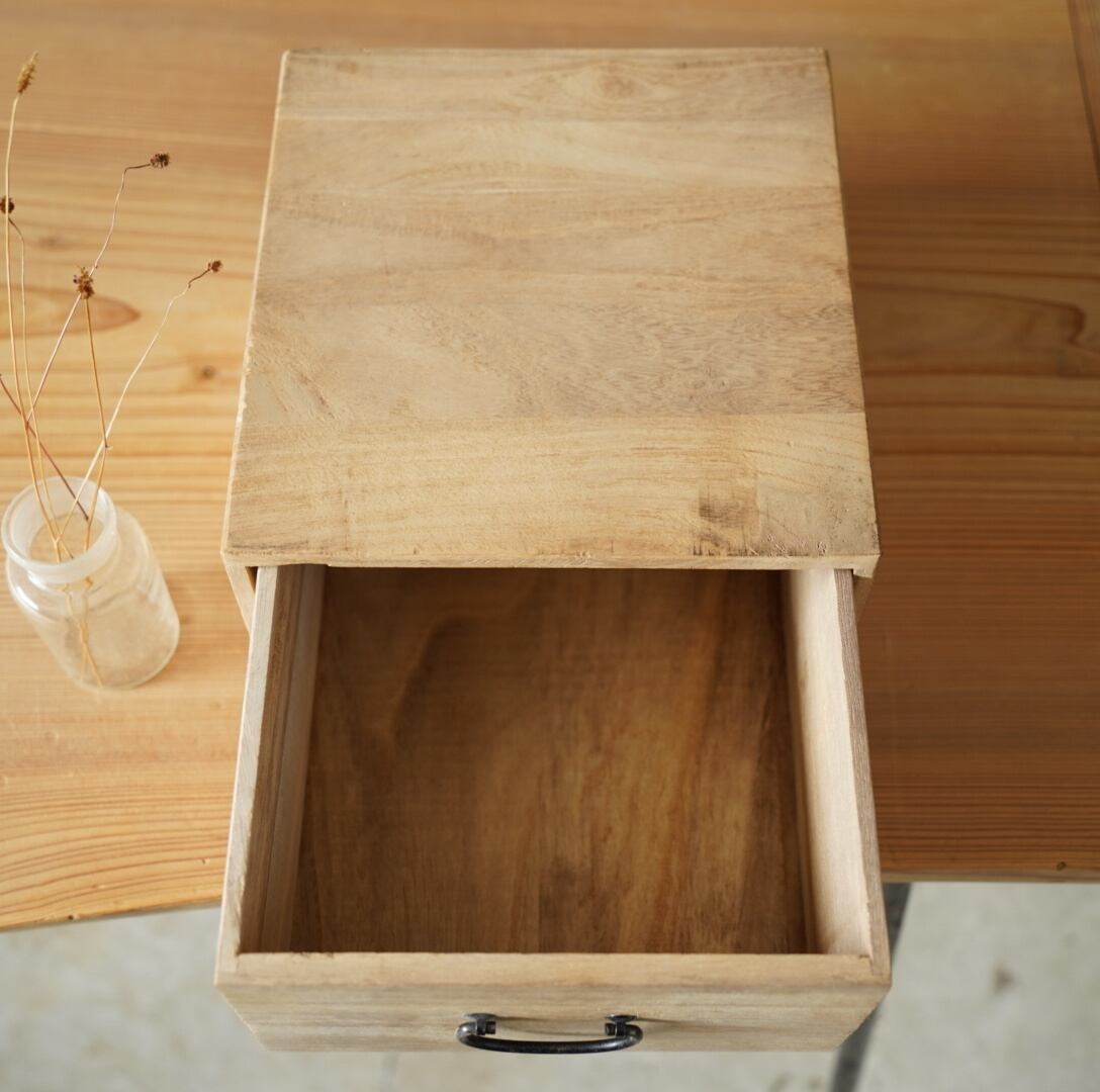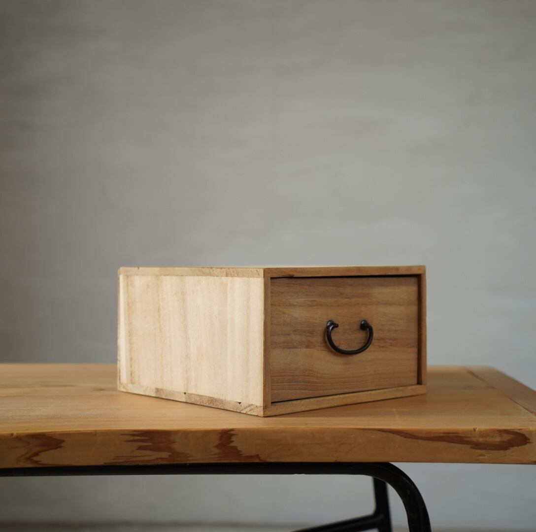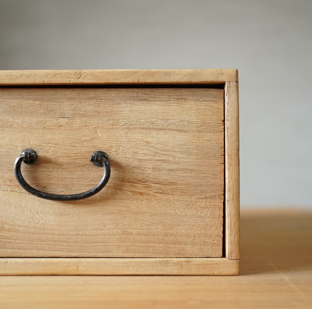 ナチュラルな木味と黒い金属の取手が可愛らしい1杯の小引き出しです。