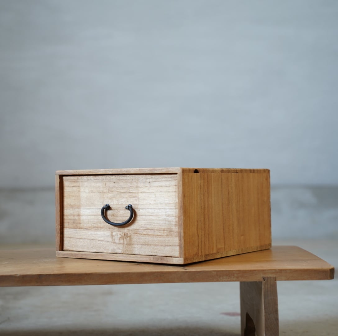 ナチュラルな木味と黒い金属の取手が可愛らしい1杯の小引き出しです。