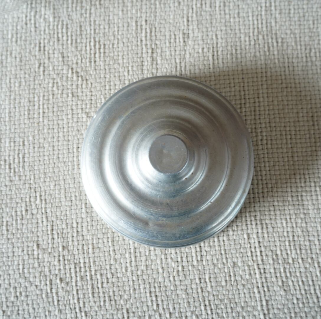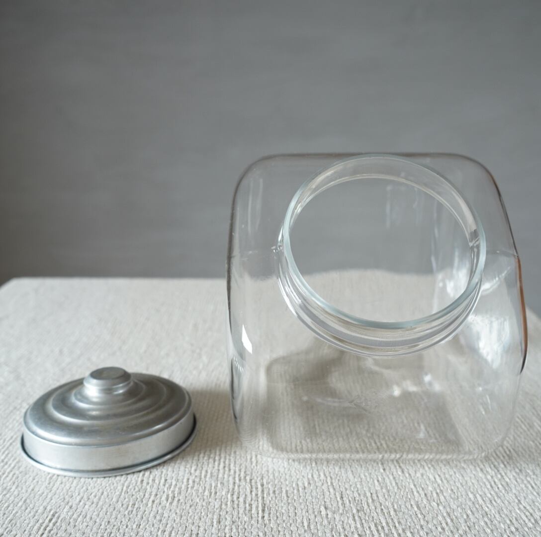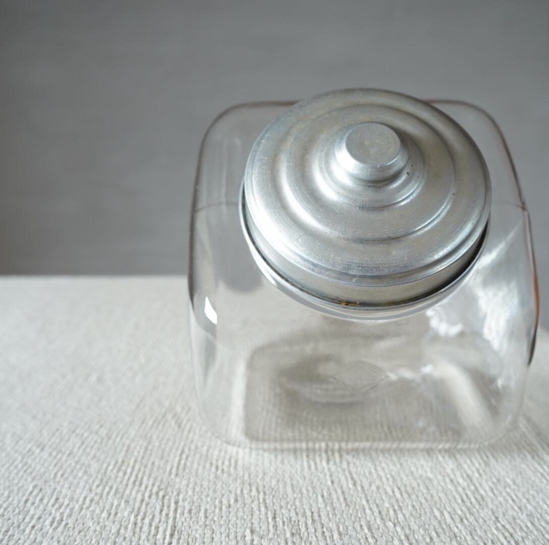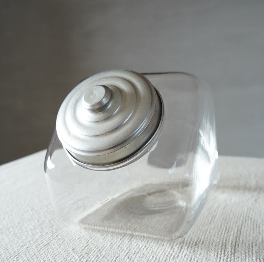 ゆらぎのあるガラスと経年変化のあるアルミの蓋が美しい古いガラス瓶です。