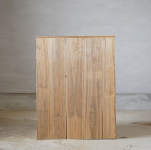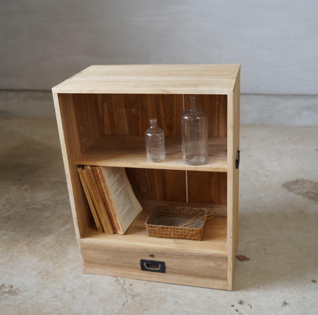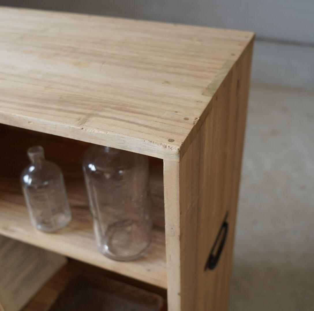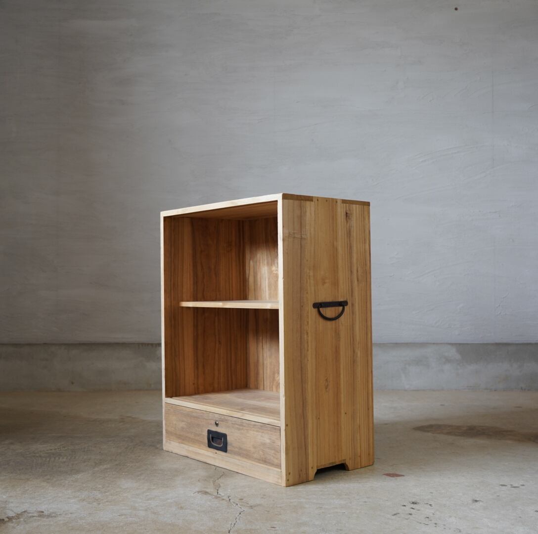 無垢材のナチュラルな木味と黒い金属取手の引き出しが美しい木製棚です。