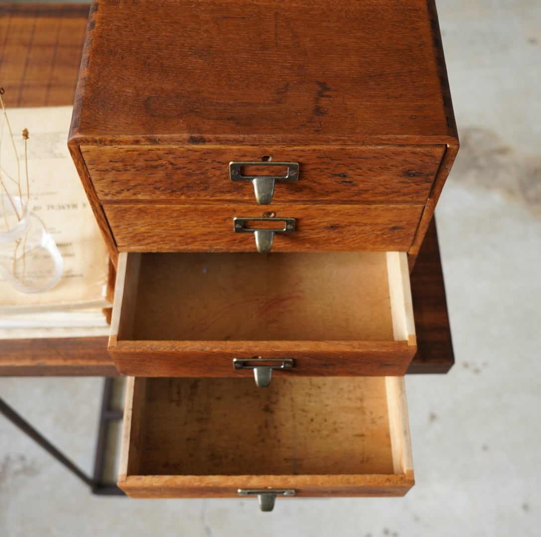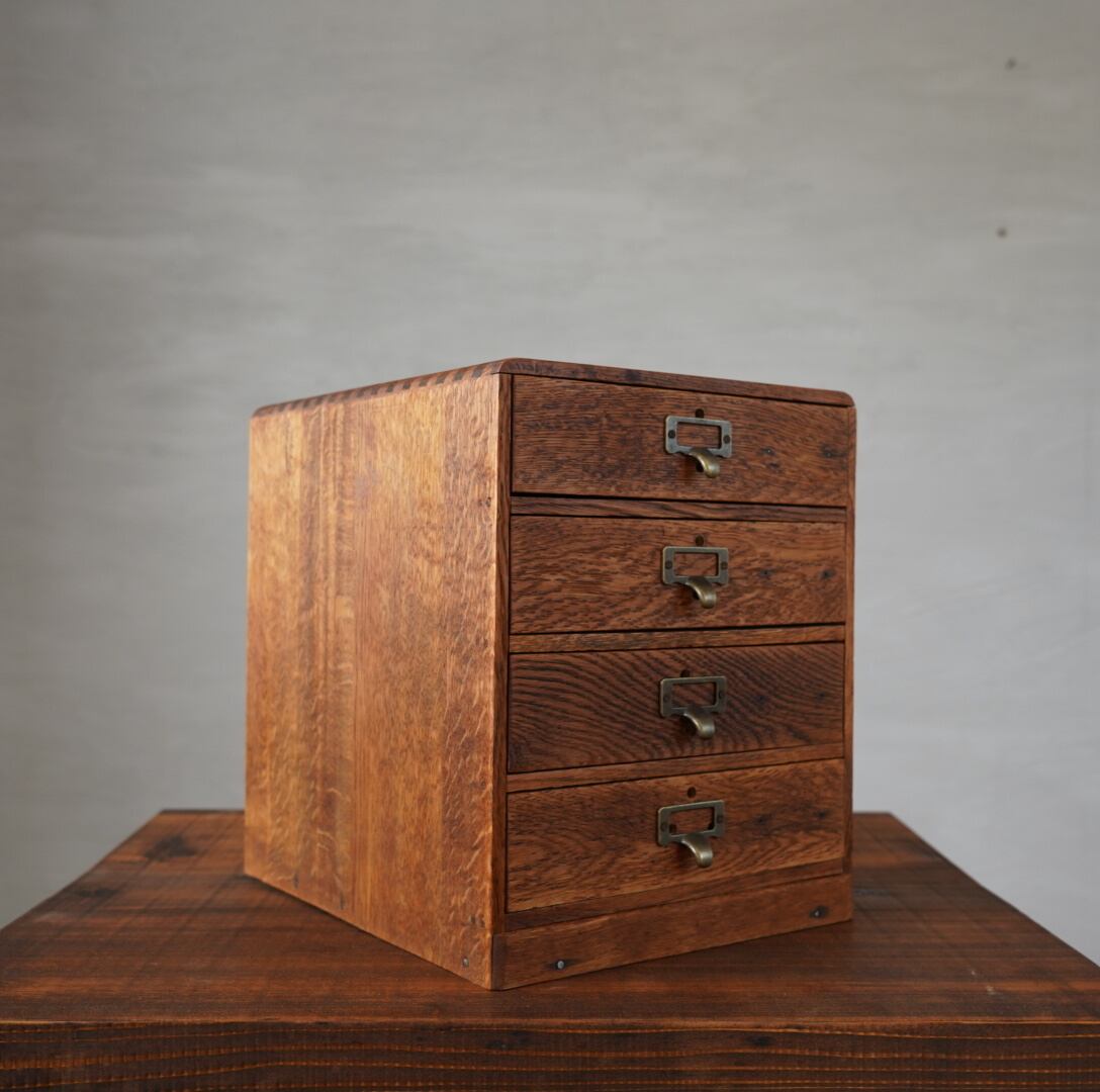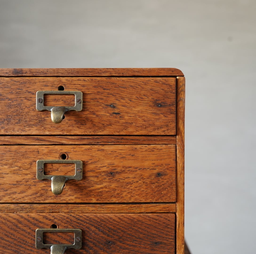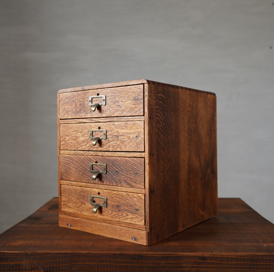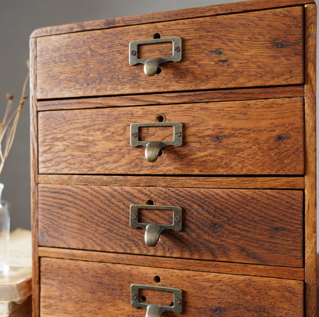 楢材の温かみのある木味と並んだ金属のネームプレートが可愛らしい4杯の引き出しです。