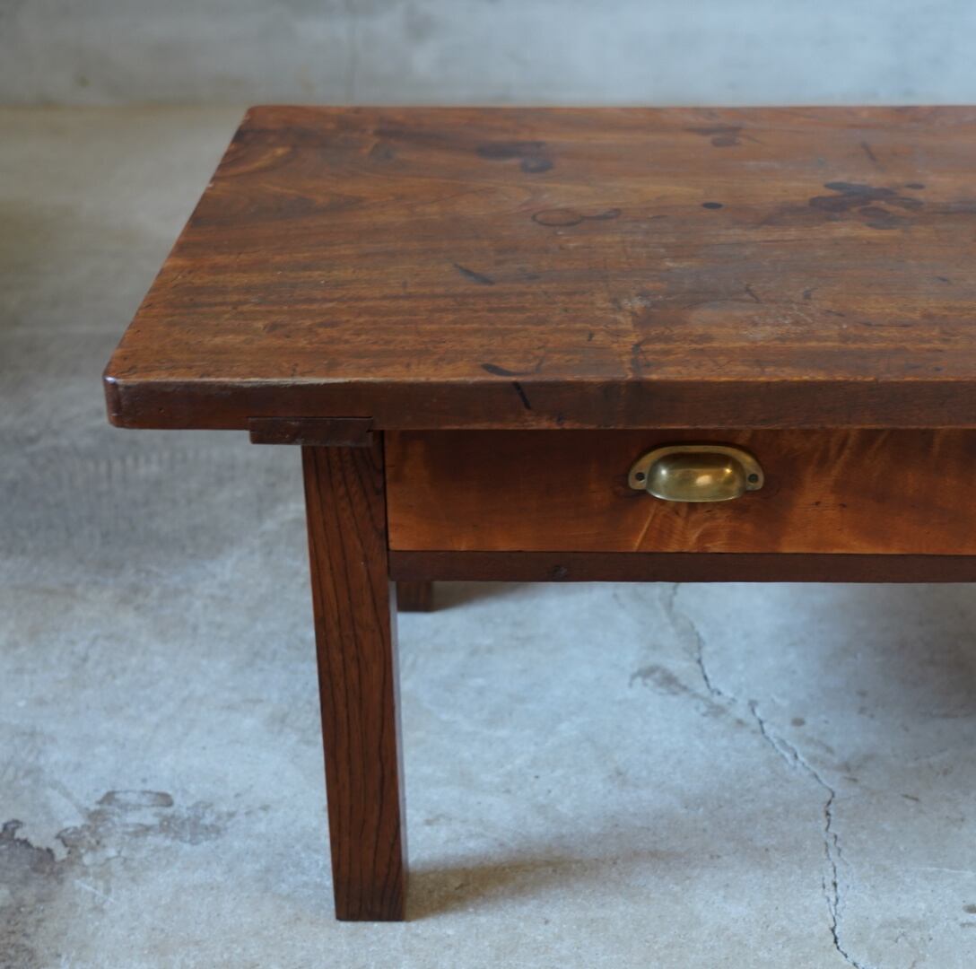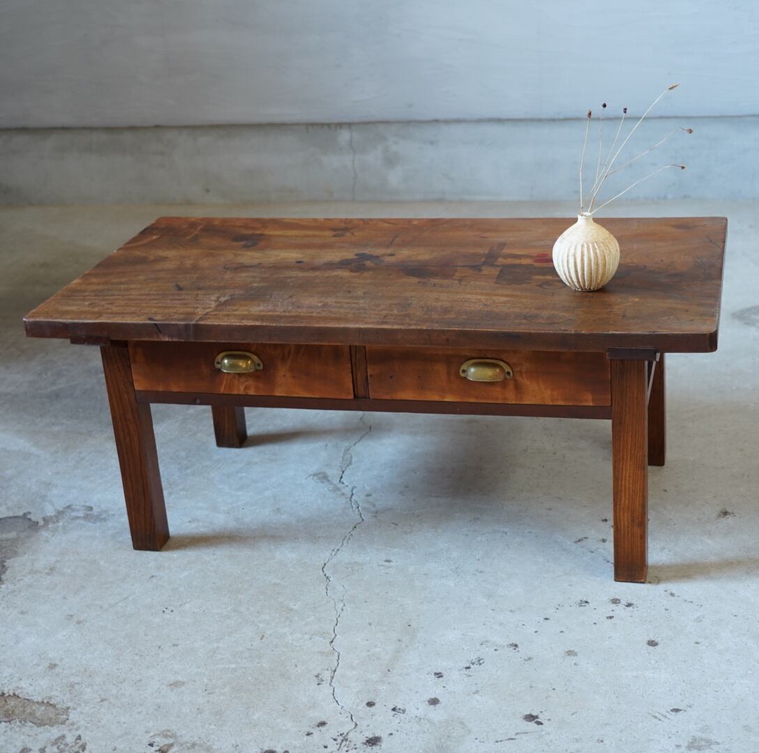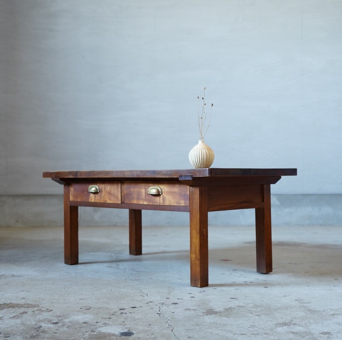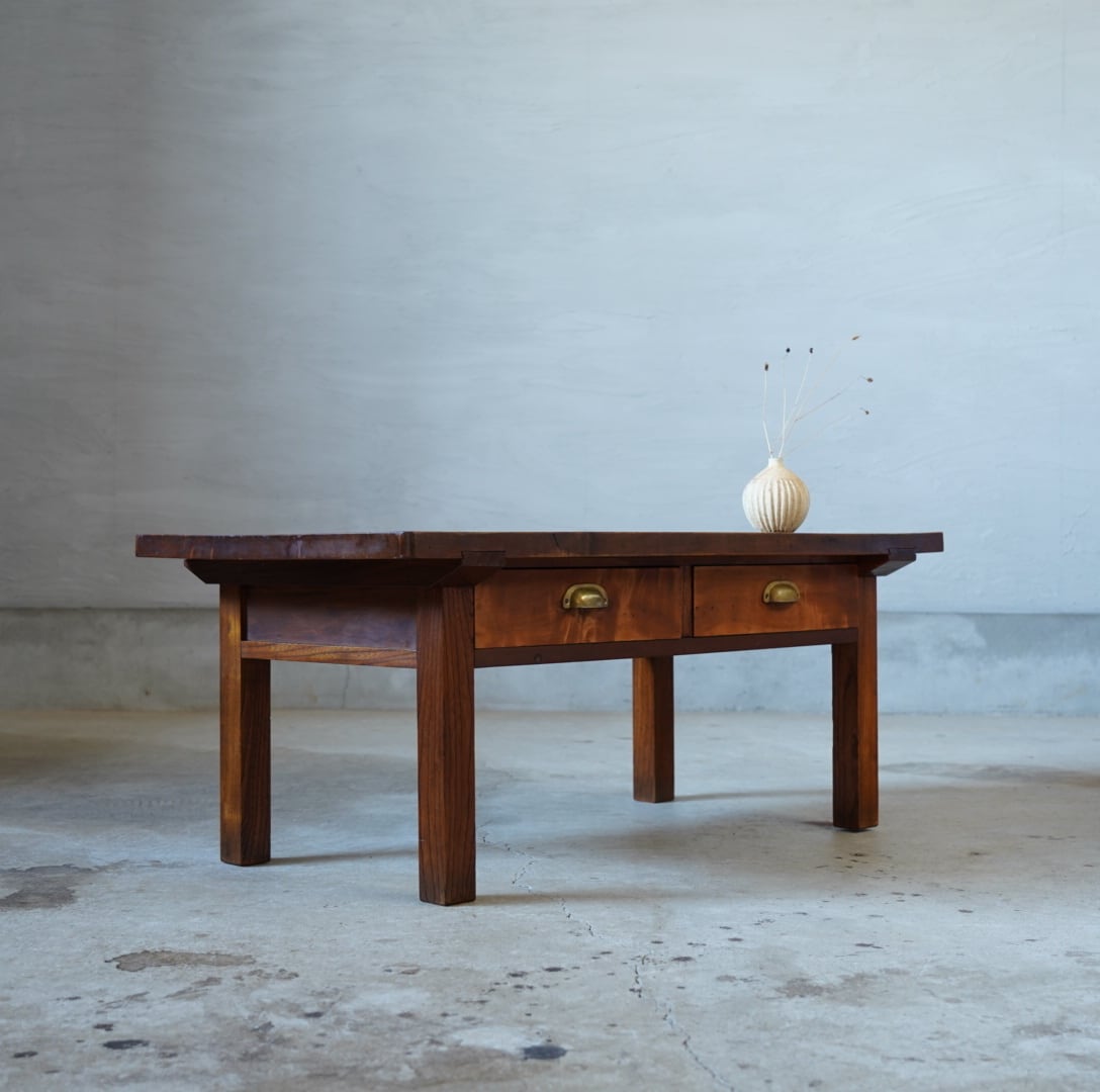 無垢材の温かみのある経年変化と真鍮取手の引き出しが美しいコーヒーテーブル。天板は厚い桜の木の一枚板です。