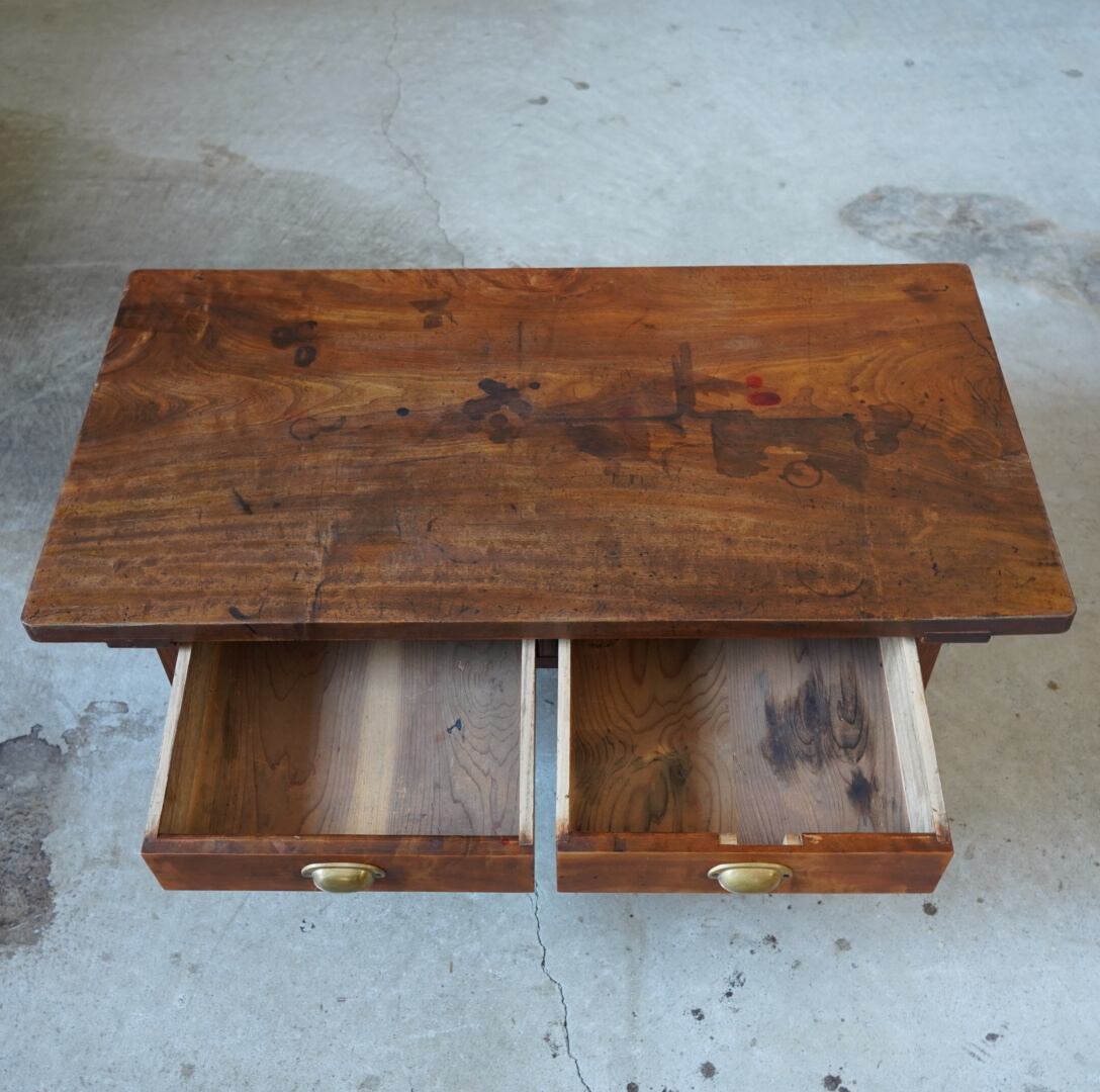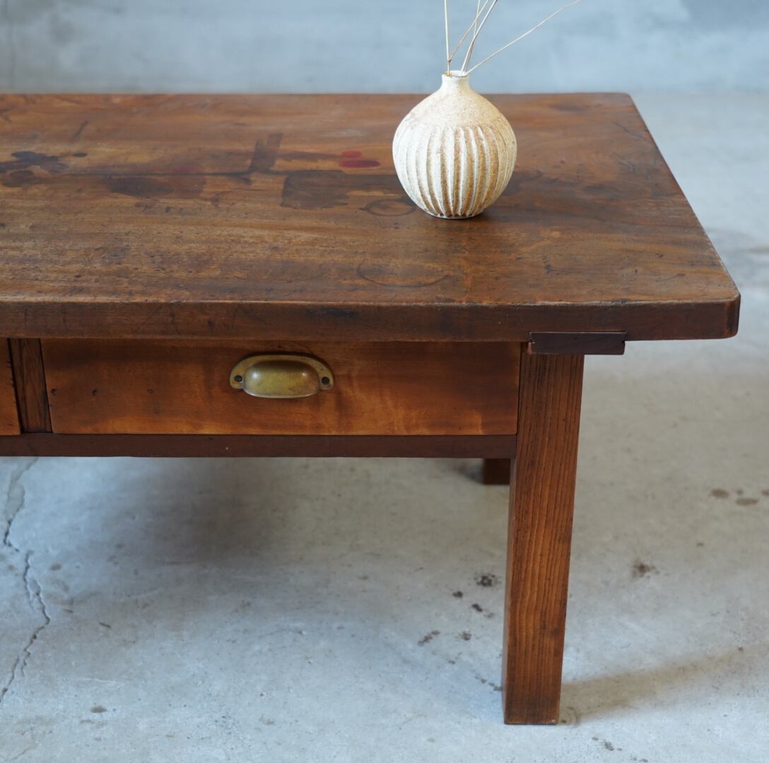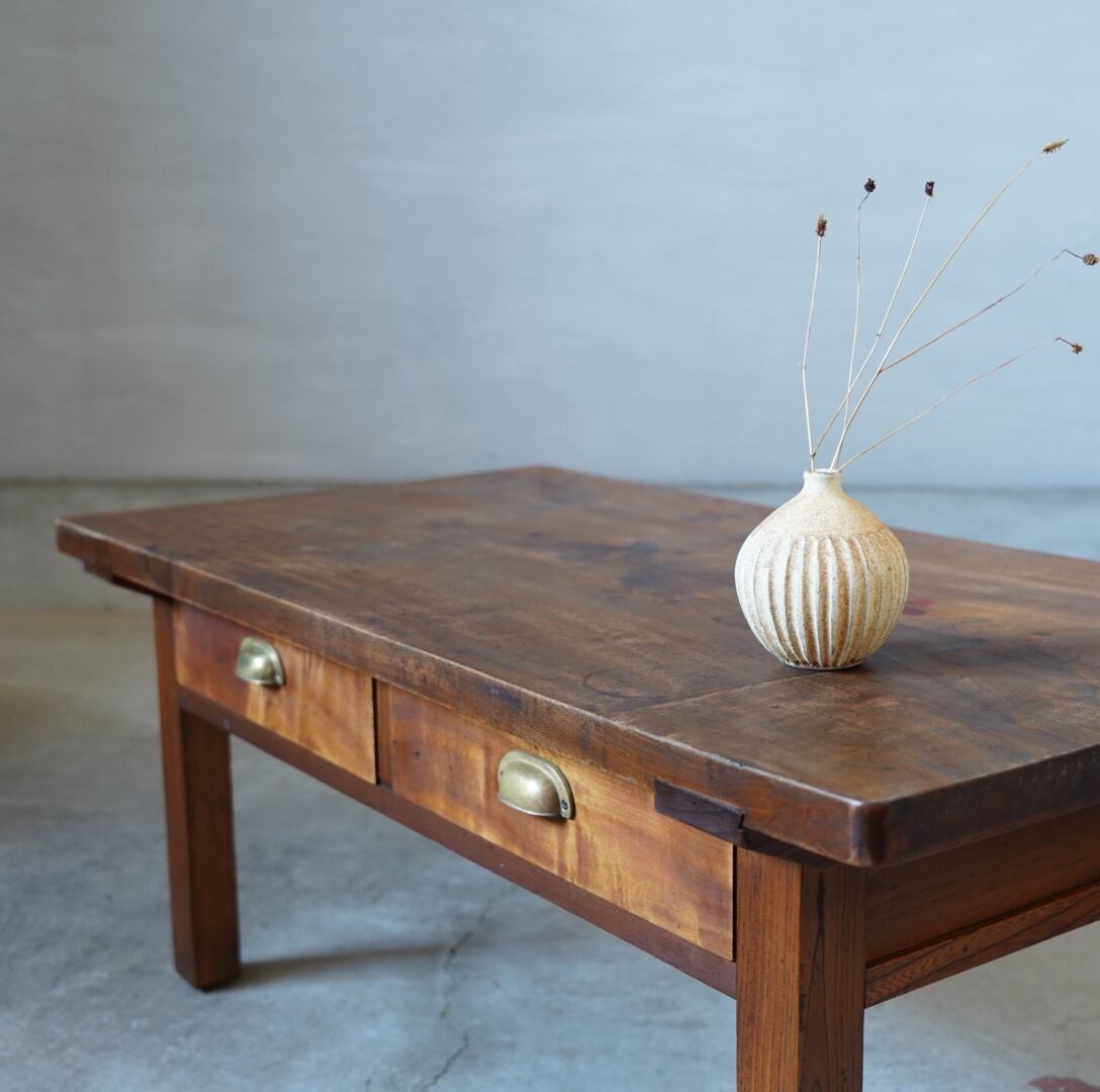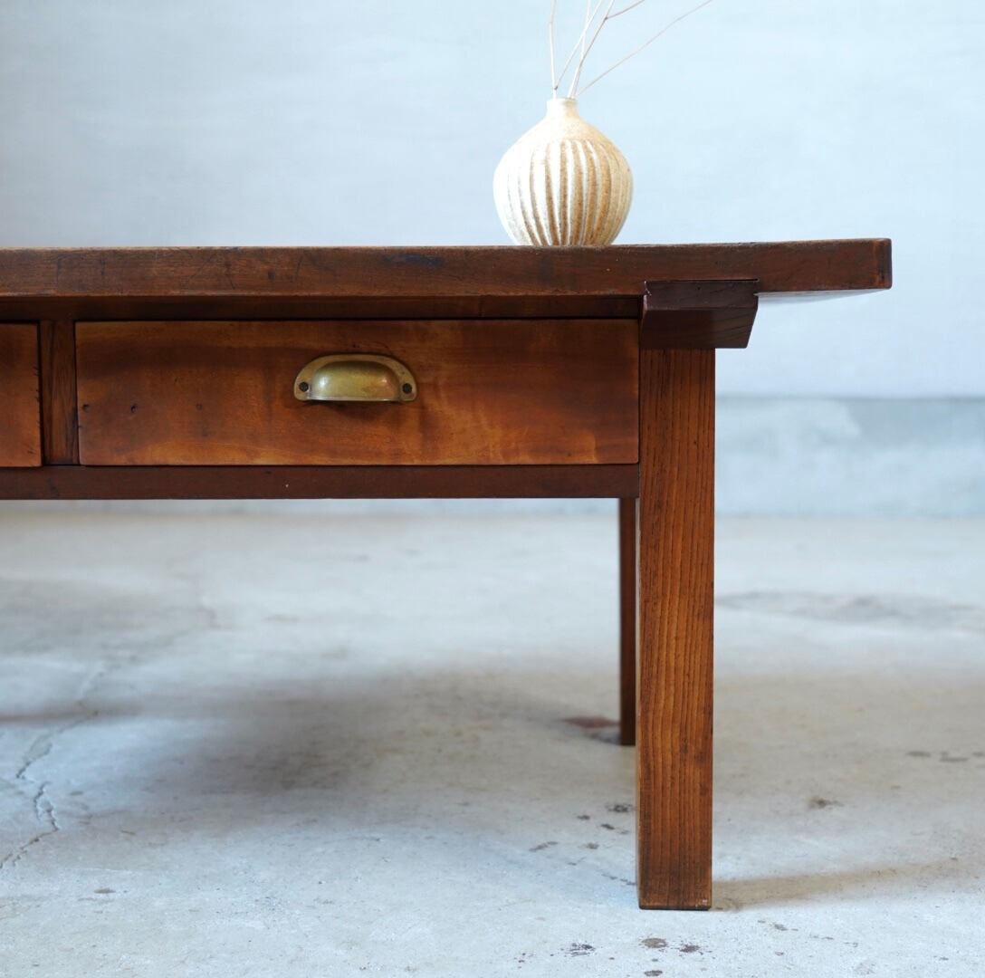 無垢材の温かみのある経年変化と真鍮取手の引き出しが美しいコーヒーテーブル。天板は厚い桜の木の一枚板です。