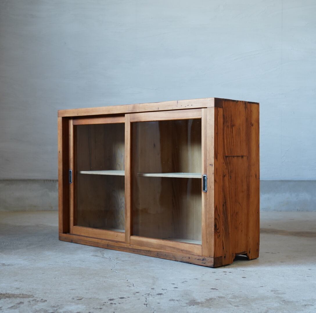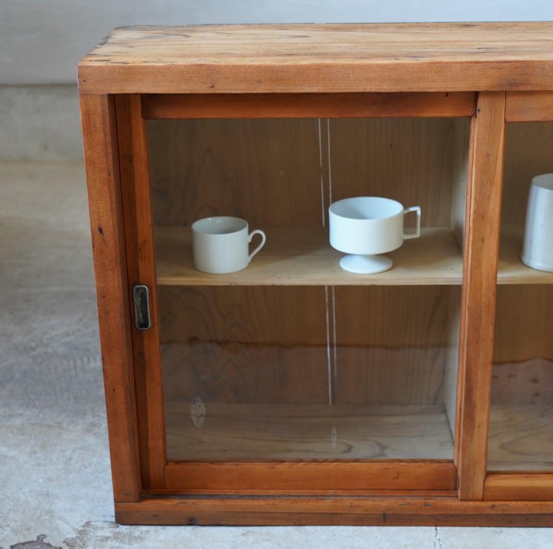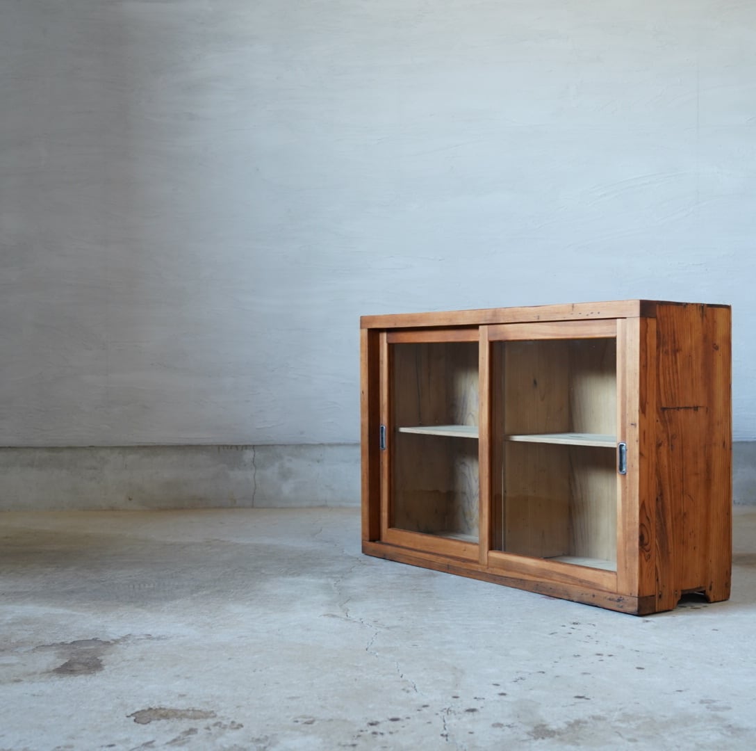 ナチュラルな木味と大きなゆらゆらガラスの引き違い戸が美しいキャビネットです。