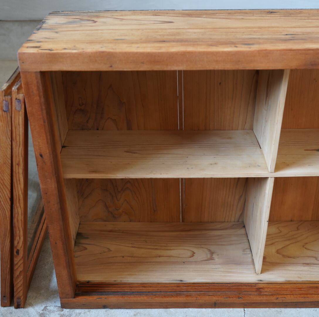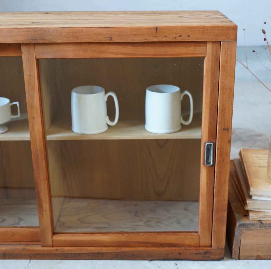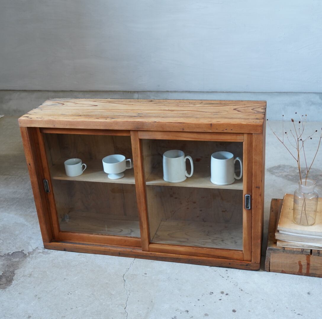 ナチュラルな木味と大きなゆらゆらガラスの引き違い戸が美しいキャビネットです。