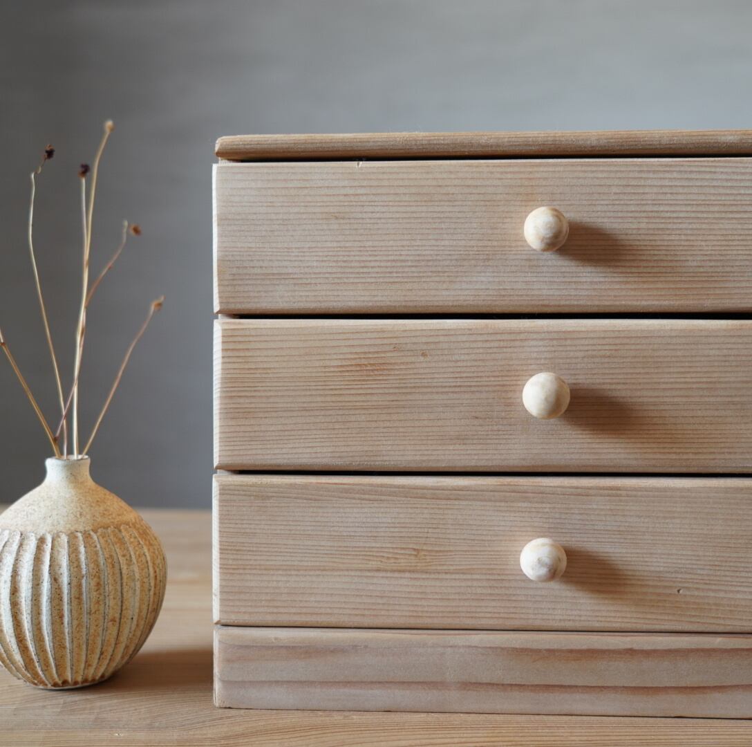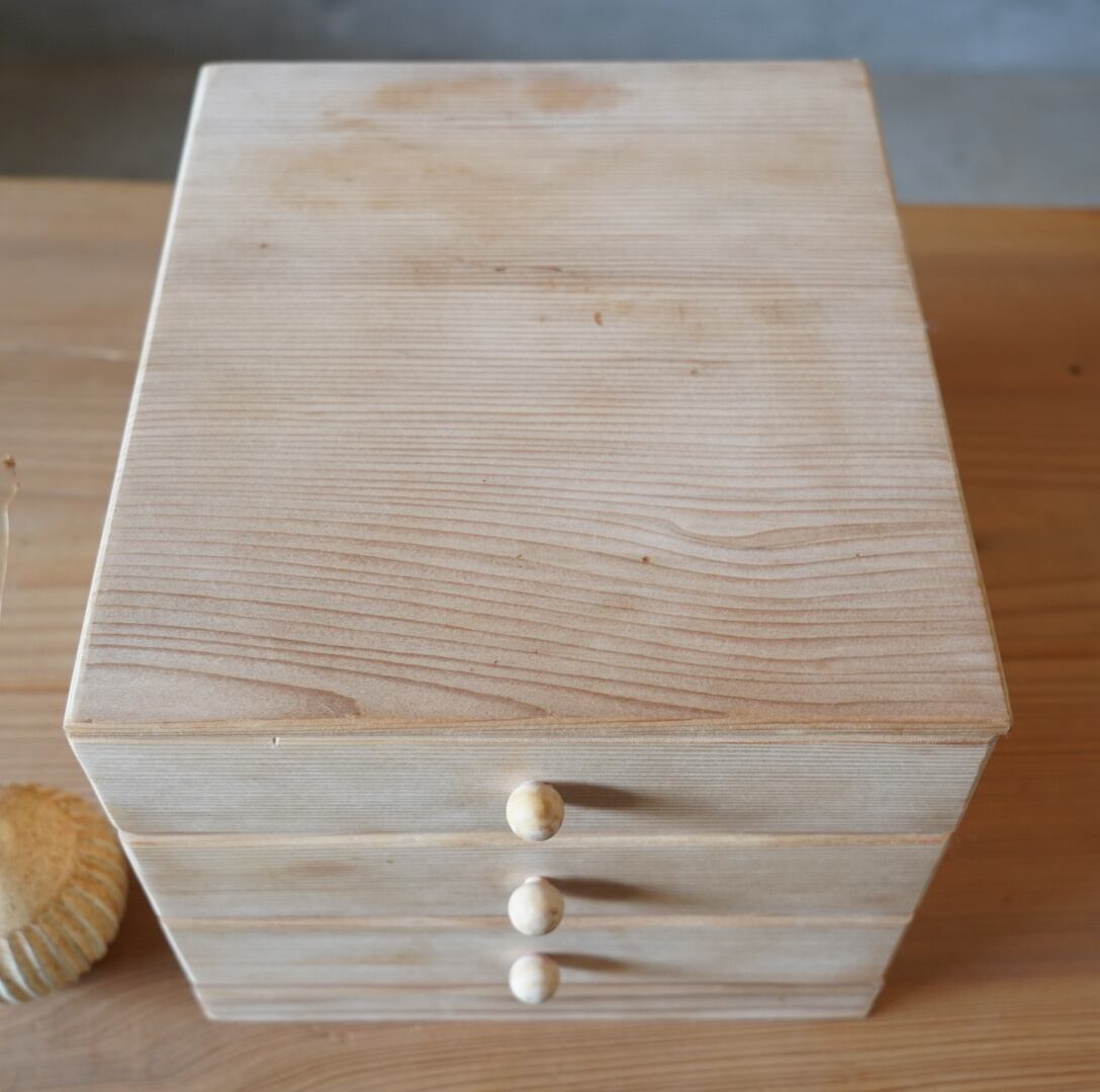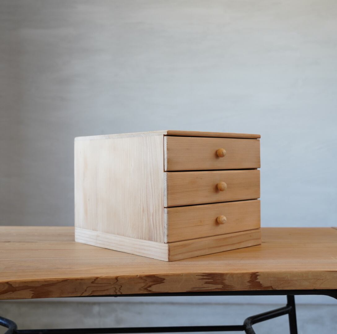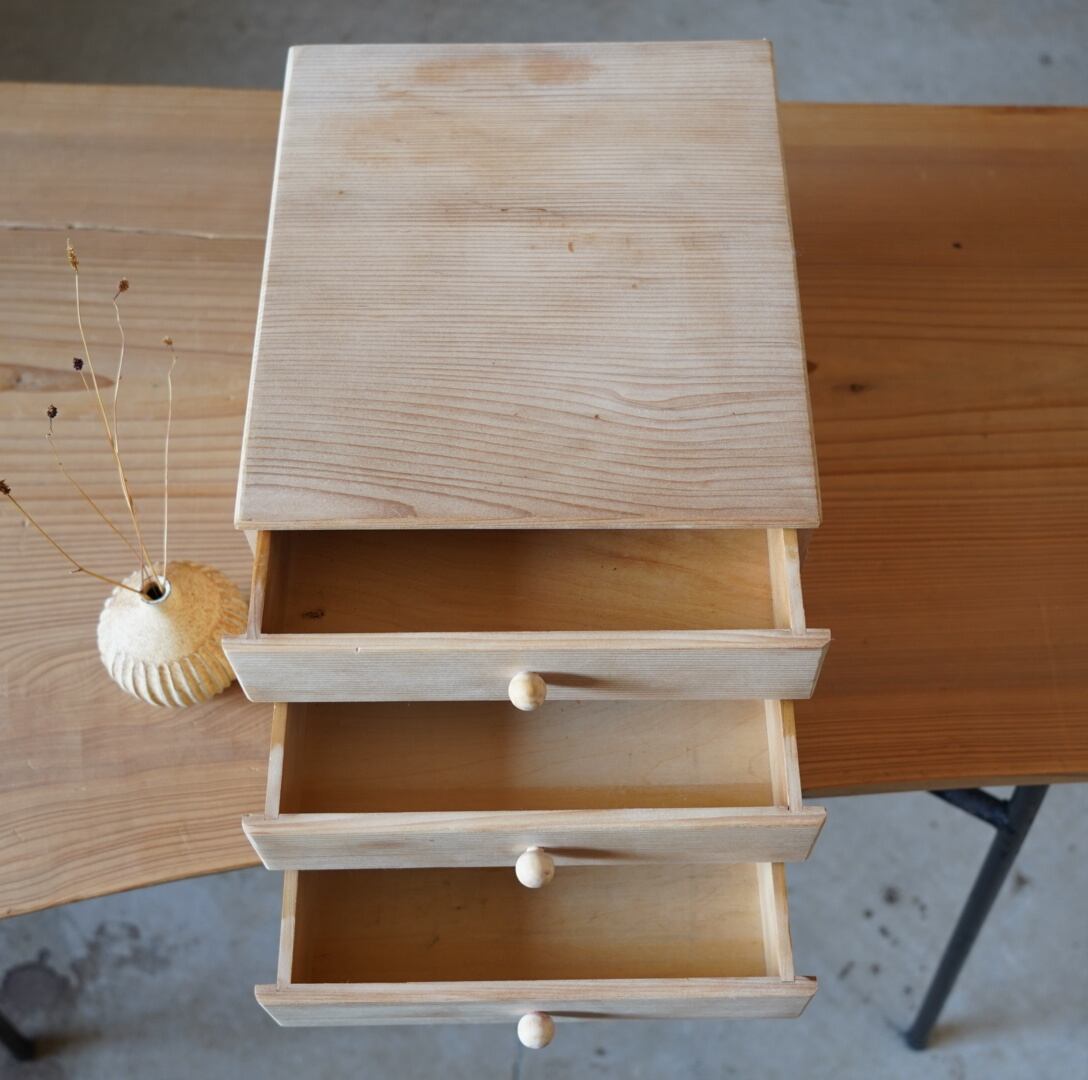 ナチュラルな木味とまるい木のつまみが可愛らしい3杯の引き出し。