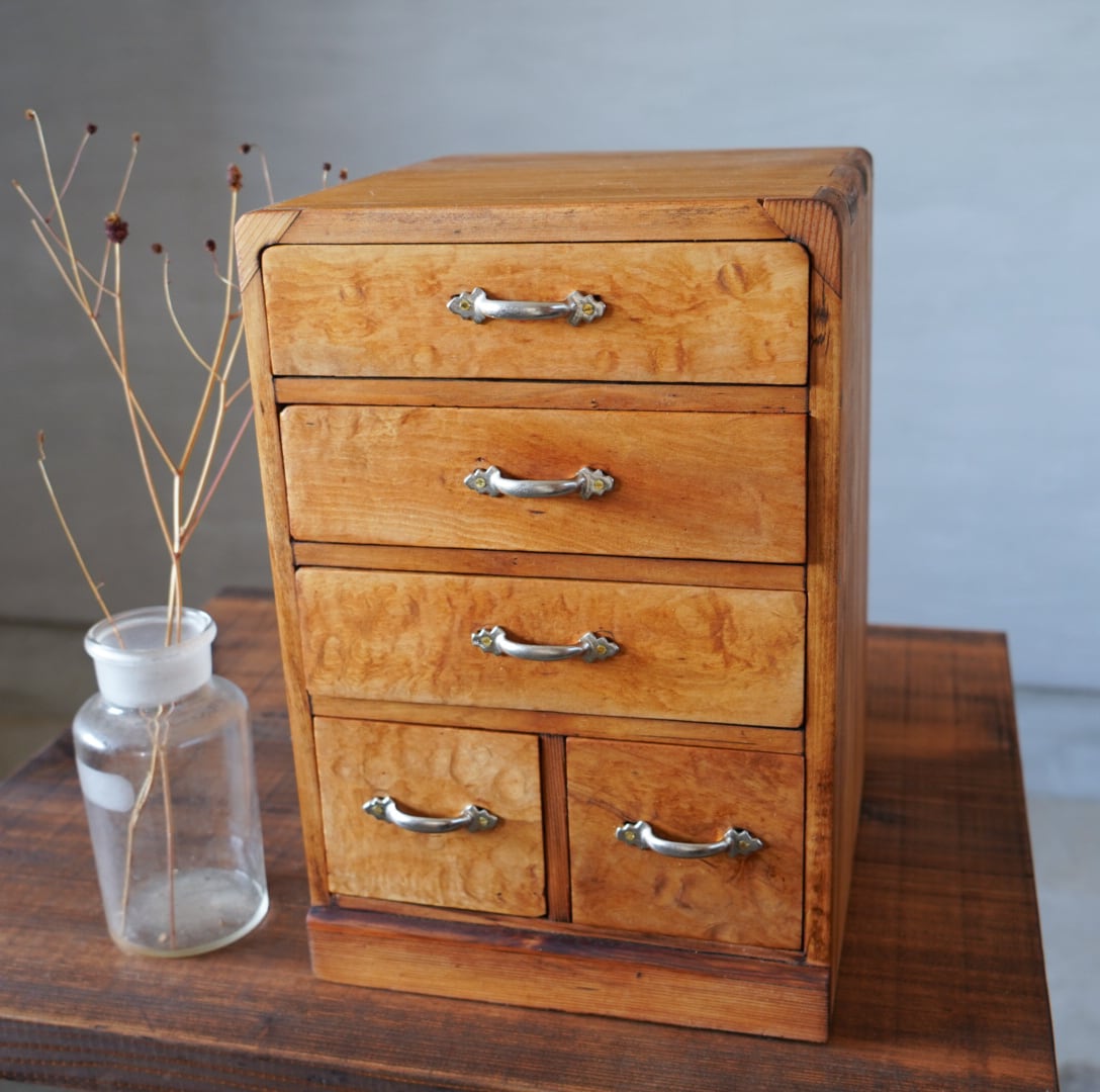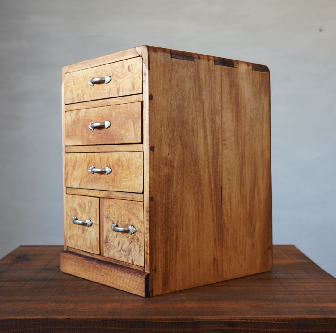 温かみのある経年変化と金属取手が魅力的な古い5杯の引き出しです。