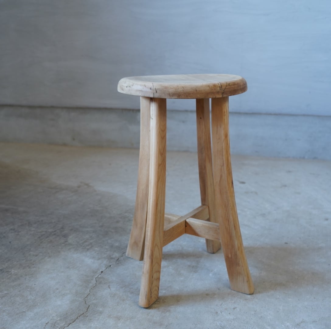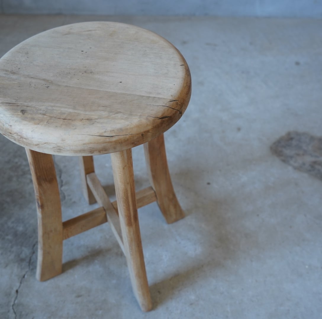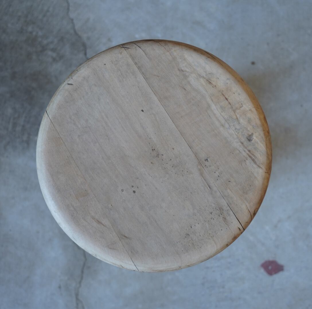 古い無垢材のナチュラルな木味と滑らかな丸座面が美しいスツールです。