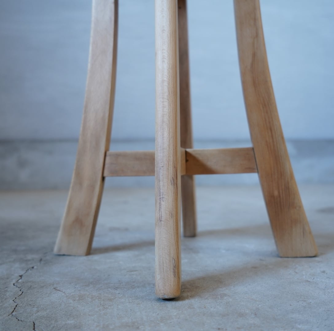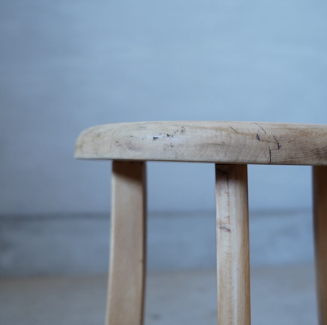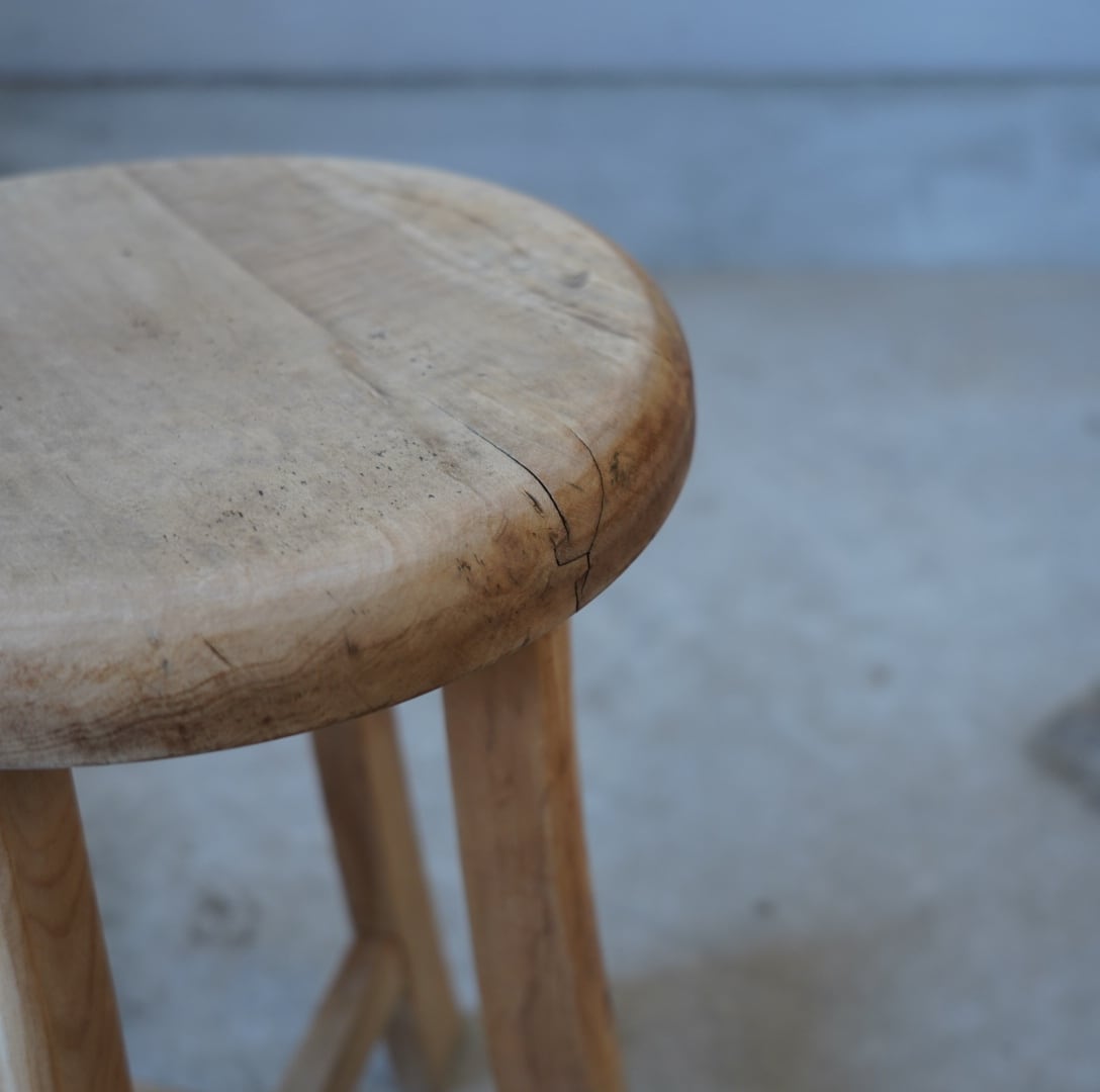 古い無垢材のナチュラルな木味と滑らかな丸座面が美しいスツールです。