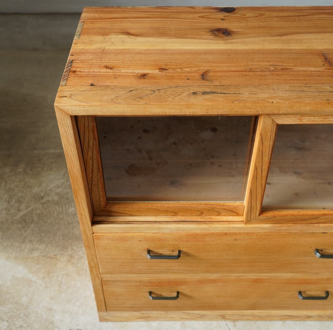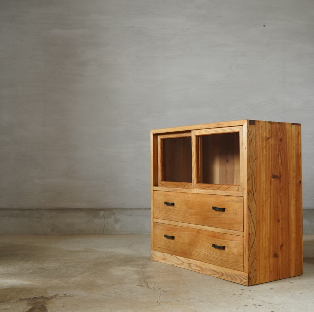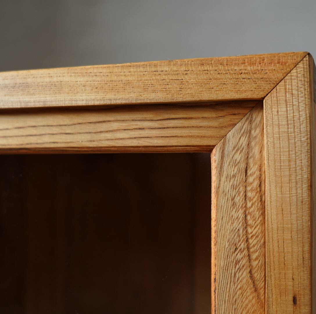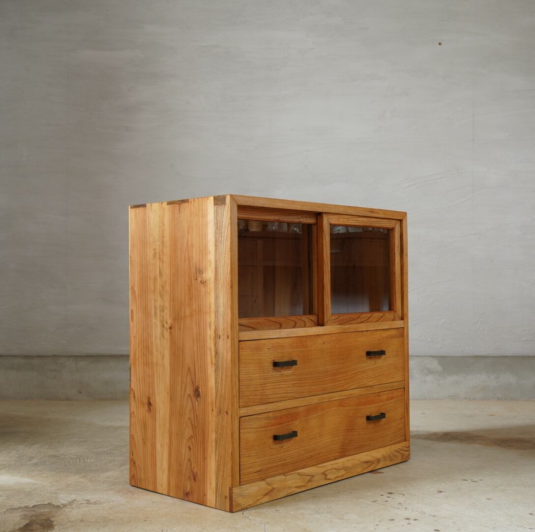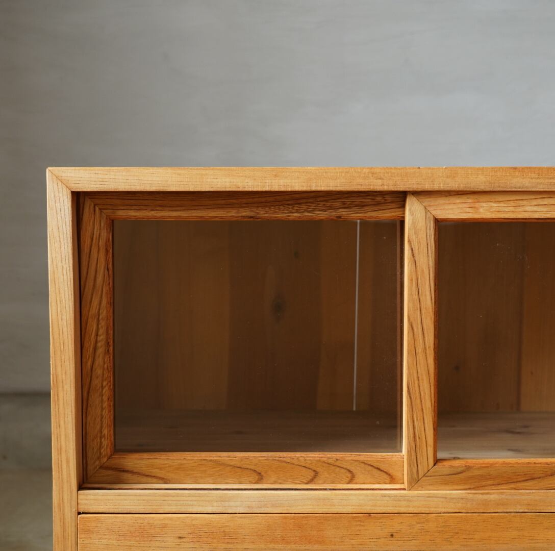 無垢材のナチュラルな木味とすっきりとしたガラスの引き戸が美しい戸棚です。
