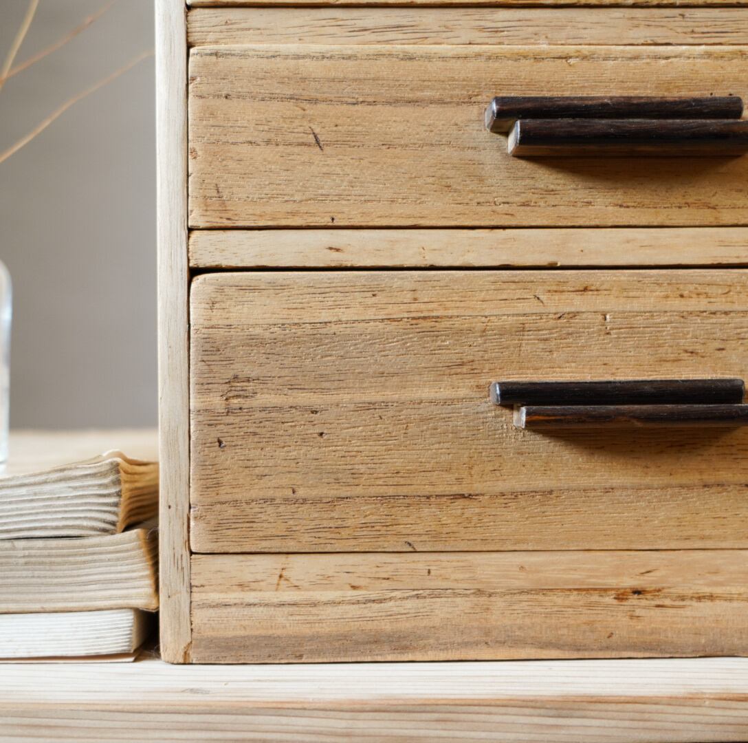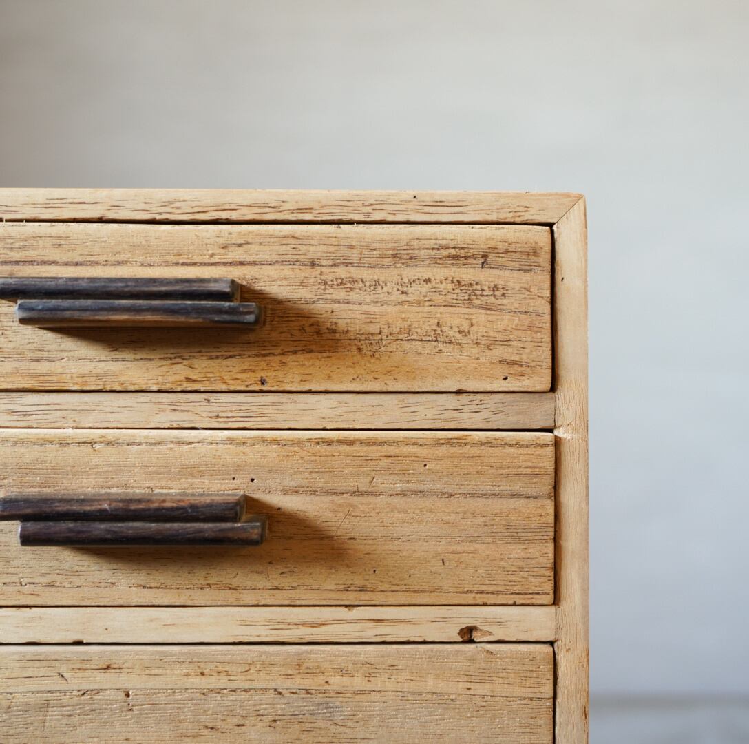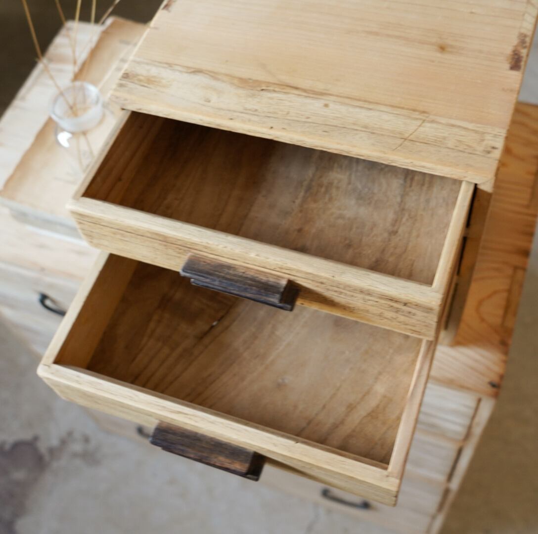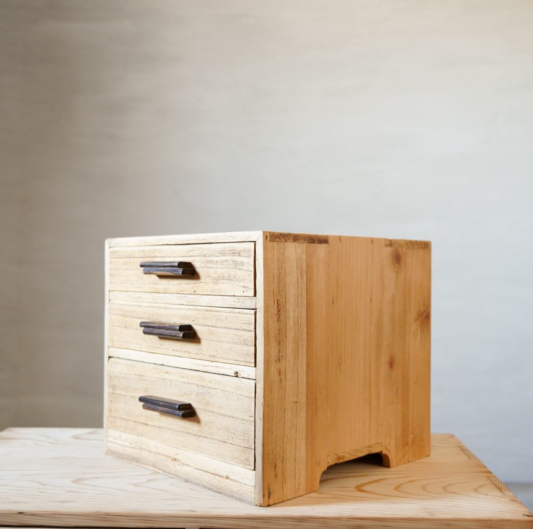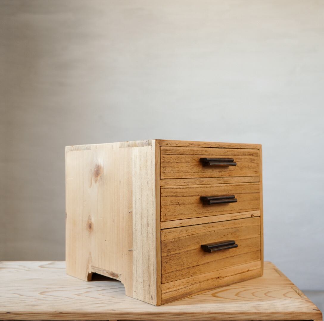 素朴な雰囲気と木の取手が魅力的古い3杯の引き出しです。
